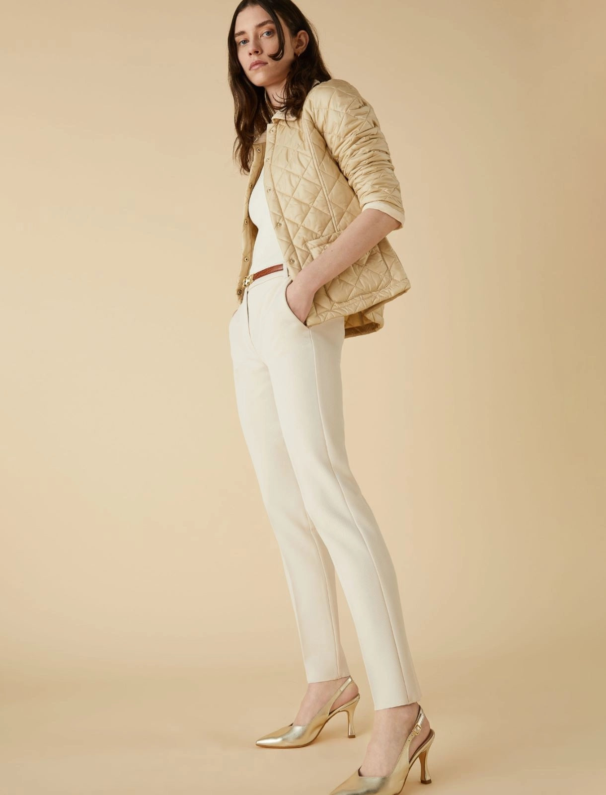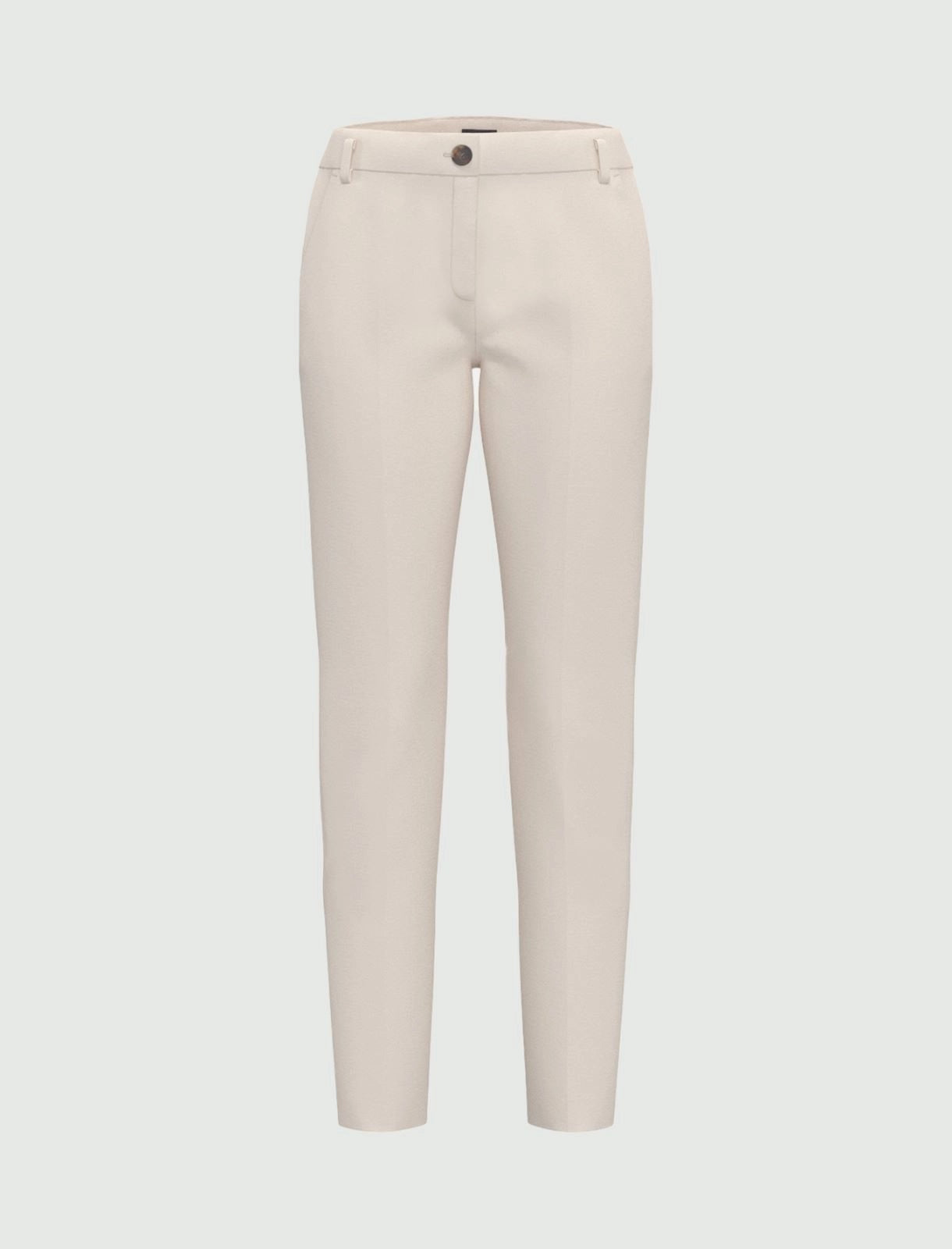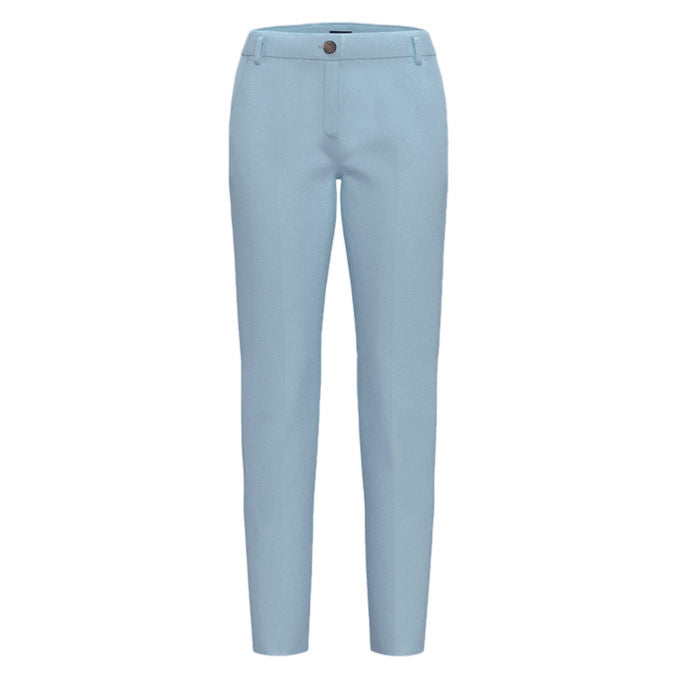 Pantaloni con piega stirata fronte e retro. Sono realizzati in tessuto tecnico dalla linea slim, presentano chiusura con bottone e zip nascosta, tasche alla francese davanti, a filetto dietro.