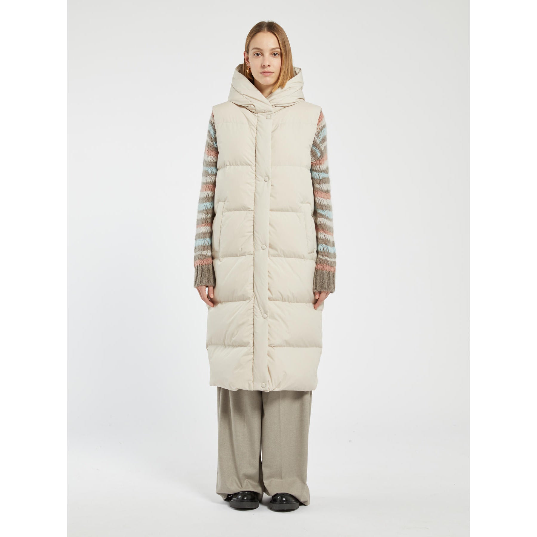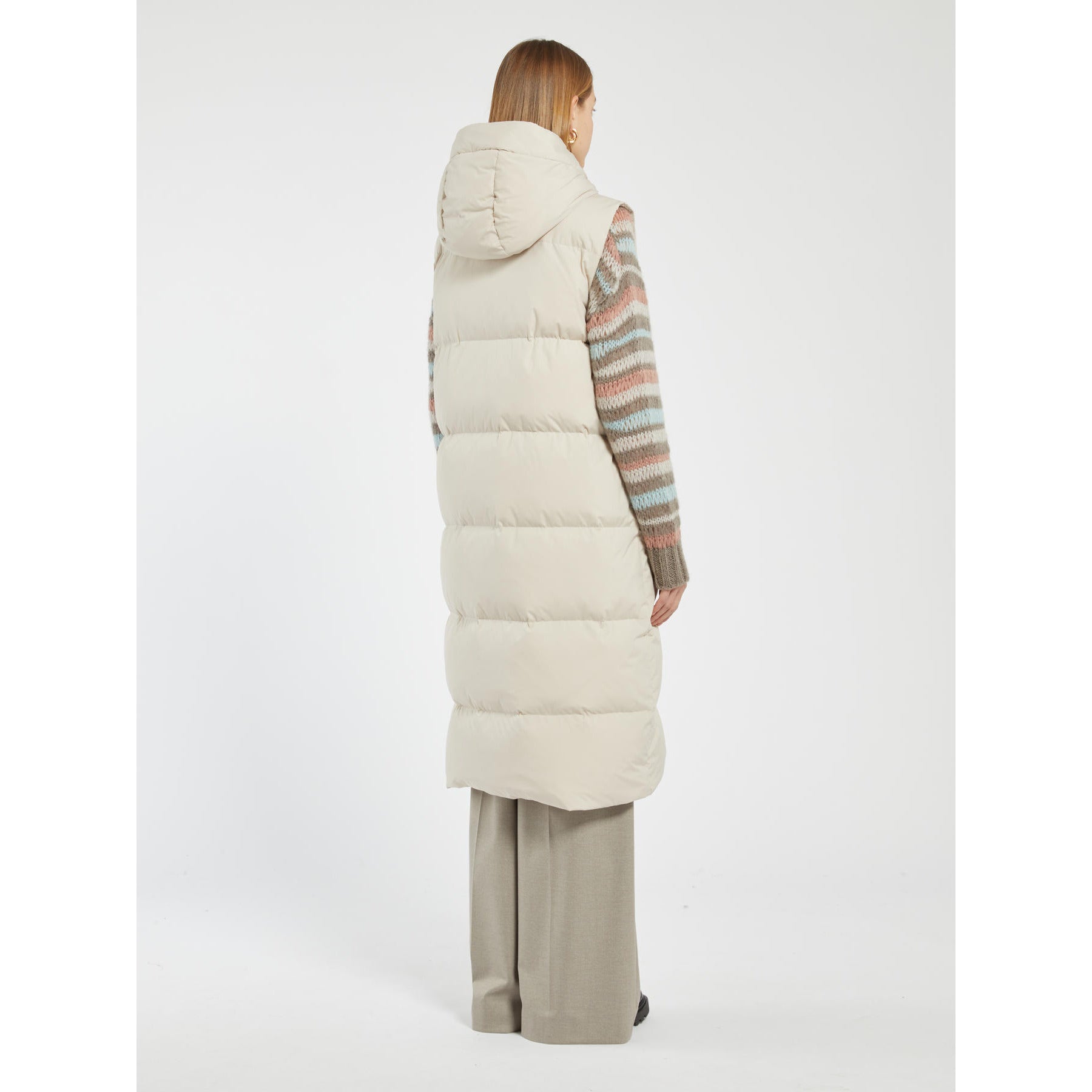 Gilet lungo in tela antigoccia imbottito in piumino, foderato e chiuso con zip nascosta e bottoni a pressione. Linea dritta. Collo con cappuccio e tasche a filetto.