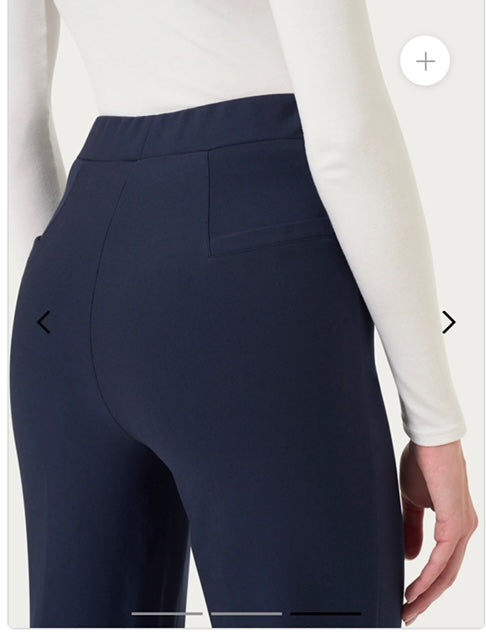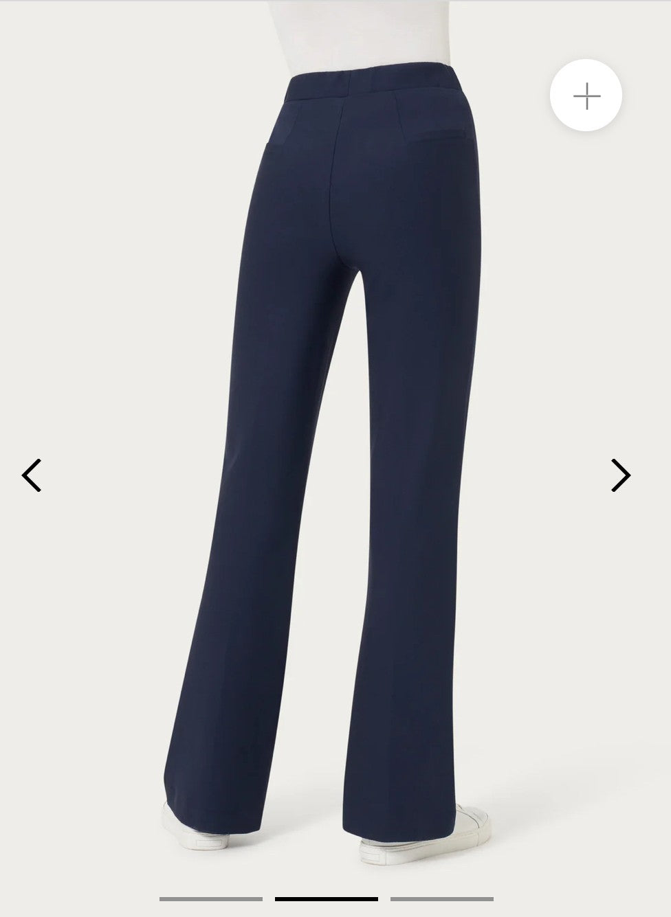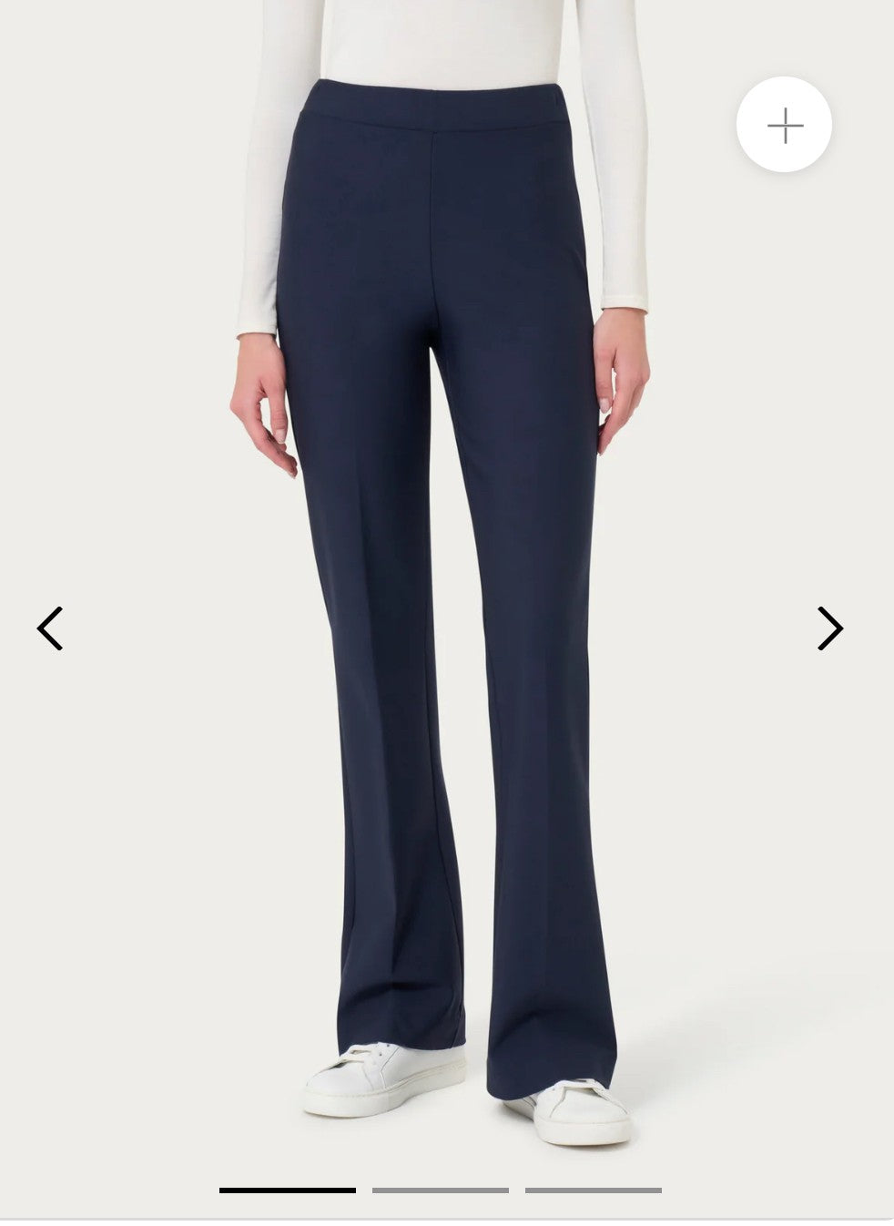 Il pantalone ha la linea flare , le tasche oblique e il bustino con i passanti. E realizzato in tessuto tricot punto milano , molto confortevole