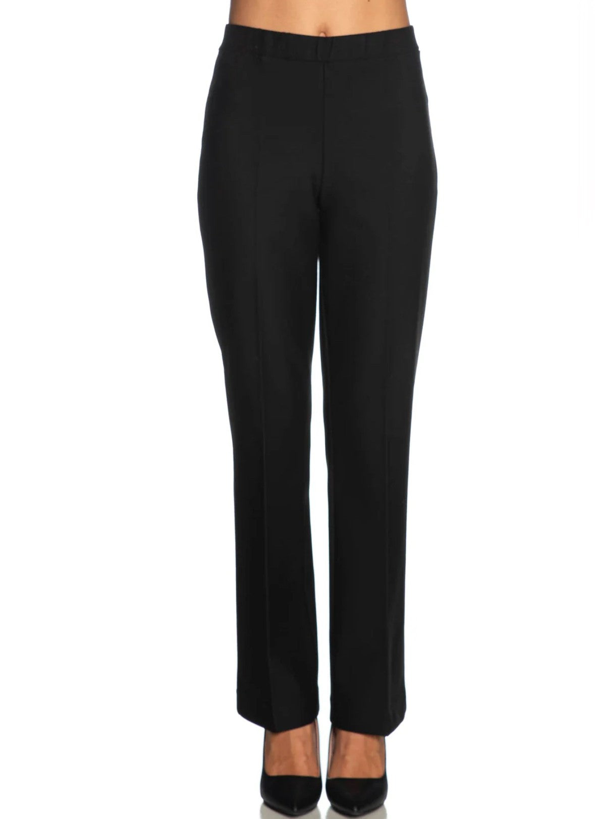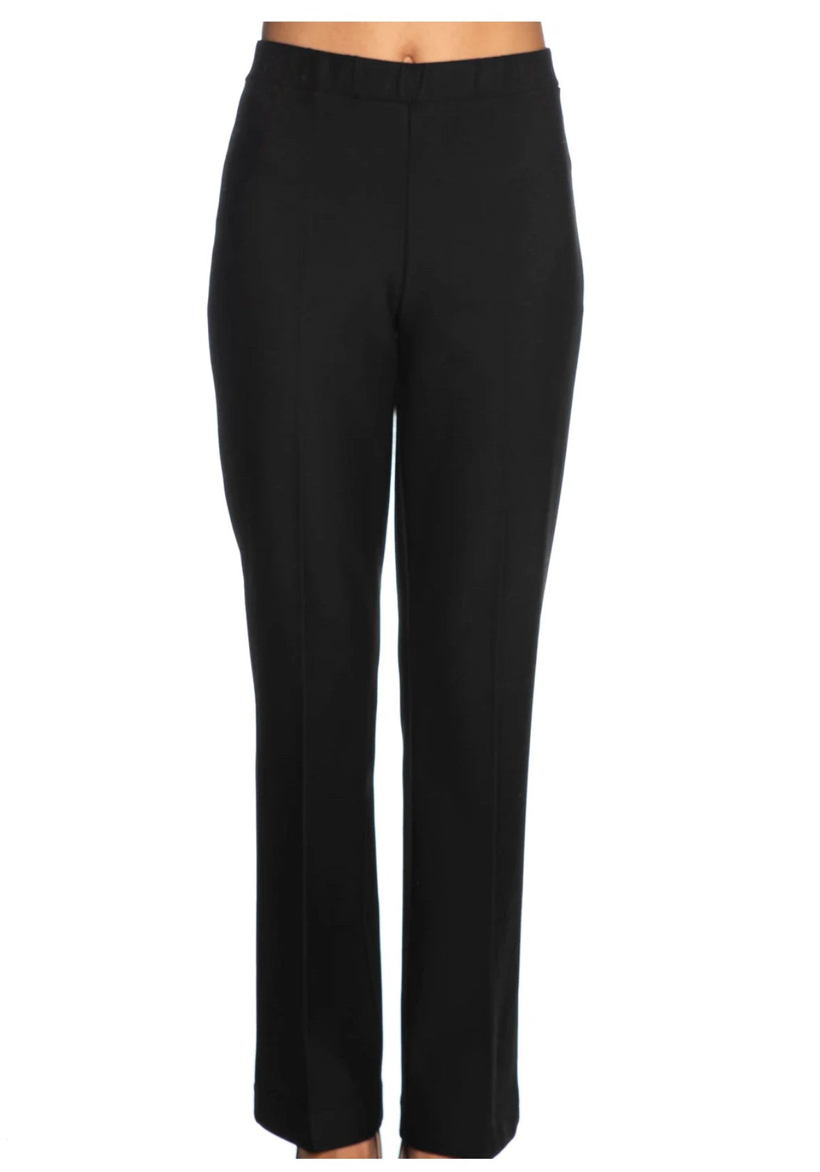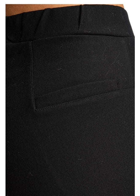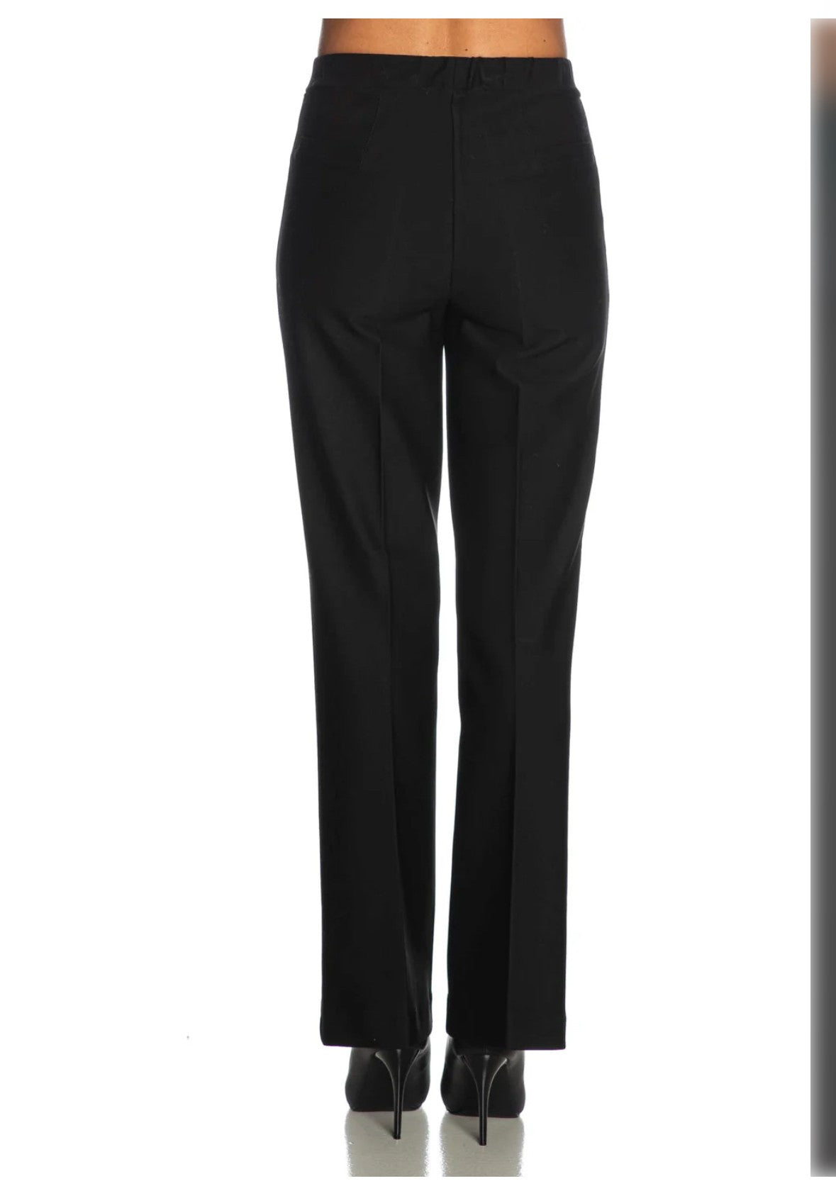 Il pantalone ha la linea flare , le tasche oblique e il bustino con i passanti. E realizzato in tessuto tricot punto milano , molto confortevole