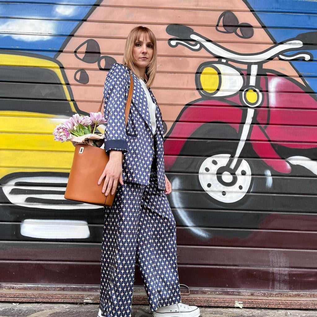 Pantaloni in twill a fantasia con piping laterale in crêpe, linea ampia. Chiusura con bottone e zip nascosta, tasche alla francese davanti. Piega stirata fronte e retro.