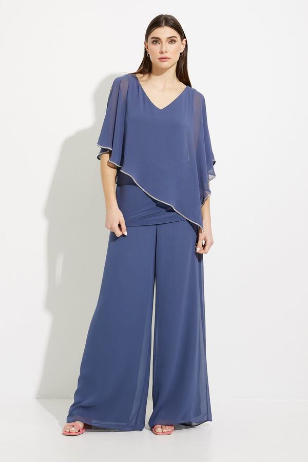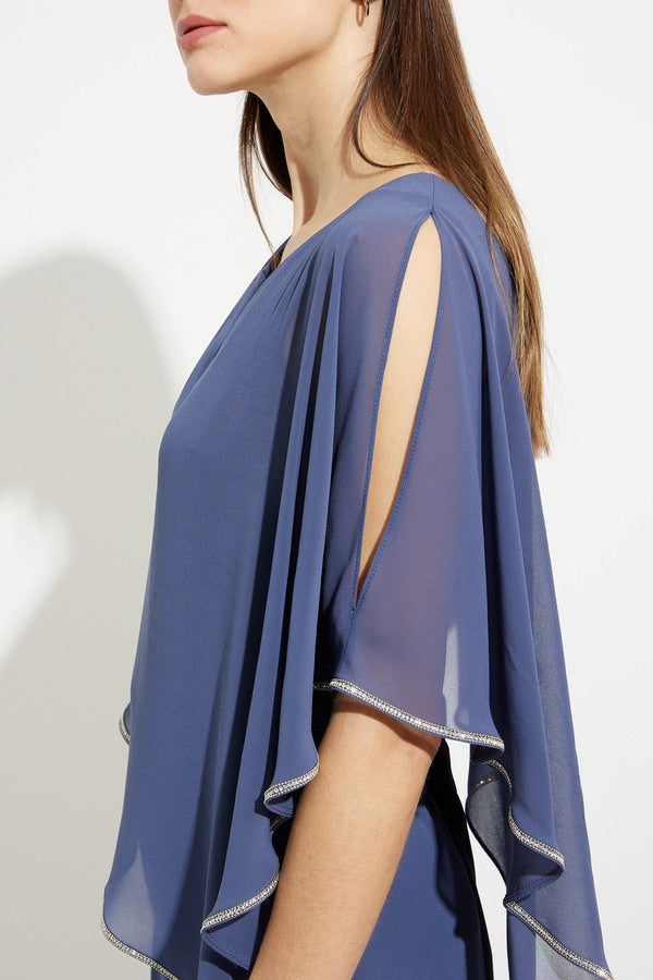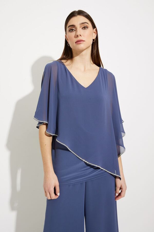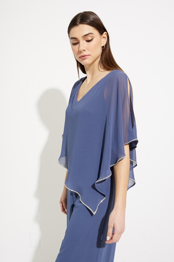 Una tunica a poncho caratterizzata da una mantella asimmetrica in chiffon con strass sull orlo. Questo splendido top presenta un elegante scollo a V e spacchi sulle maniche.