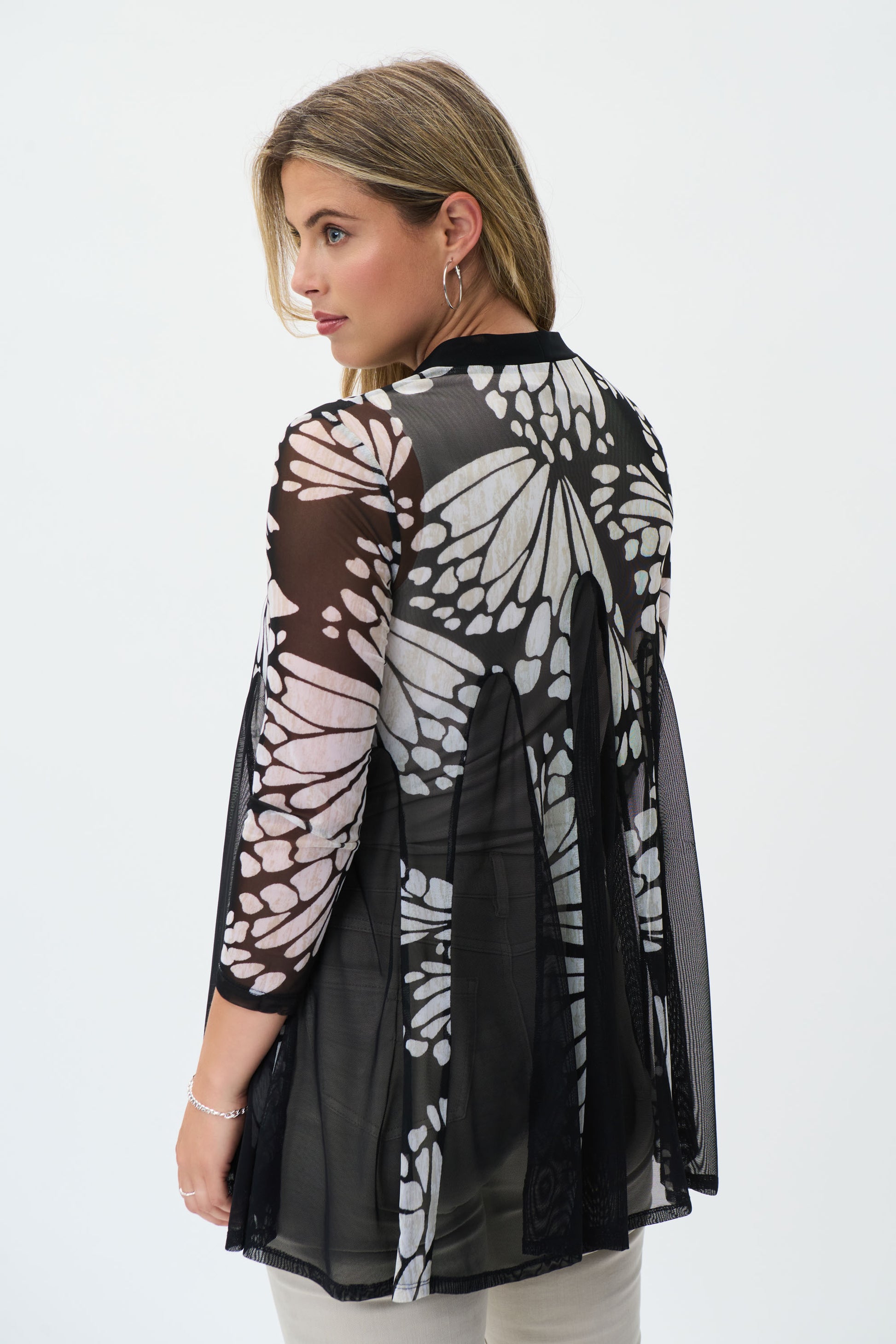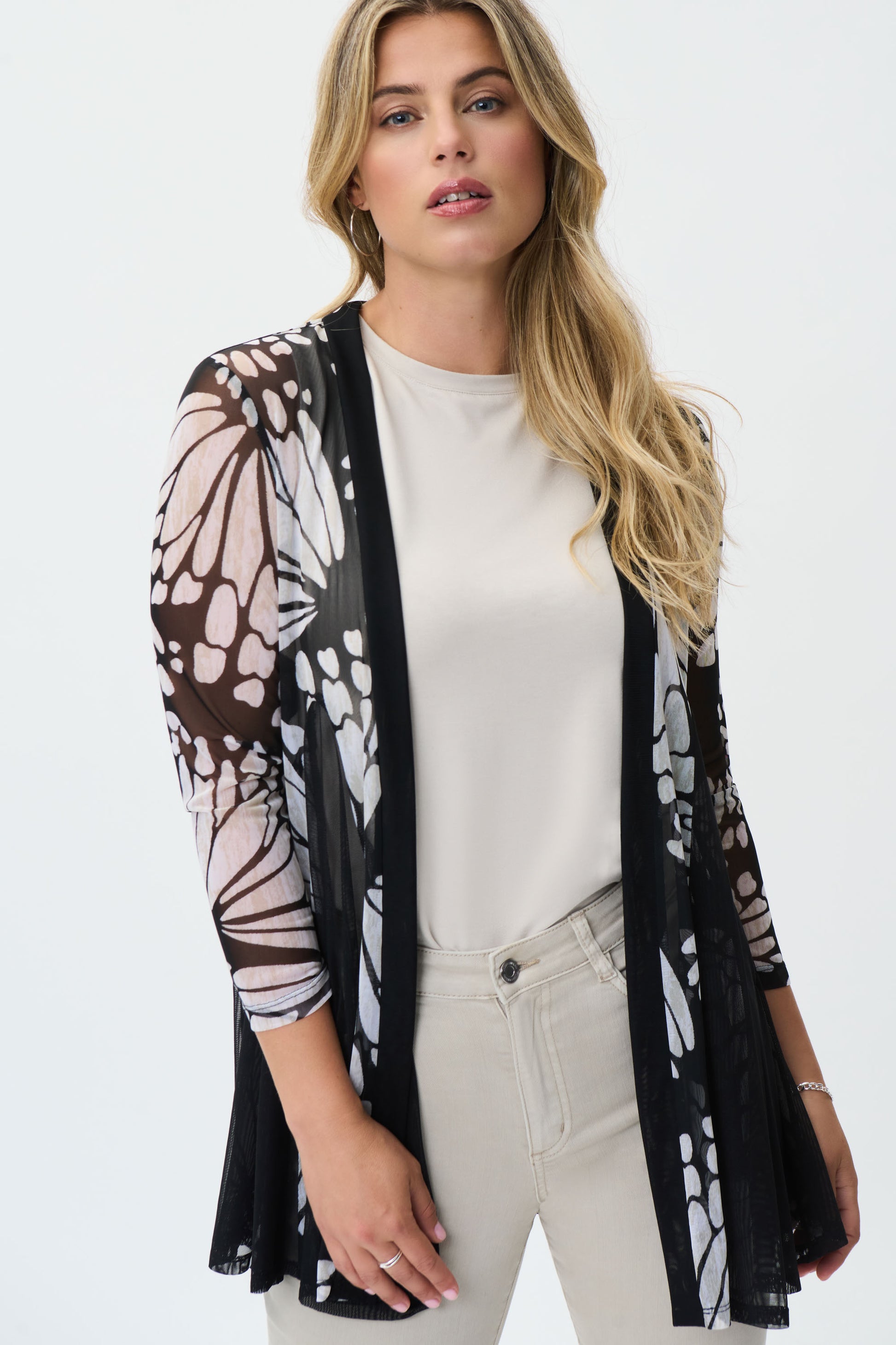 Soprabito leggero e arioso che completerà qualsiasi outfit, questo modello aperto presenta una stampa astratta, un collo sciallato e maniche a tre quarti. La graziosa stampa a farfalla ricorda le calde serate primaverili e il taglio svasato rende il capo informale.