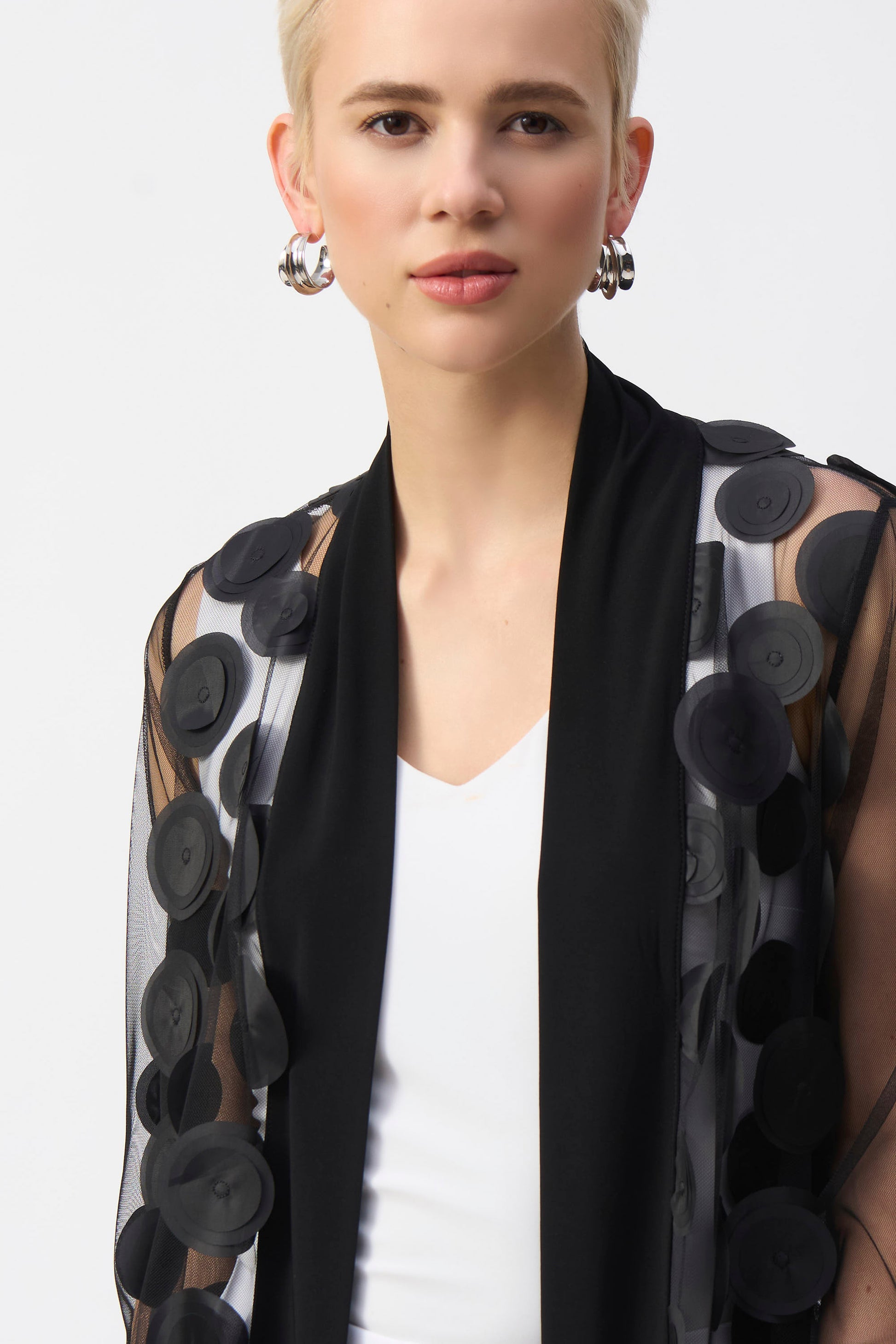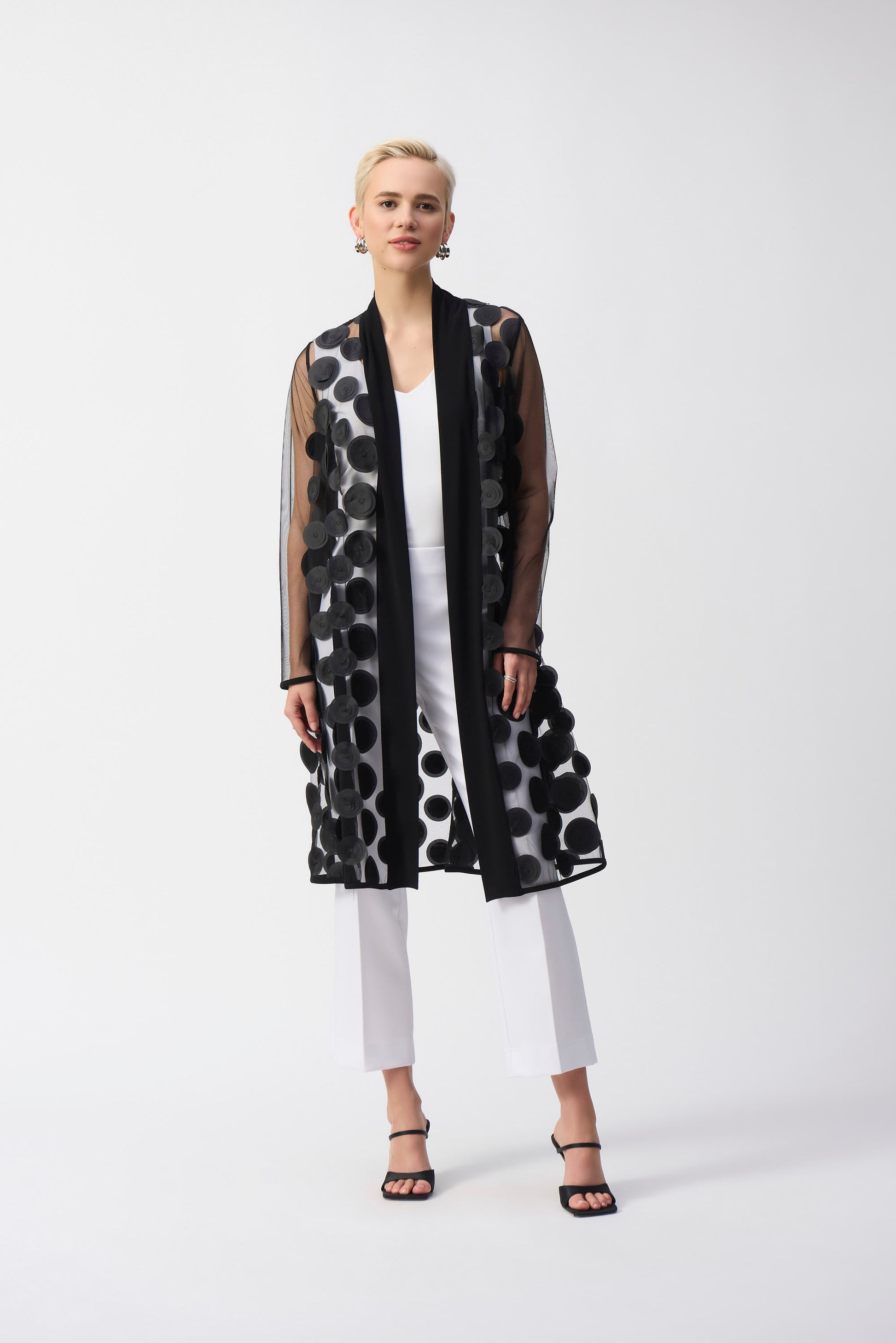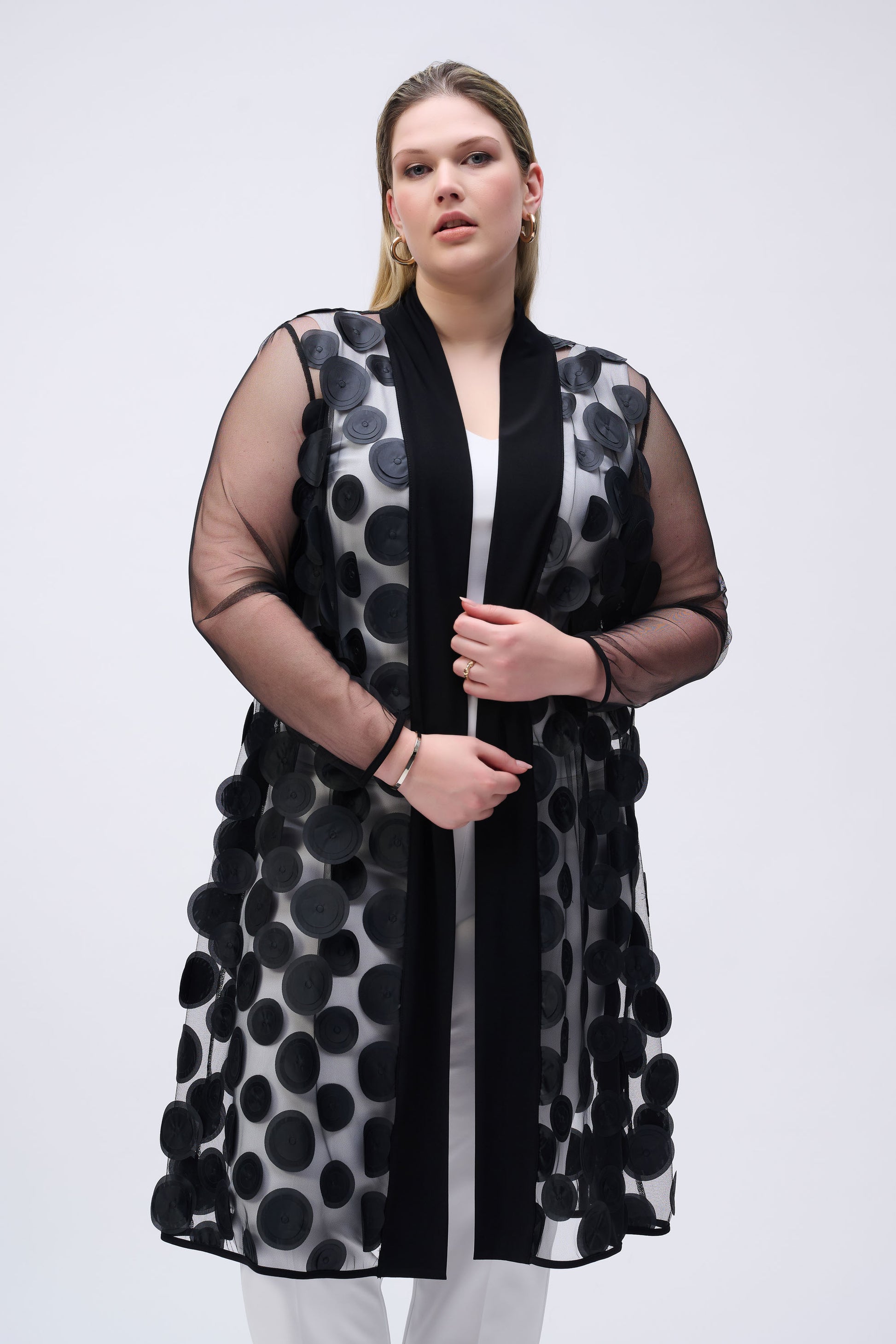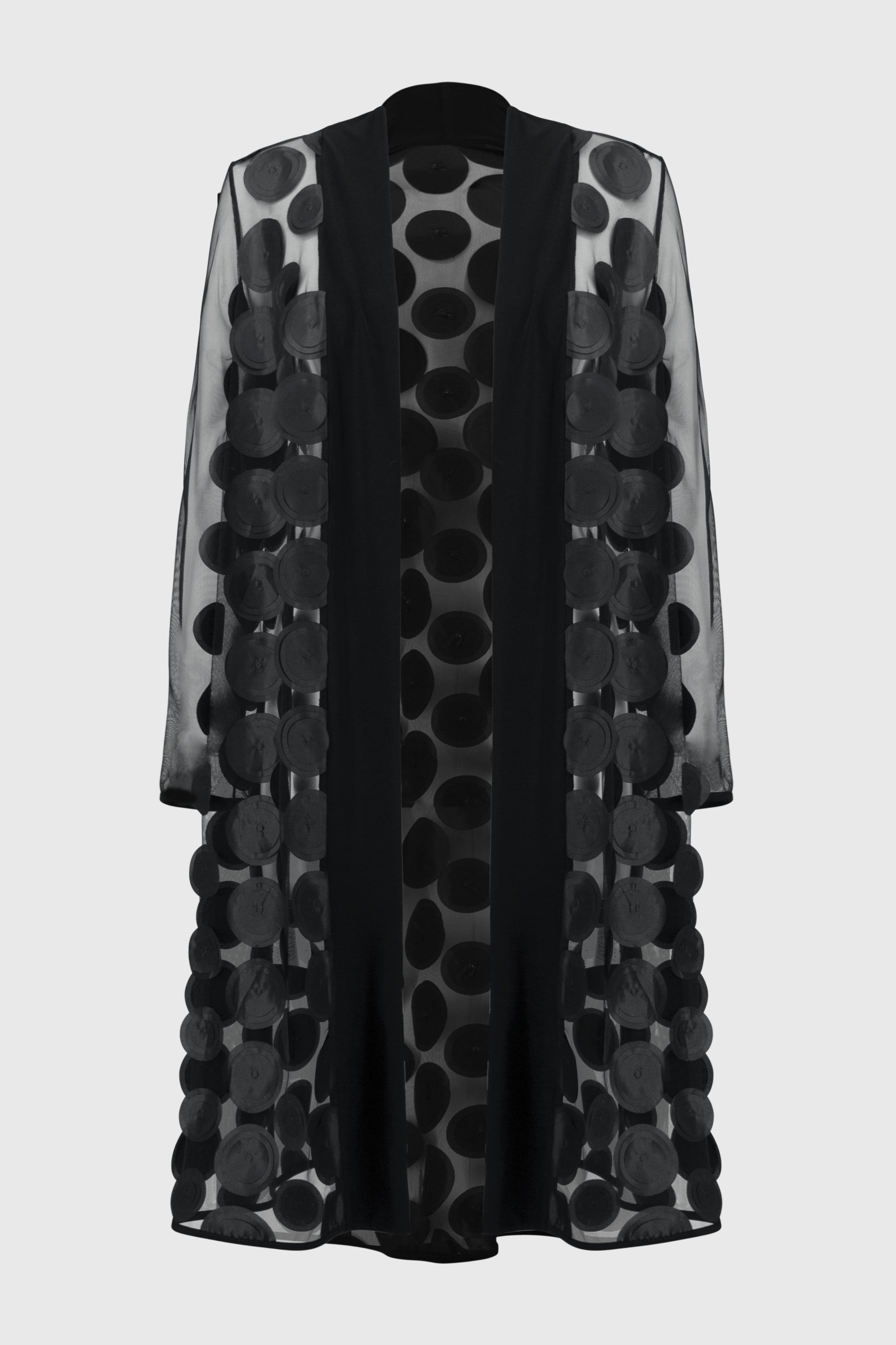 Questo soprabito a maniche lunghe, realizzata in mesh e maglia originale, offre una copertura leggera e uno stile stravagante. Una grande stampa a pois 3D adorna il corpetto, aggiungendo una texture divertente e profondità. Le maniche lunghe in mesh e una fascia in maglia setosa lungo la scollatura completano questo capo a strati.