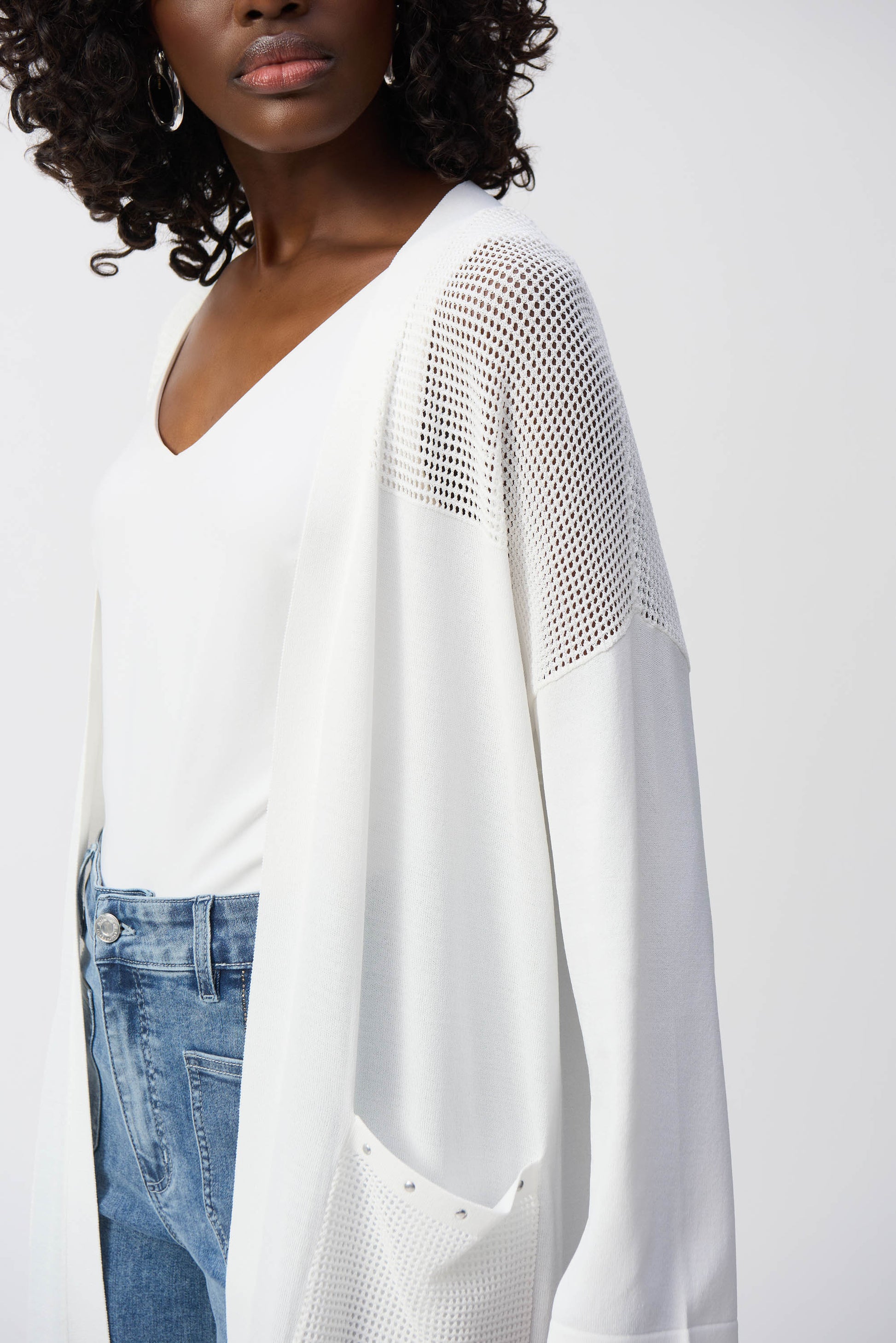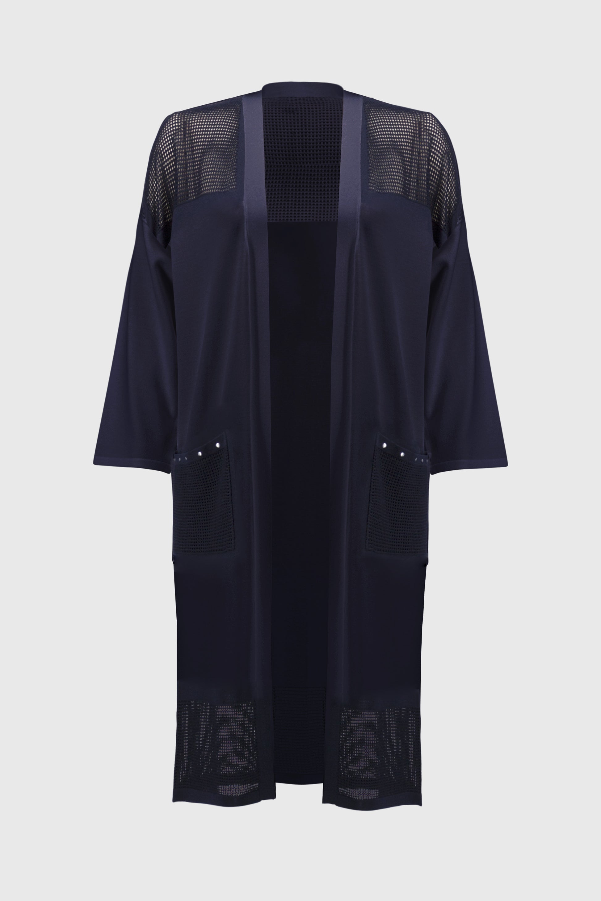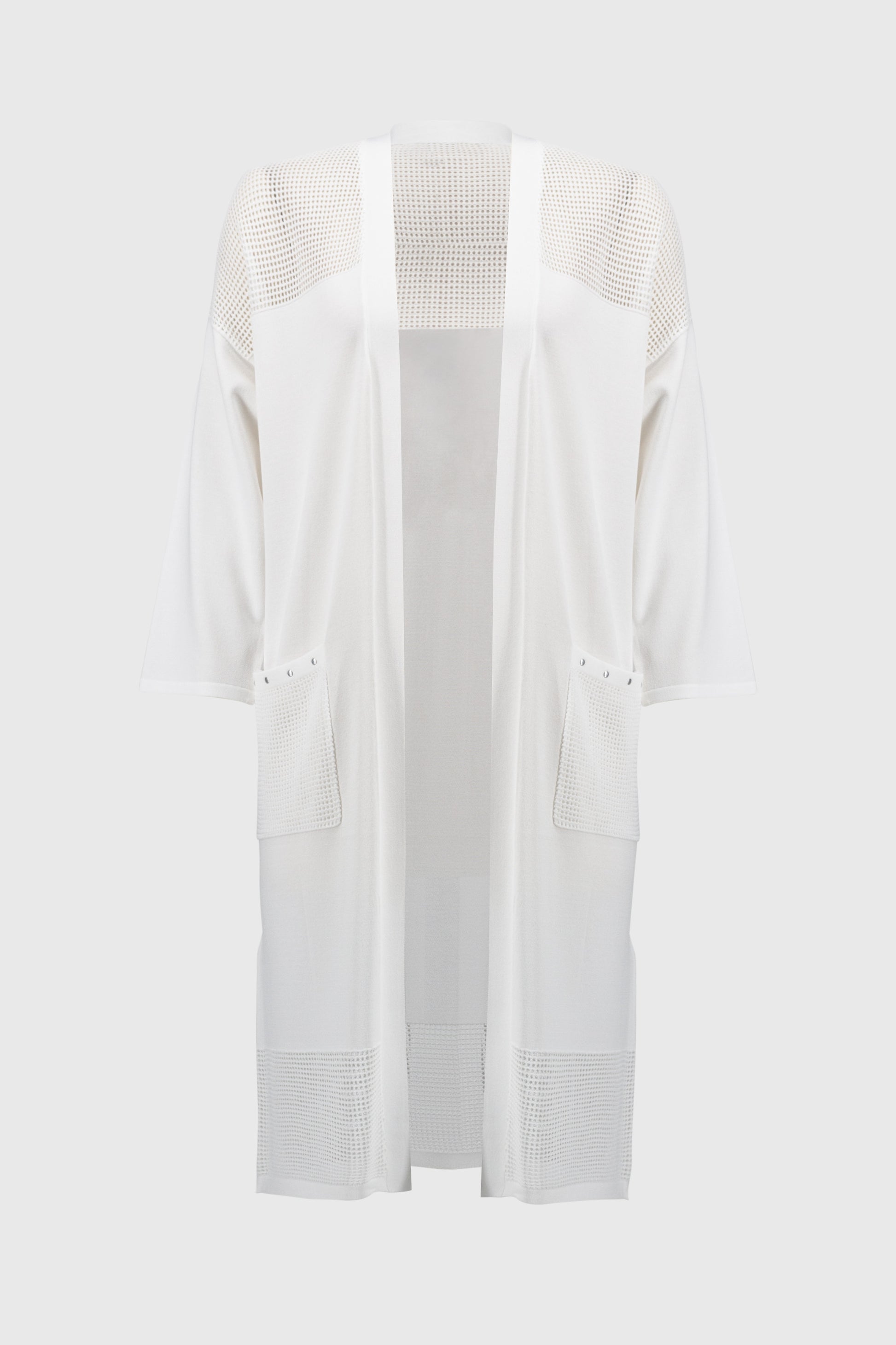 Questo soprabito in maglia è tutt altro che banale, con le sue raffinate cuciture traforate sui carré e sull orlo. Il modello aperto sul davanti, le maniche a tre quarti e le tasche applicate decorate si combinano per creare una versione elegante di questo capo tanto amato.