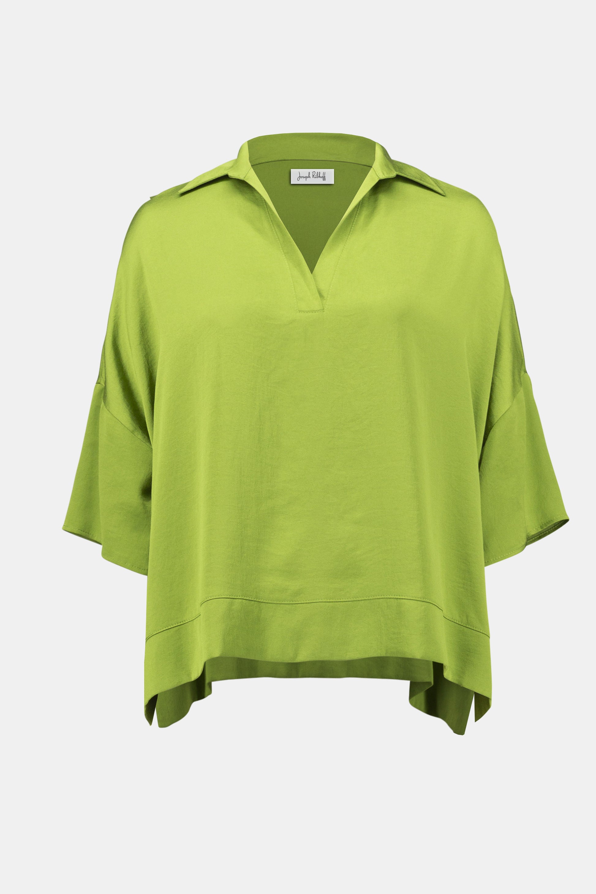 Aggiungi un tocco casual chic al tuo look con questo top in raso. Lo scollo a V con colletto a camicia e le maniche dolman a tre quarti si combinano magnificamente conferendo al capo uno stile rilassato. L elegante silhouette squadrata, accentuata dagli spacchi laterali e dall orlo asimmetrico, è la base ideale per creare l ensemble perfetto.