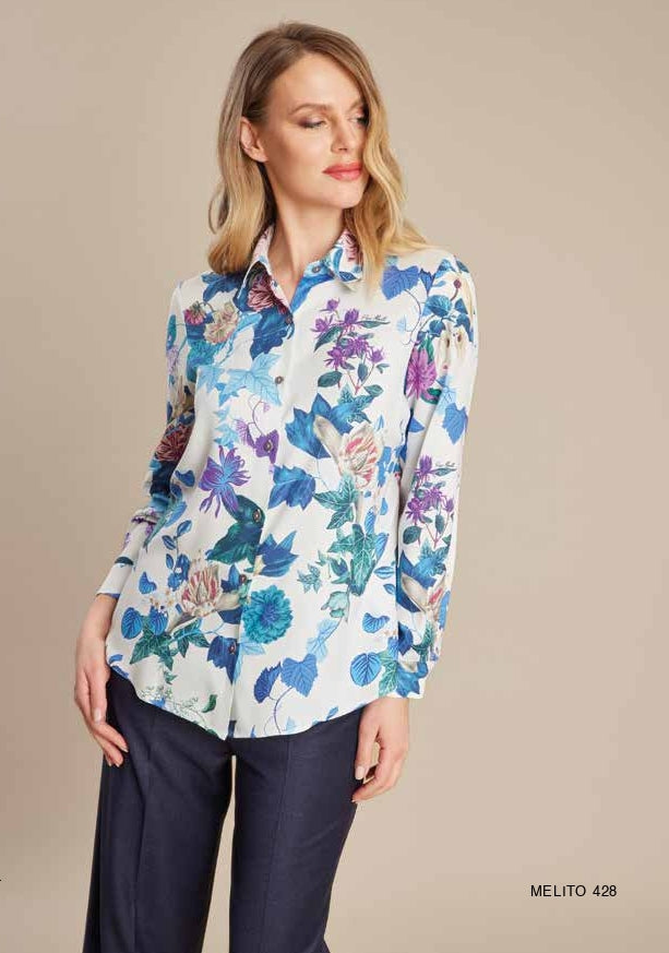 Camicia in seta Piero Moretti fondo bianca stampa fiori manica lunga