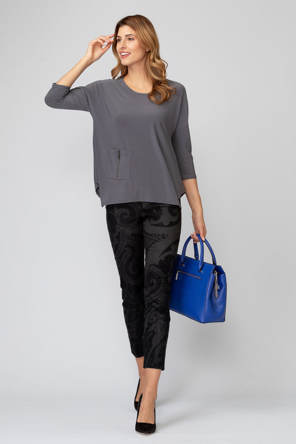 Questa maglia a manica tre quarti in jersey grigio è perfetta per essere indossata in molte occasioni diverse. Può essere abbinata a jeans o pantaloni per un look casual e confortevole, oppure a una gonna per un tocco più femminile ed elegante.