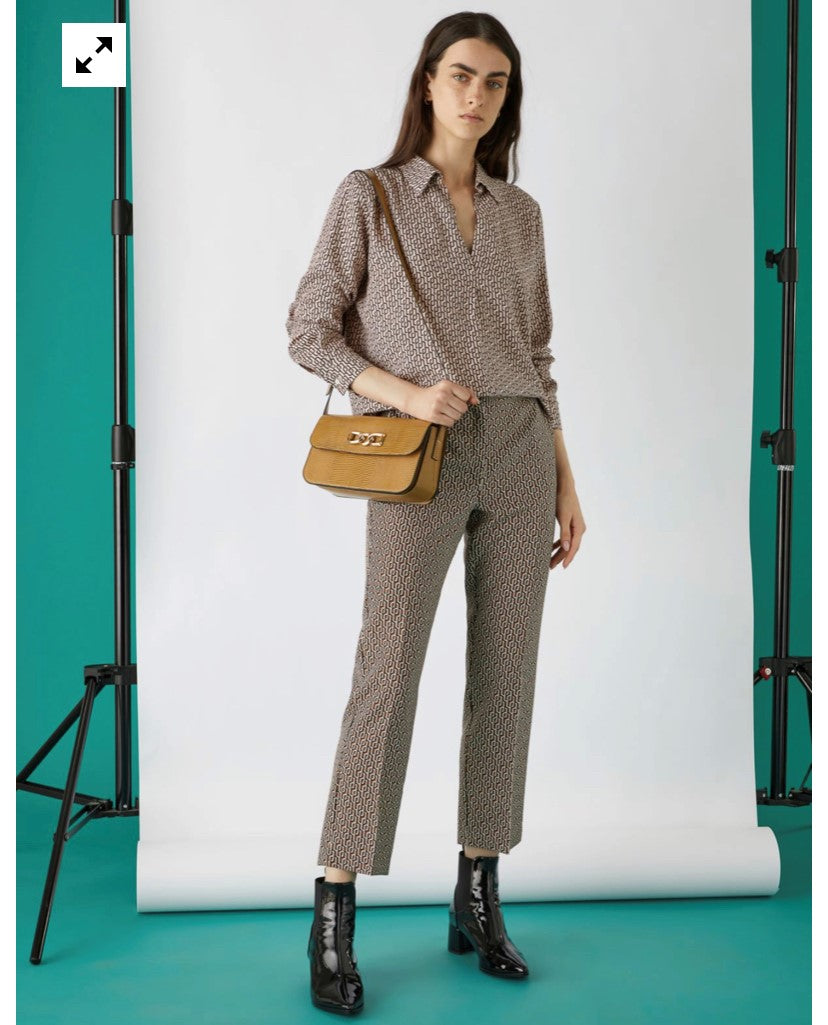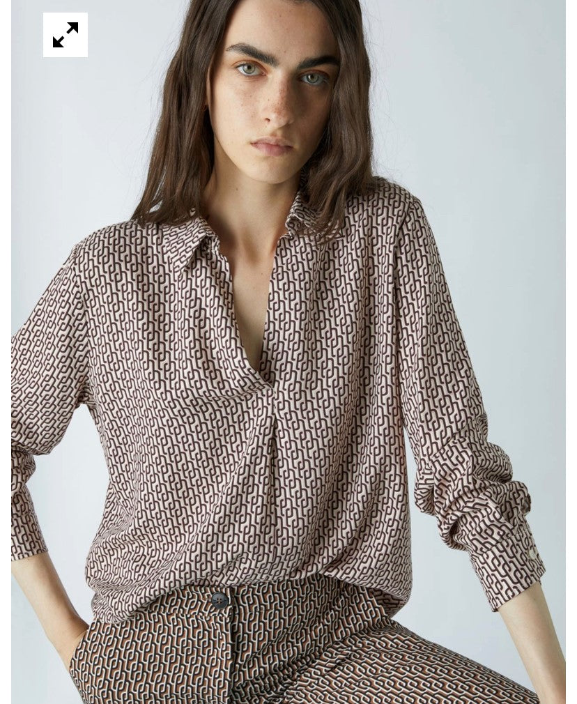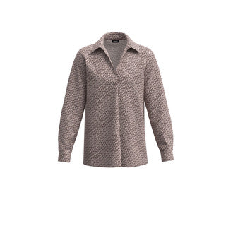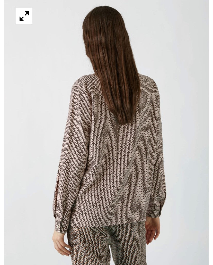 Blusa in twill a fantasia, linea dritta. Collo a camicia con apertura a V, maniche lunghe con polsino. Chiusura con un bottone sullo scollo.