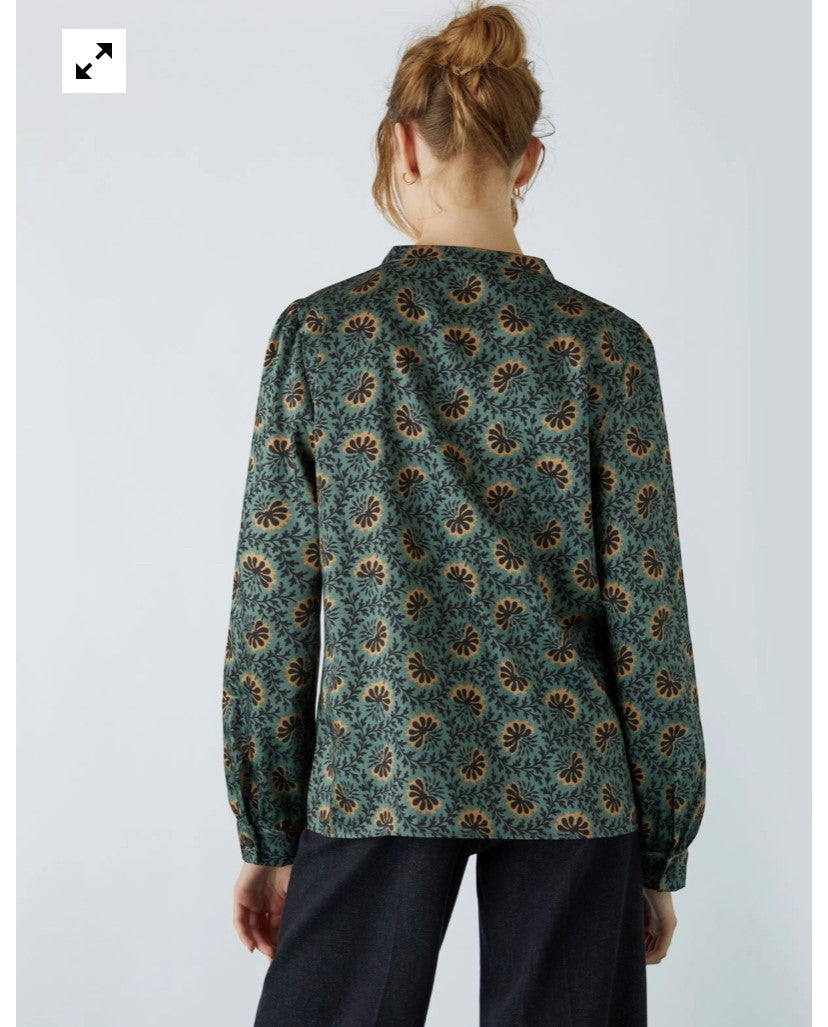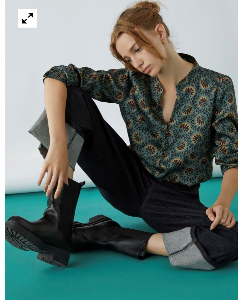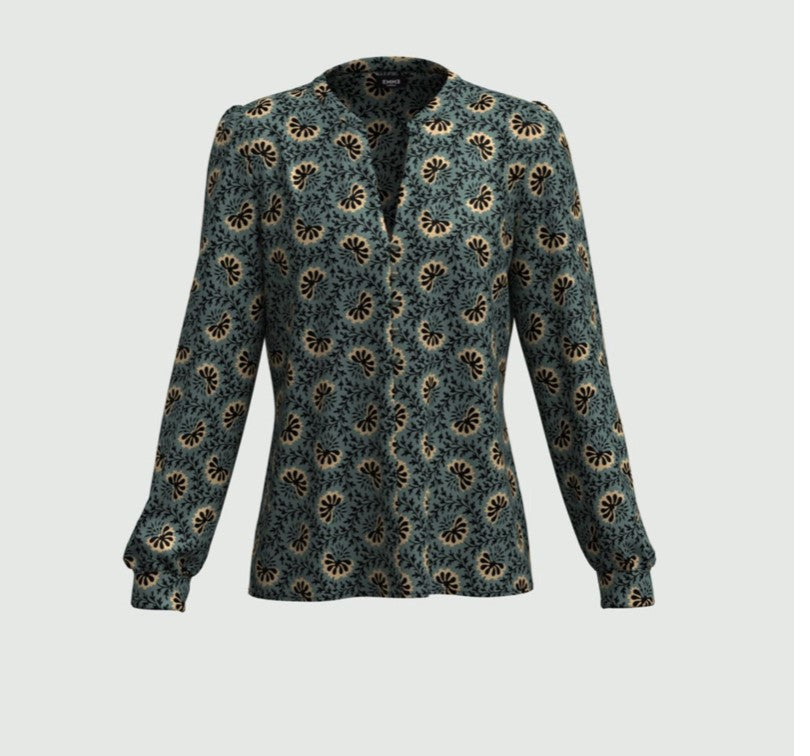 Blusa in twill a fantasia, linea dritta. Scollo rotondo con apertura a V e bottoni ricoperti, maniche lunghe con polsino.