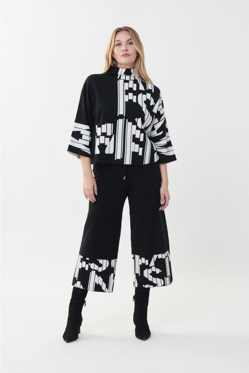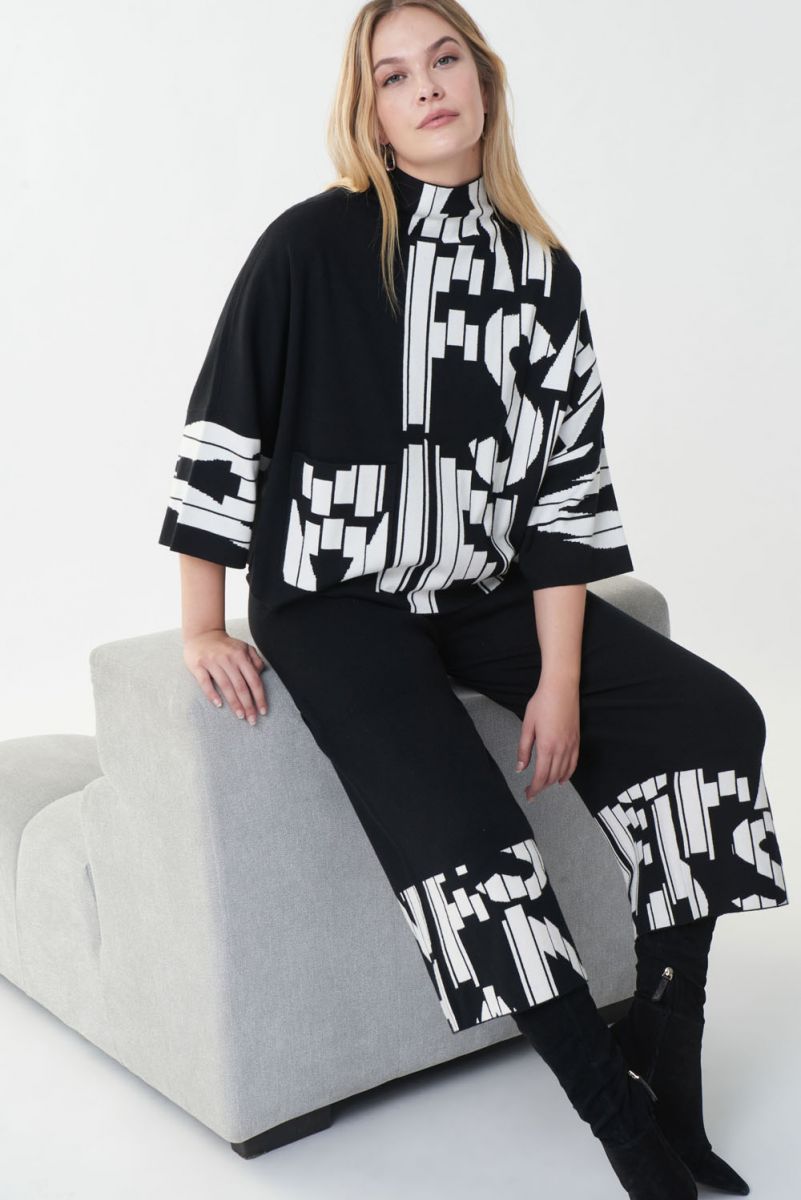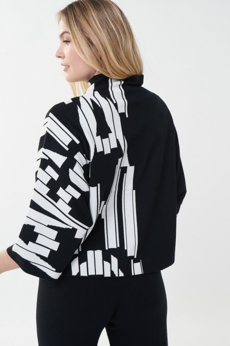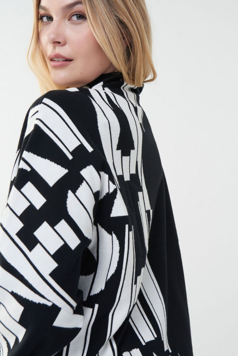 Audace e bellissimo, questo maglione fantasia in jacquard regala un look sorprendente, completato da un collo a imbuto aderente e maniche a tre quarti. Una tasca sul davanti aggiunge un tratto distintivo a un top che lascia già il segno. Le maniche a campana definiscono un modello giovane e sofisticato, adatto a un ampia serie di eventi.