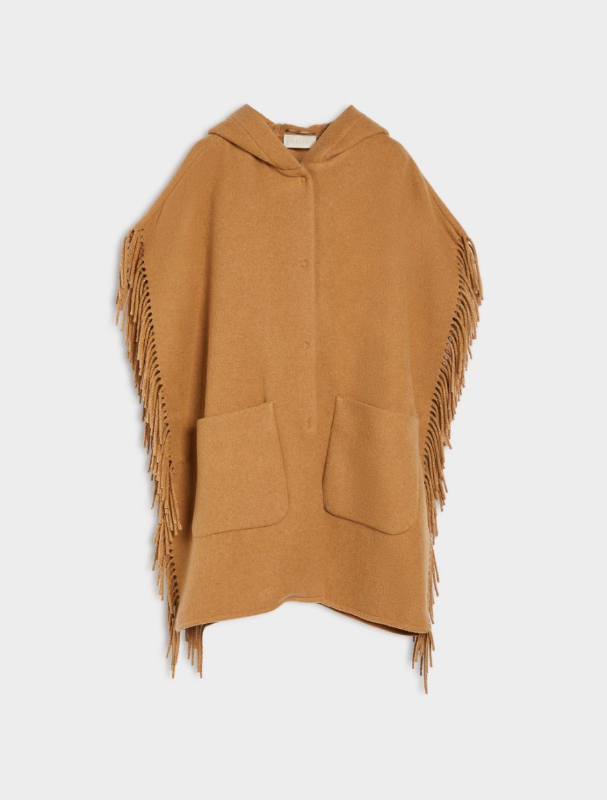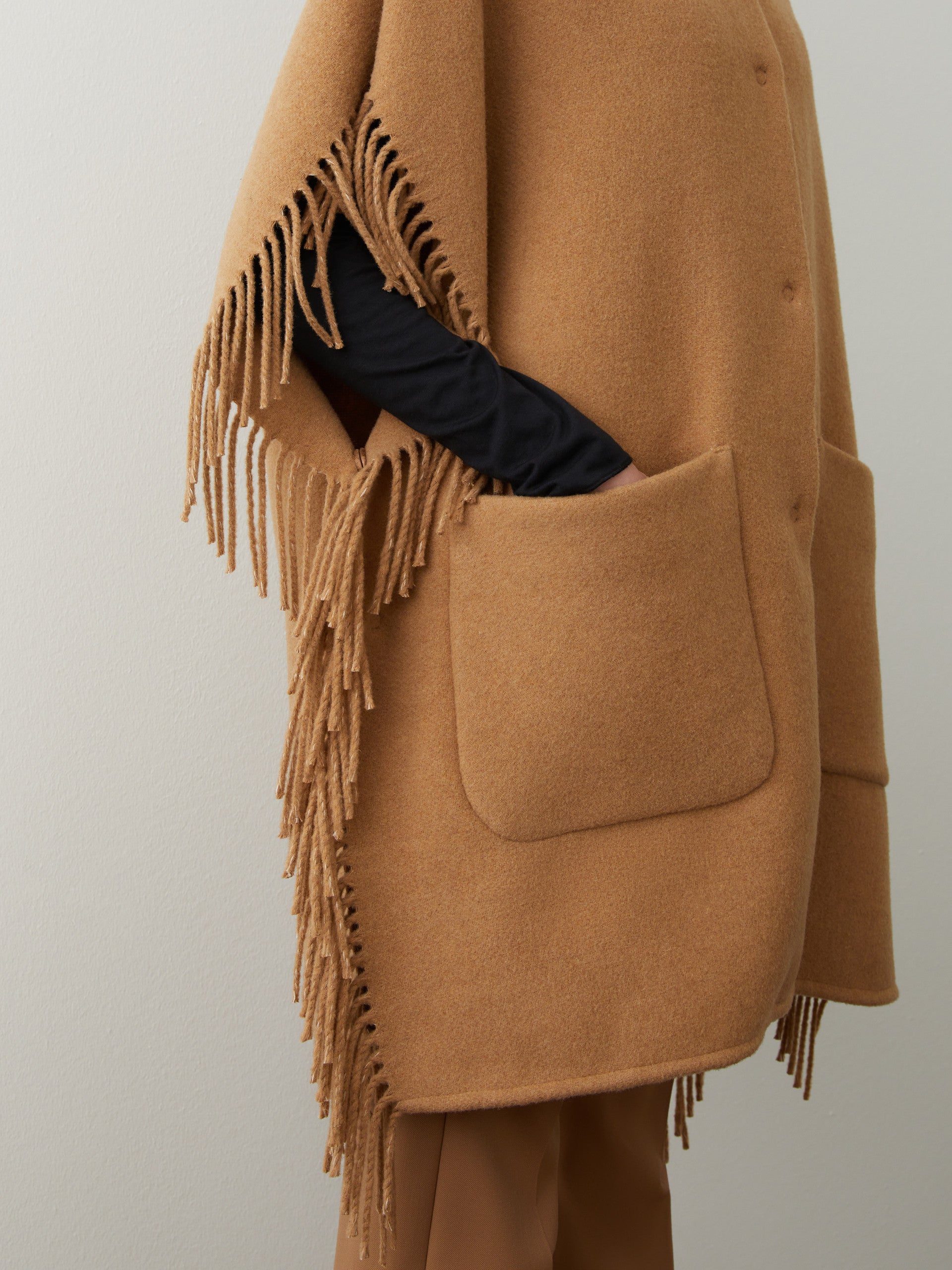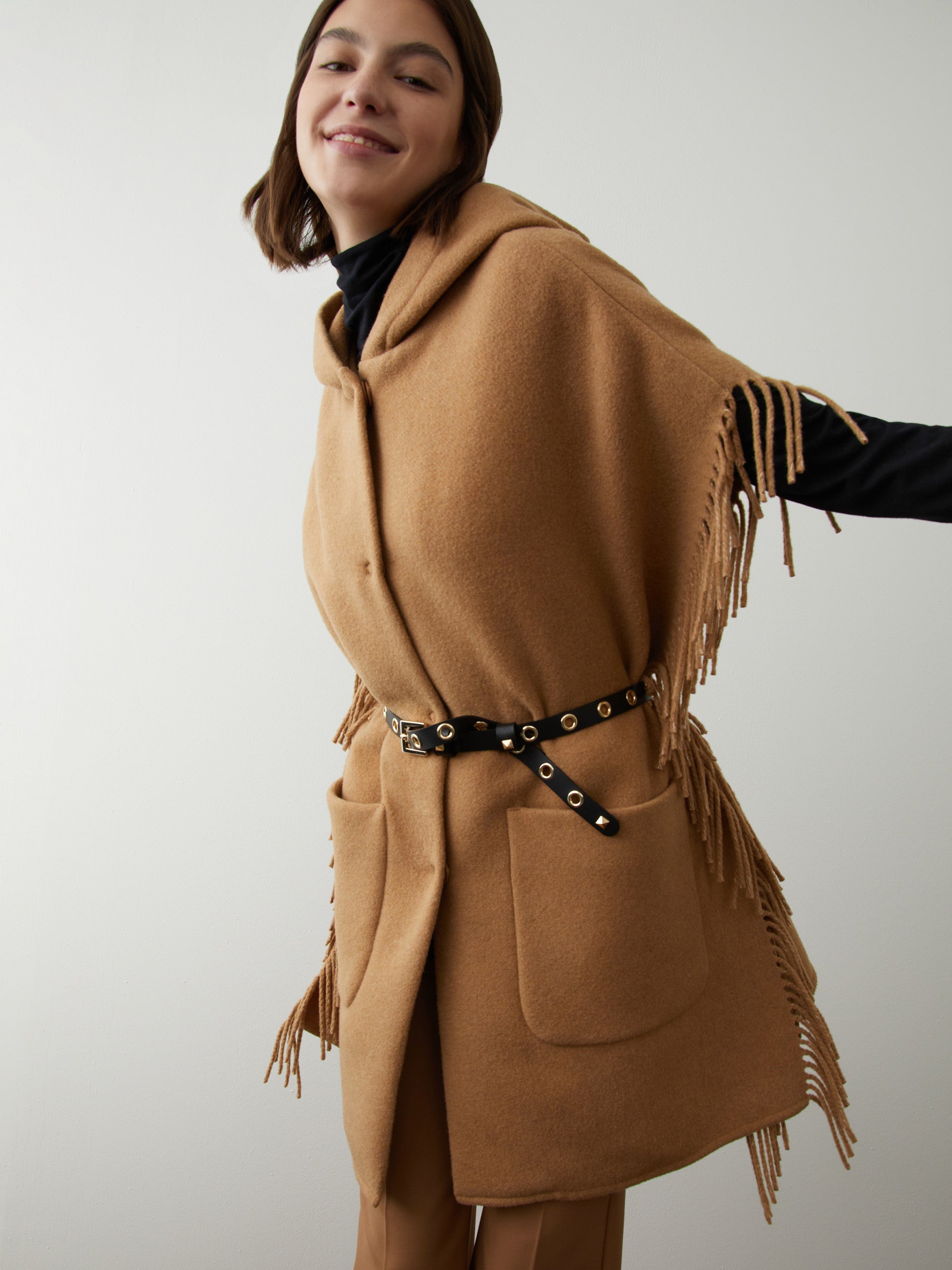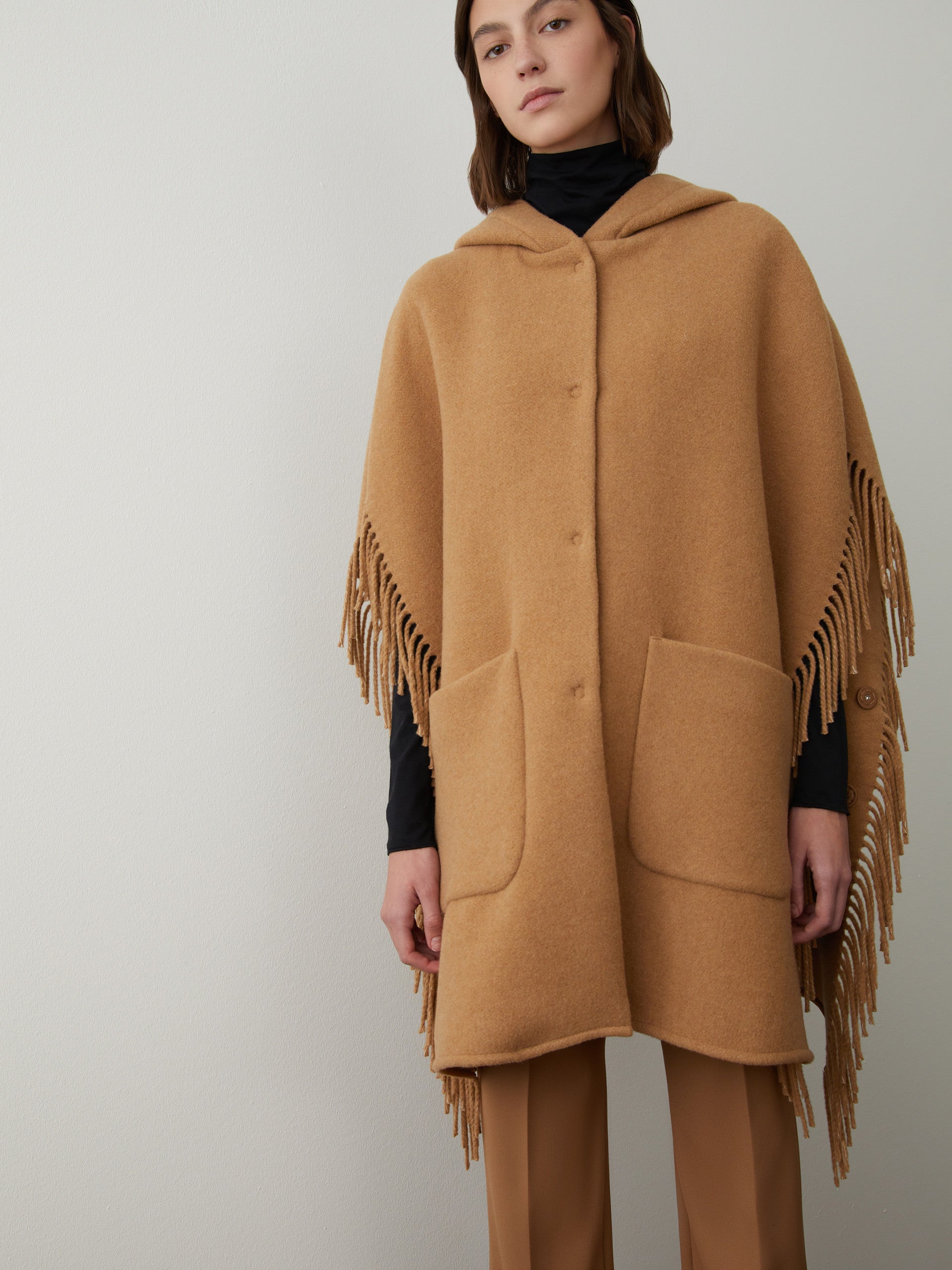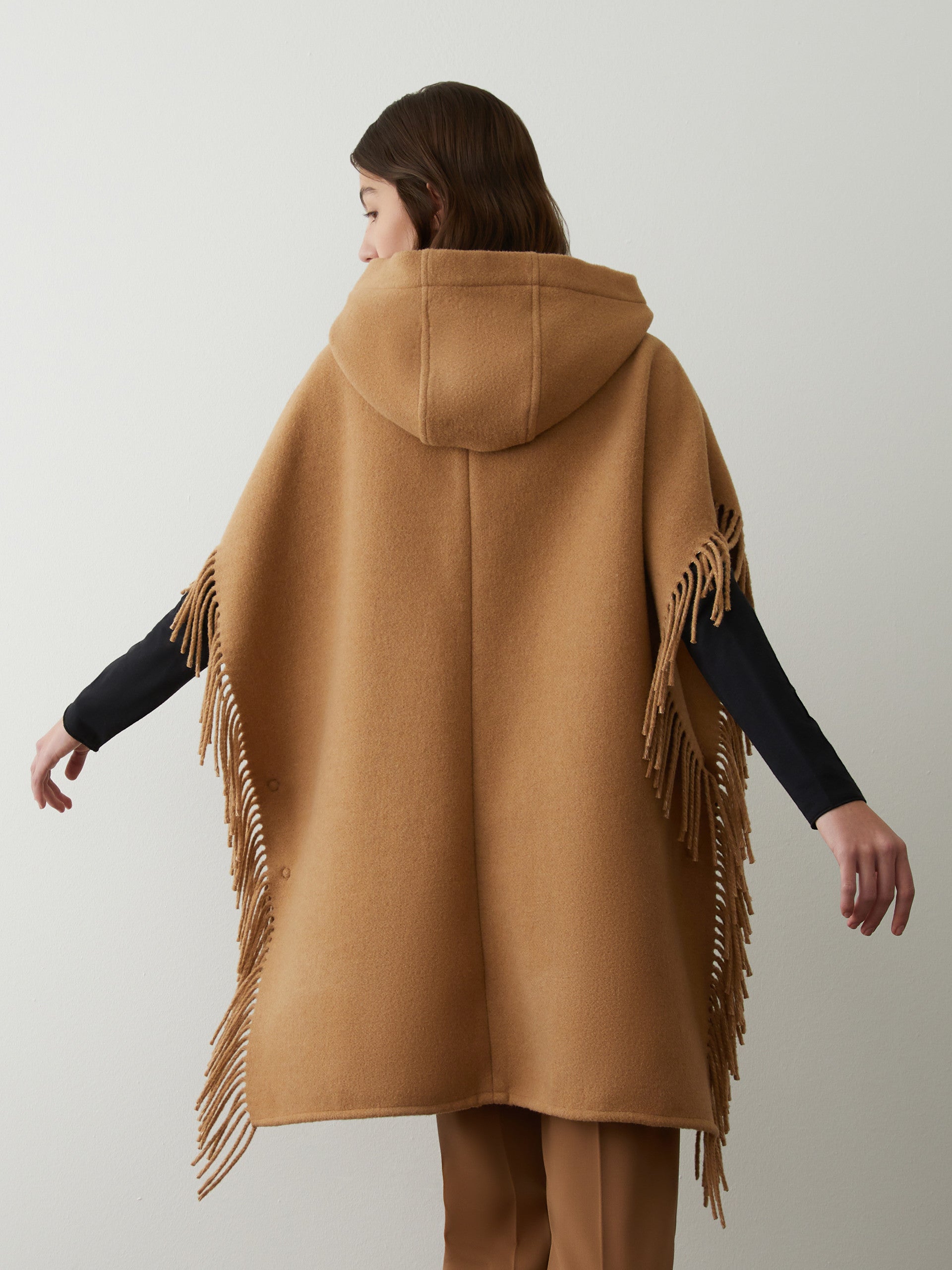 Poncho in panno misto lana dalla linea dritta, chiuso con bottoni automatici davanti e sui lati. Collo con cappuccio. Tasche applicate e dettagli con frange
