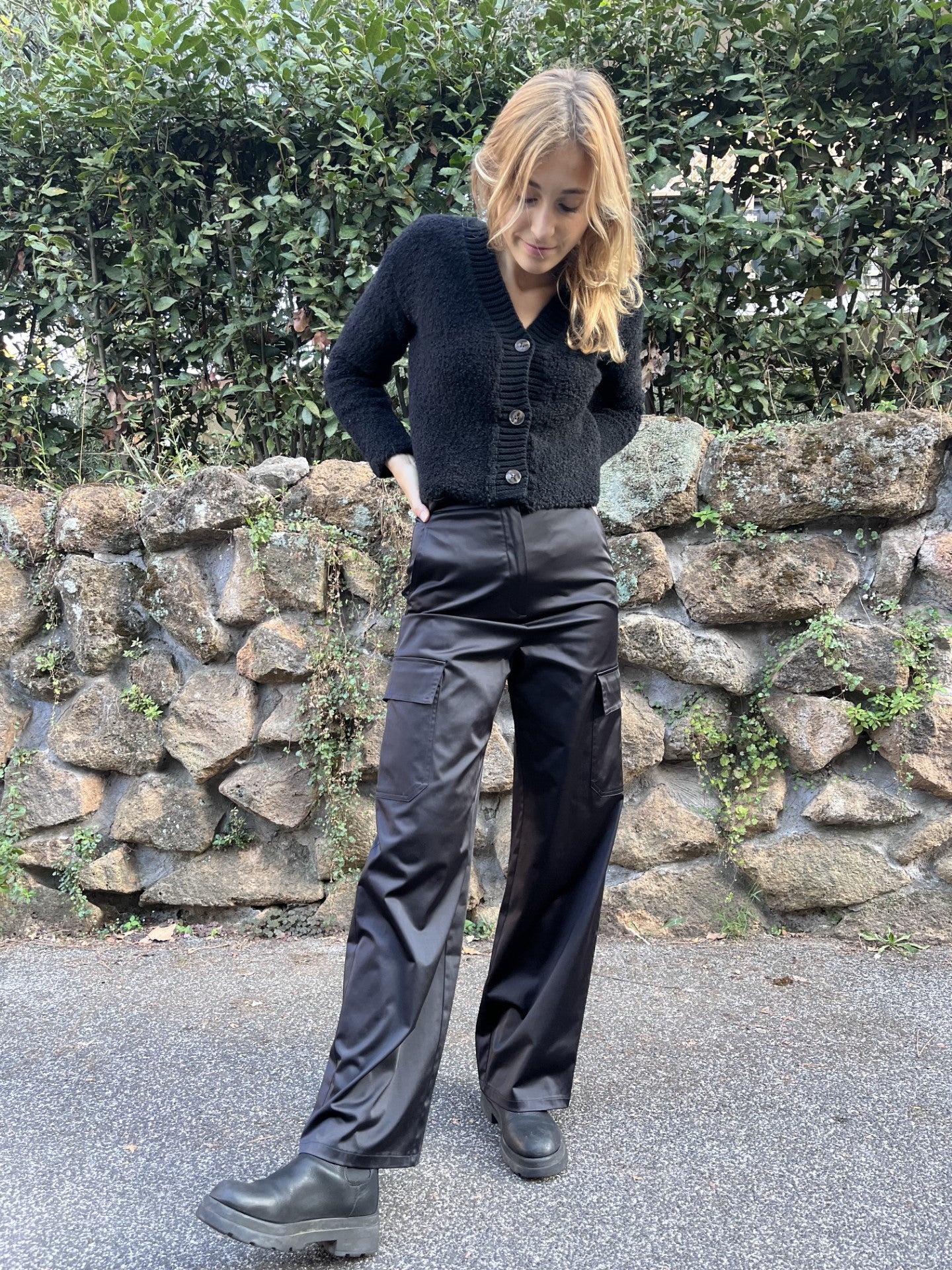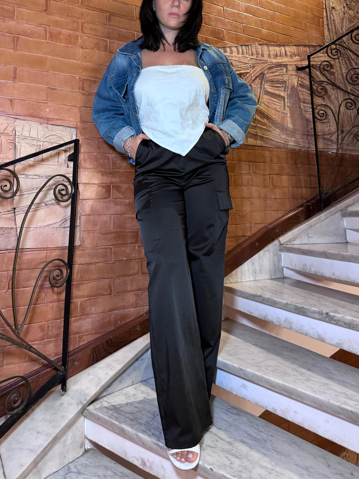 Pantaloni in raso stretch, linea wide leg. Chiusura con bottone e zip nascosta, tasche alla francese davanti, applicate con patta laterali.