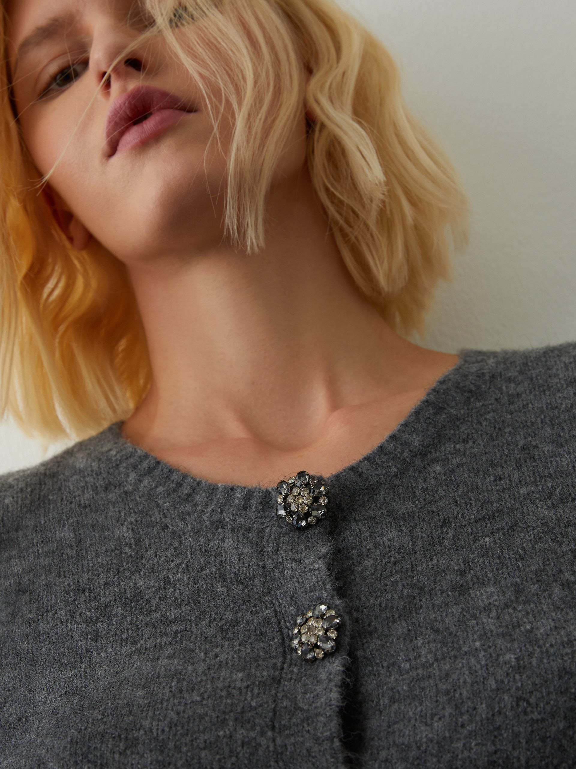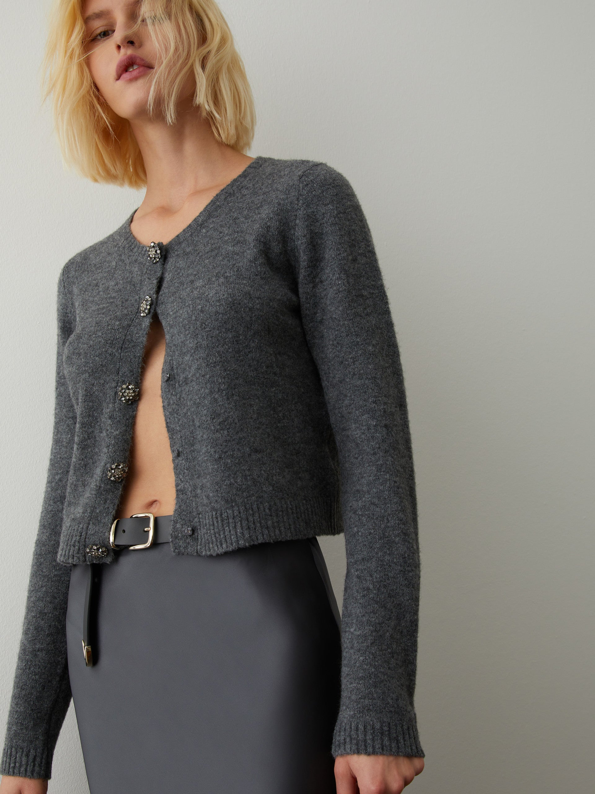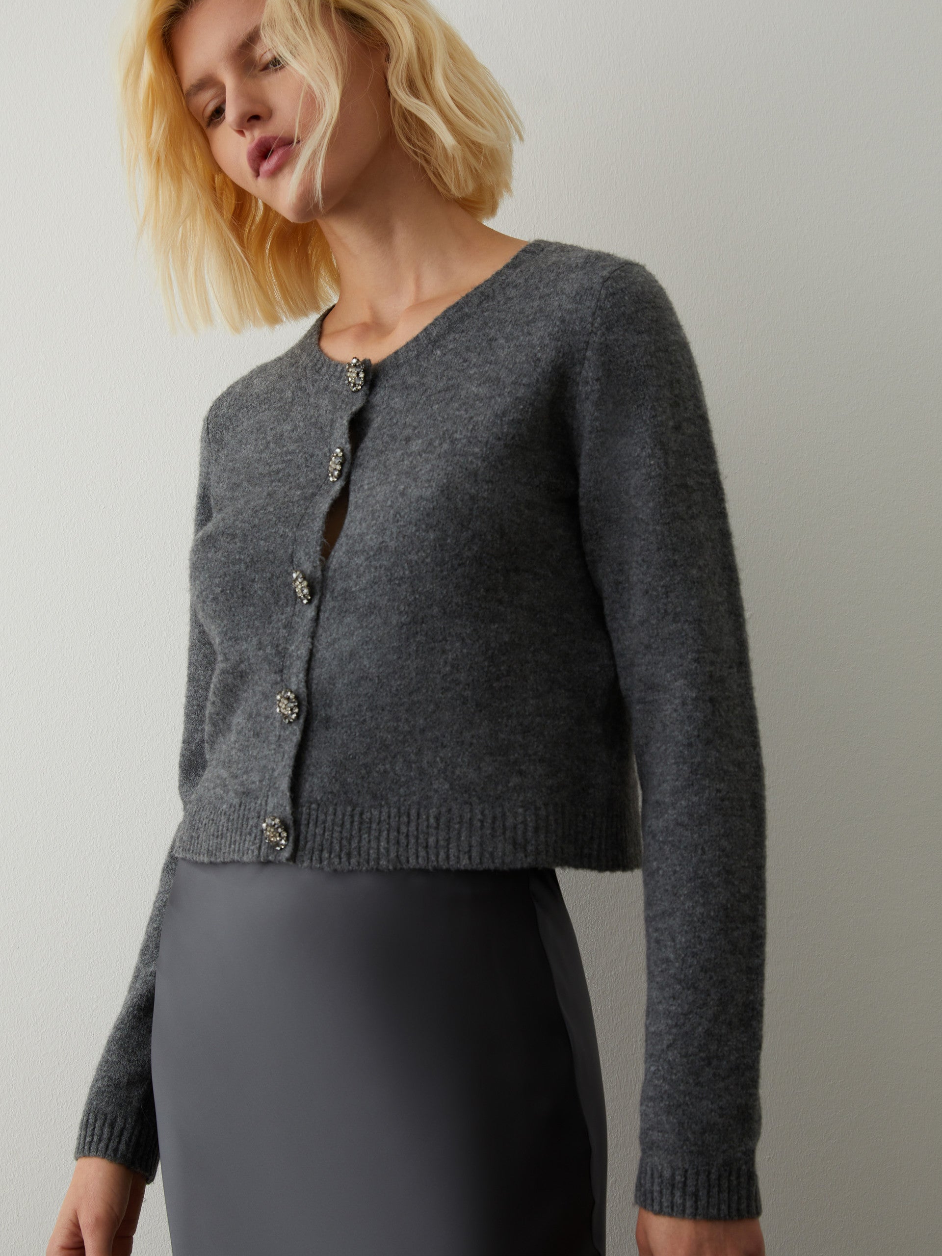 Cardigan in maglia misto lana e alpaca dalla linea dritta. Chiusura con bottoni gioiello e automatici interni. Scollo tondo e maniche lunghe.