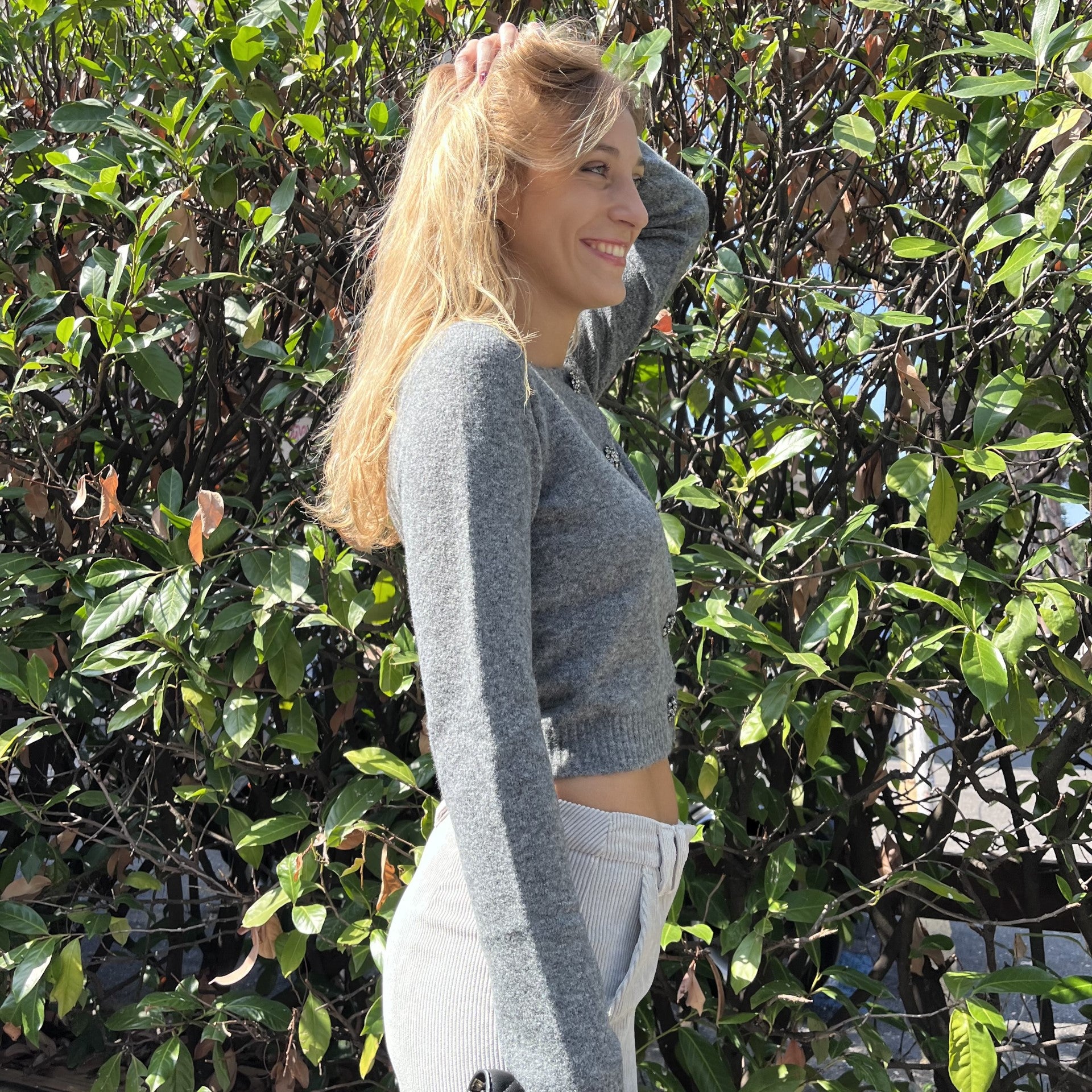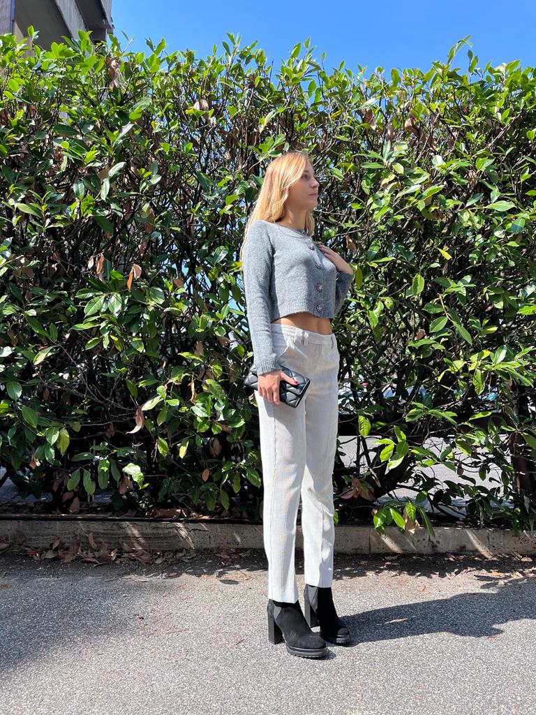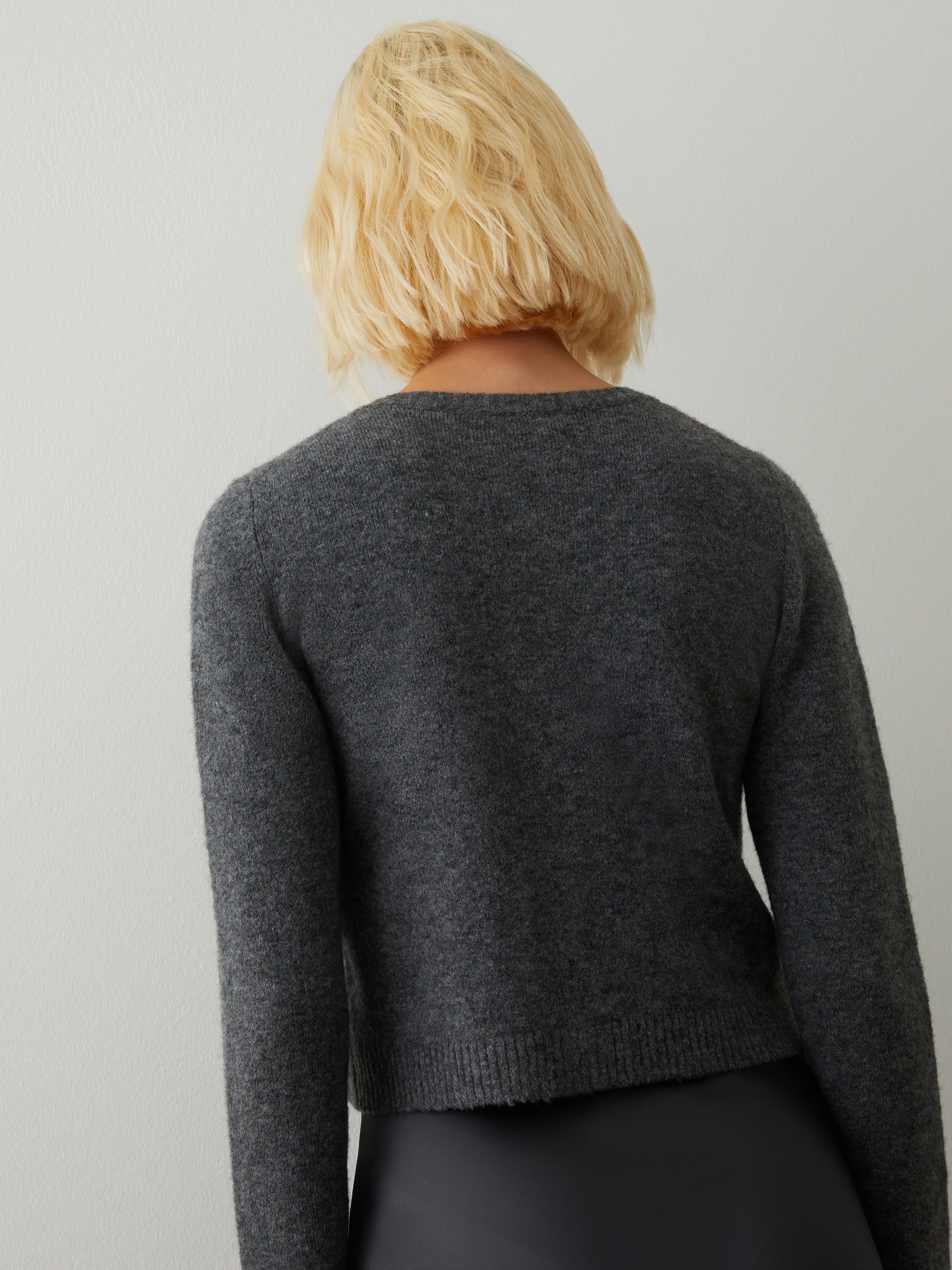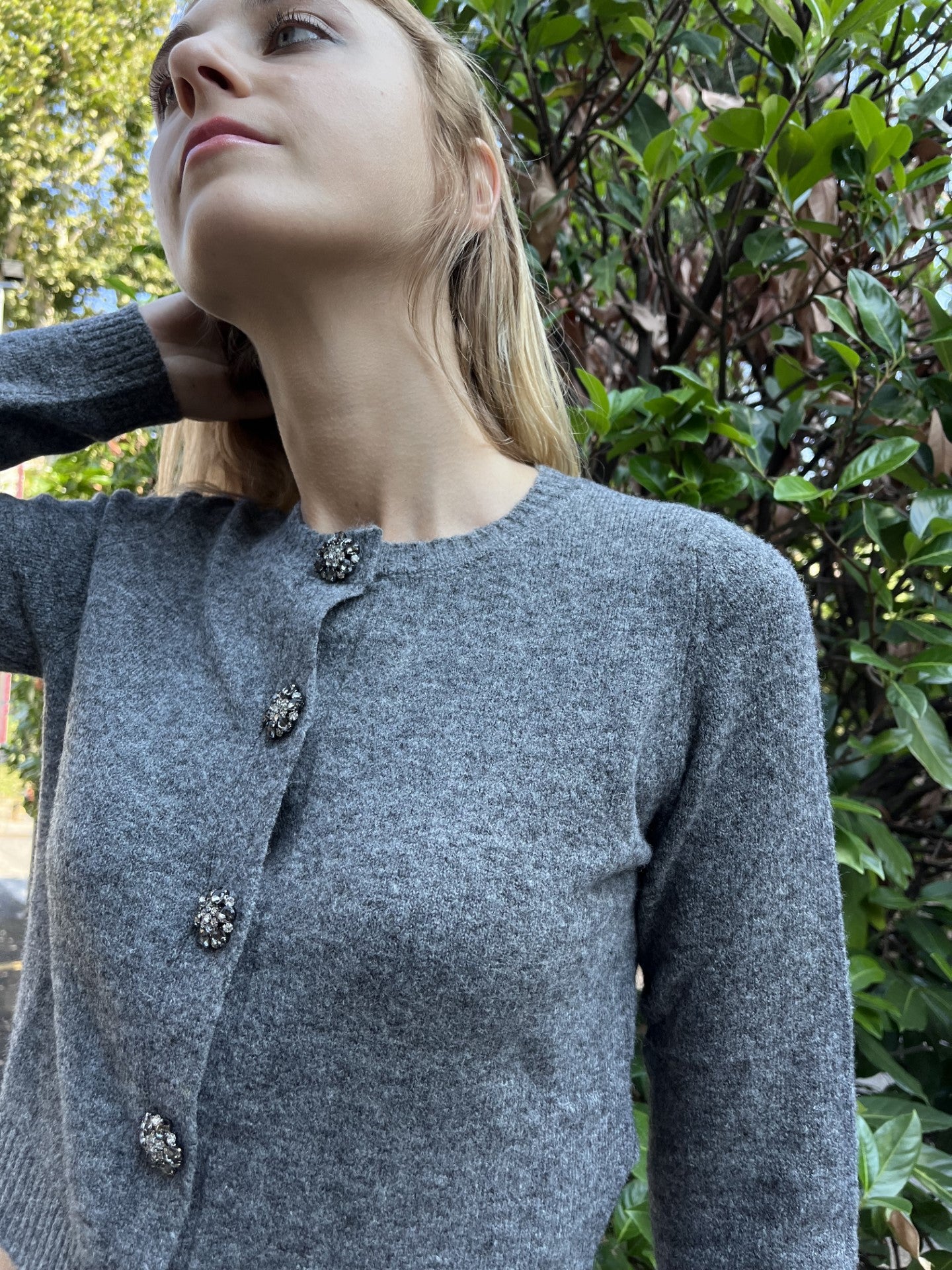 Cardigan in maglia misto lana e alpaca dalla linea dritta. Chiusura con bottoni gioiello e automatici interni. Scollo tondo e maniche lunghe.