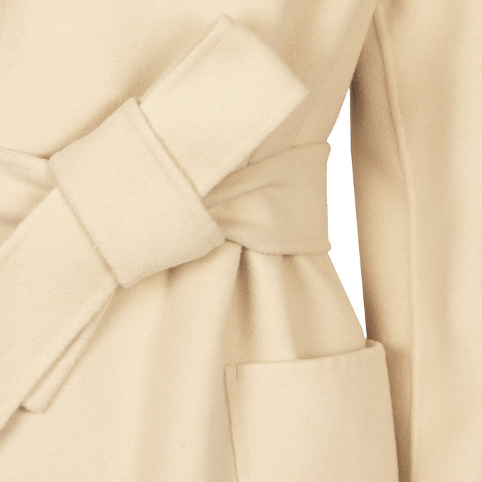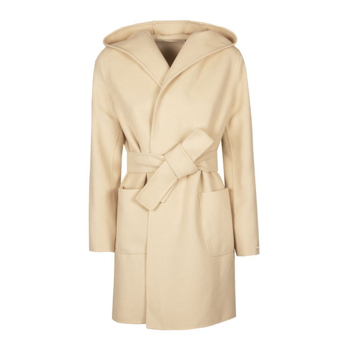 Cappotto sfoderato a maniche lunghe dalla linea morbida, presenta collo a scialle con cappuccio, chiusura a doppiopetto e tasche applicate. Dettaglio cintura coordinata tono su tono.