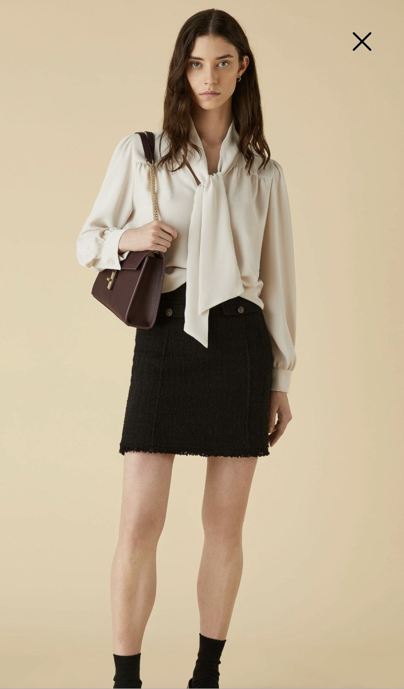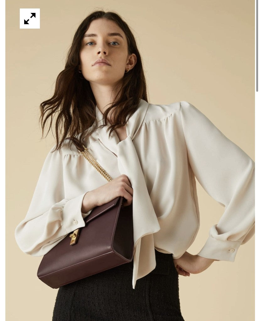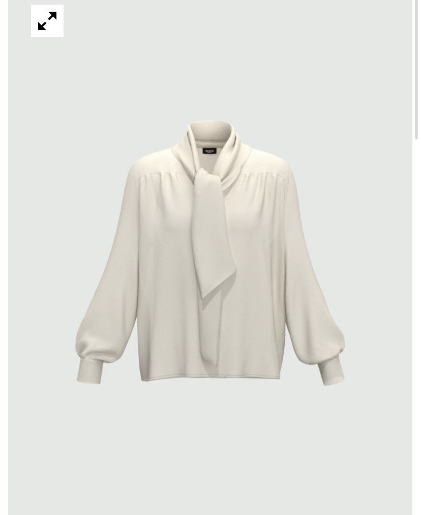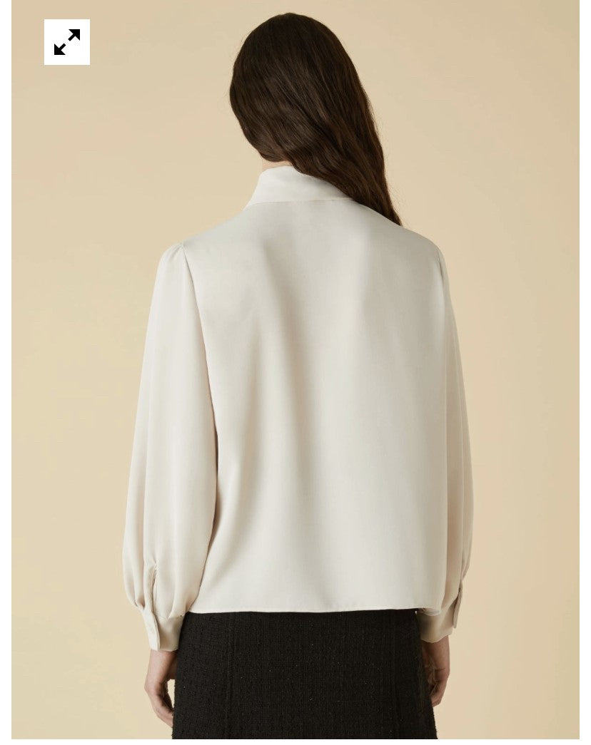 Blusa in georgette, linea dritta. Scollo a V con sciarpina, maniche lunghe con polsino.