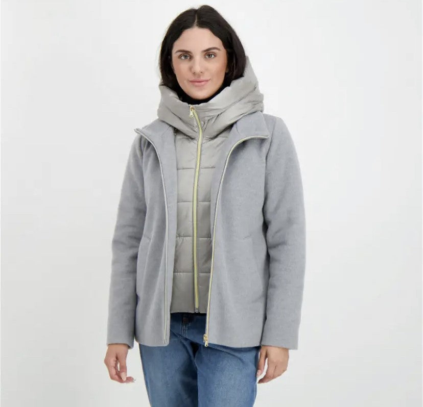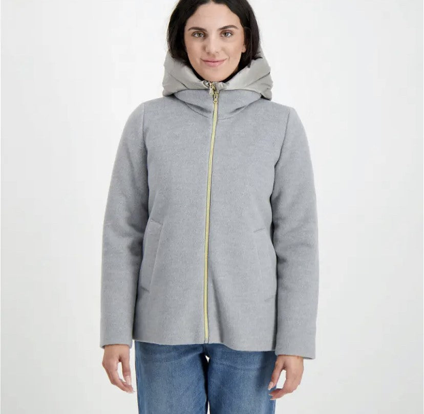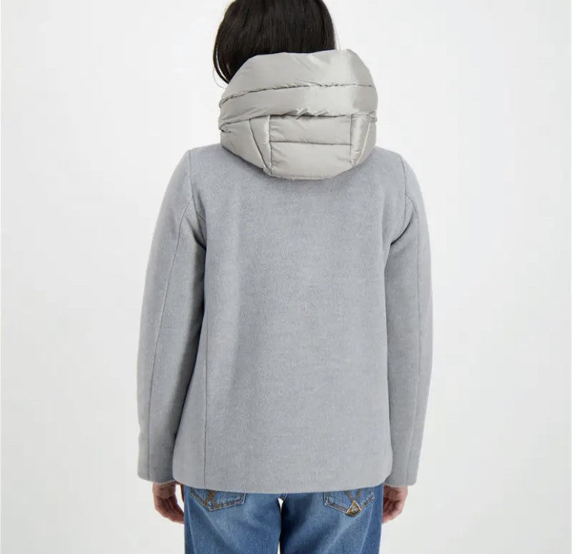 La giacca Emme Marella Tullia aggiorna il classico modello in panno con un appeal contemporaneo, caratterizzata dal davantino con cappuccio in nylon staccabile ed imbottitura interna sintetica, per un capo caldo e versatile.