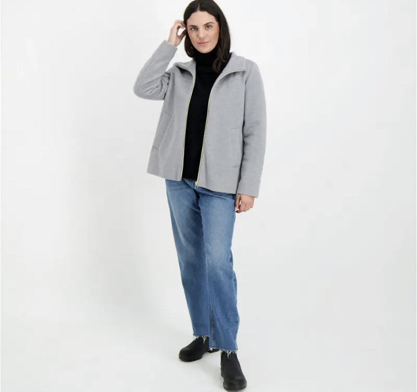 Realizzata in misto viscosa dalla texture soffice, presenta una linea dritta con chiusura full zip a collo alto e tasche a filetto.