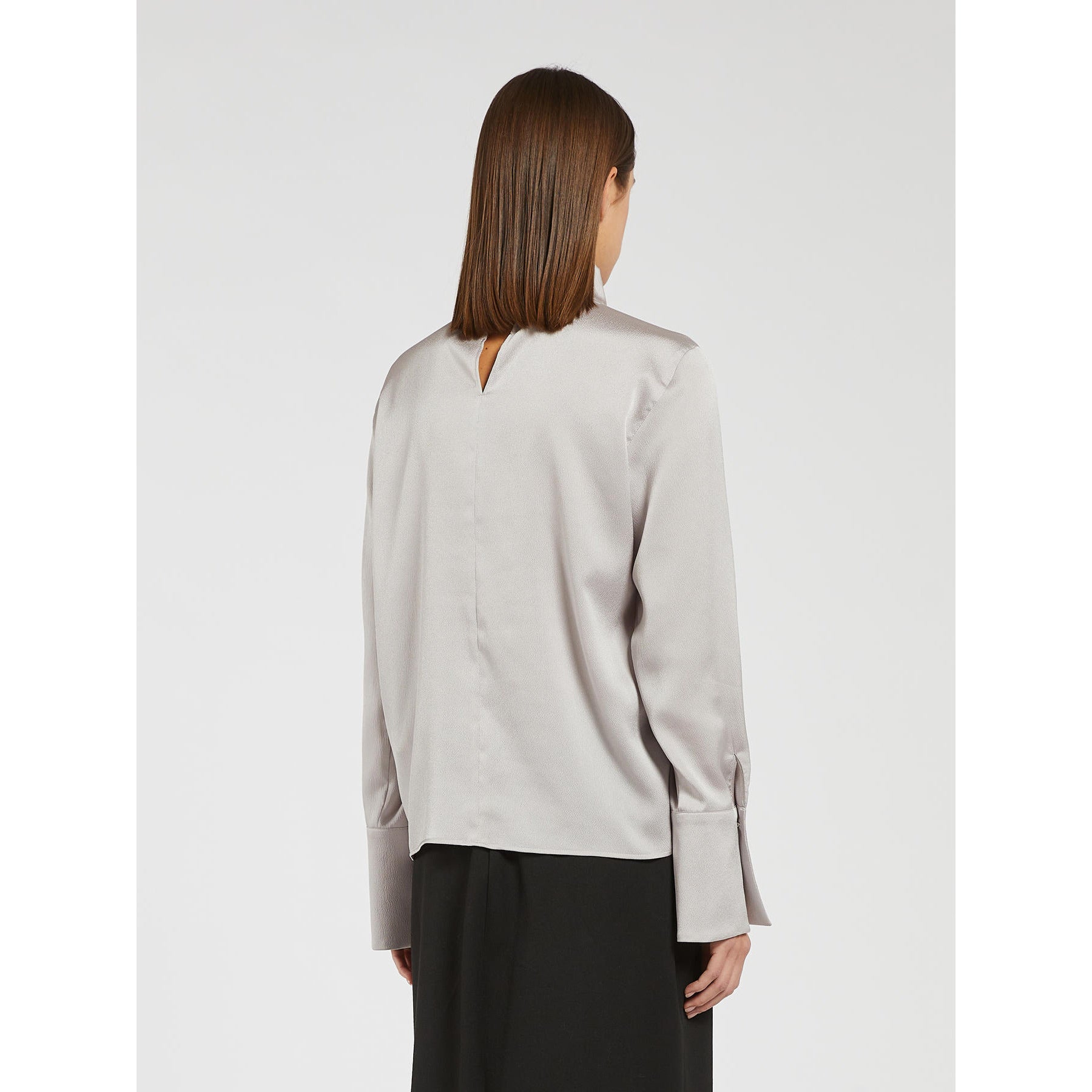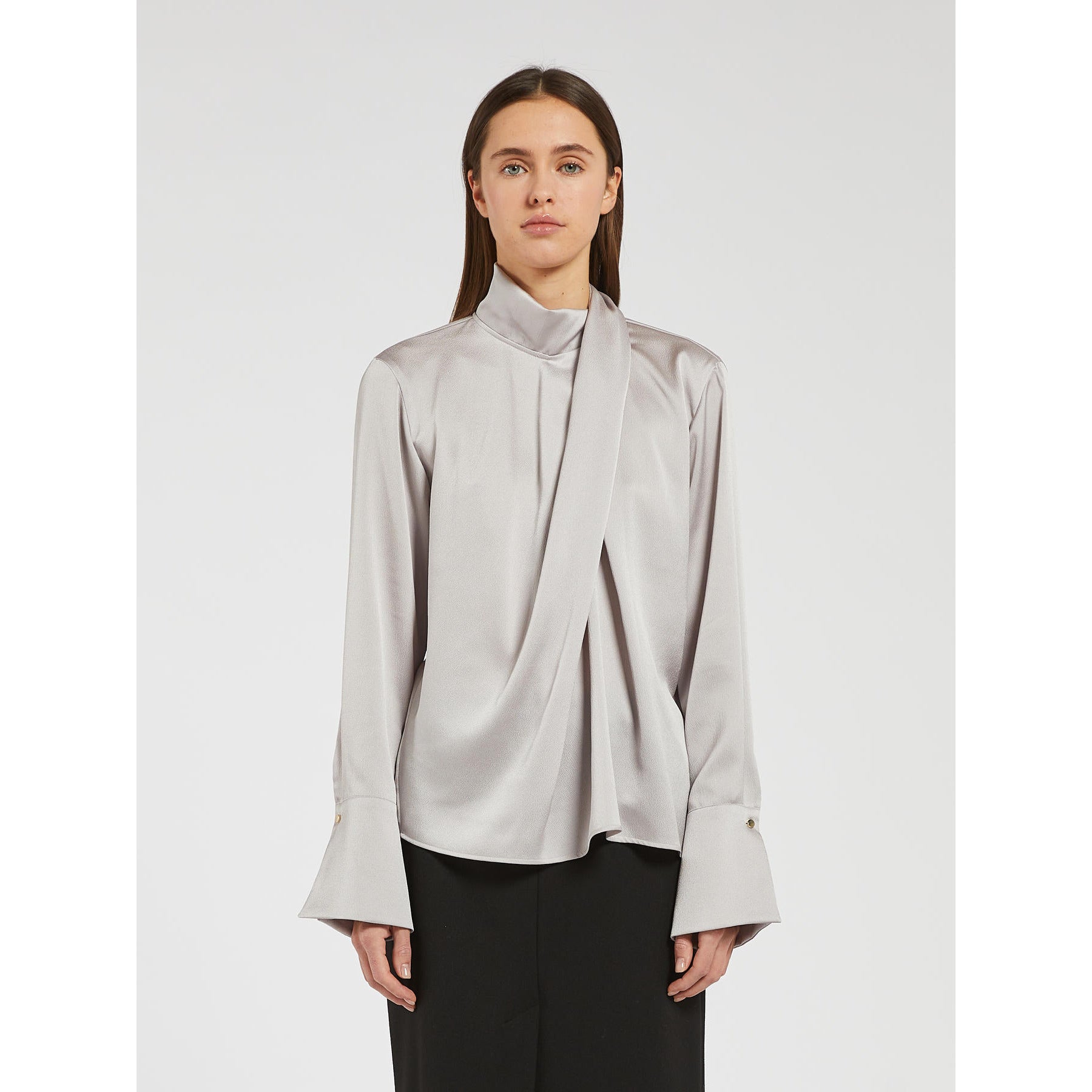 Blusa in raso leggero dalla linea morbida con drappeggio. Collo alto con bottoni sul retro. Maniche lunghe con polsino e bottone.