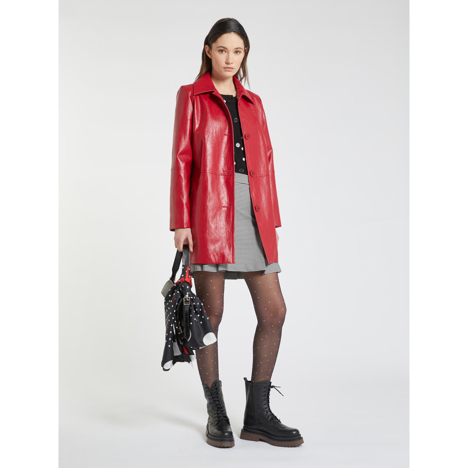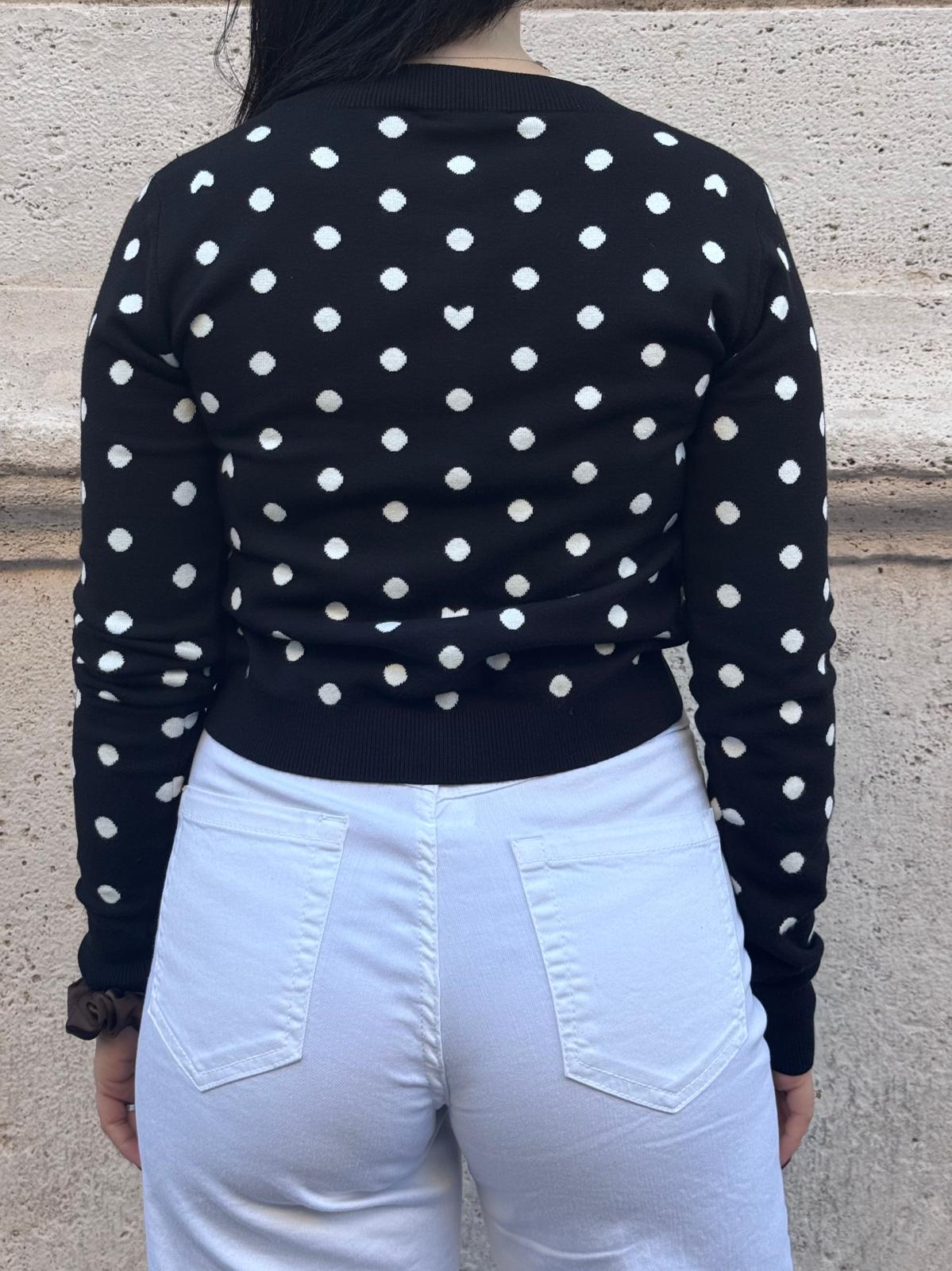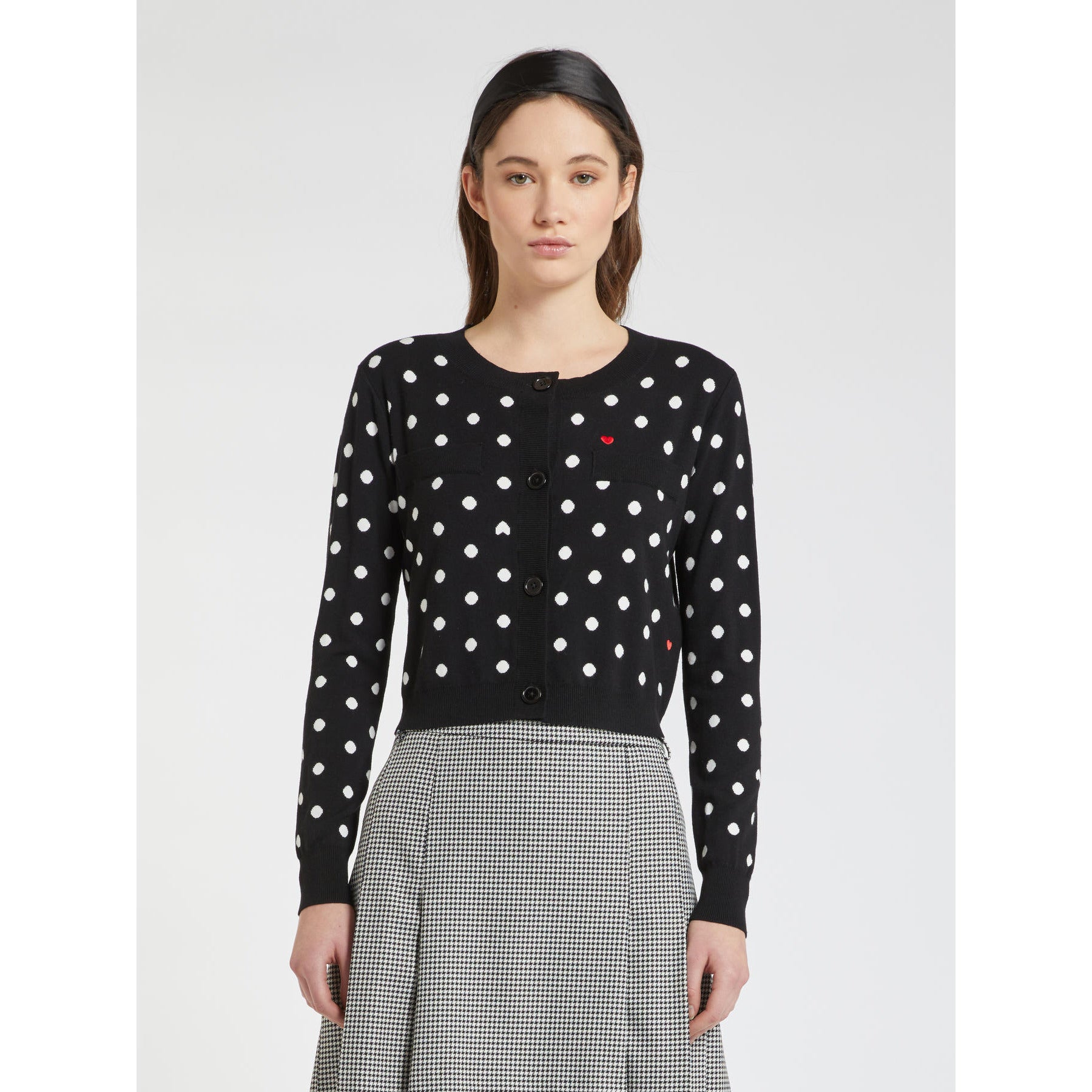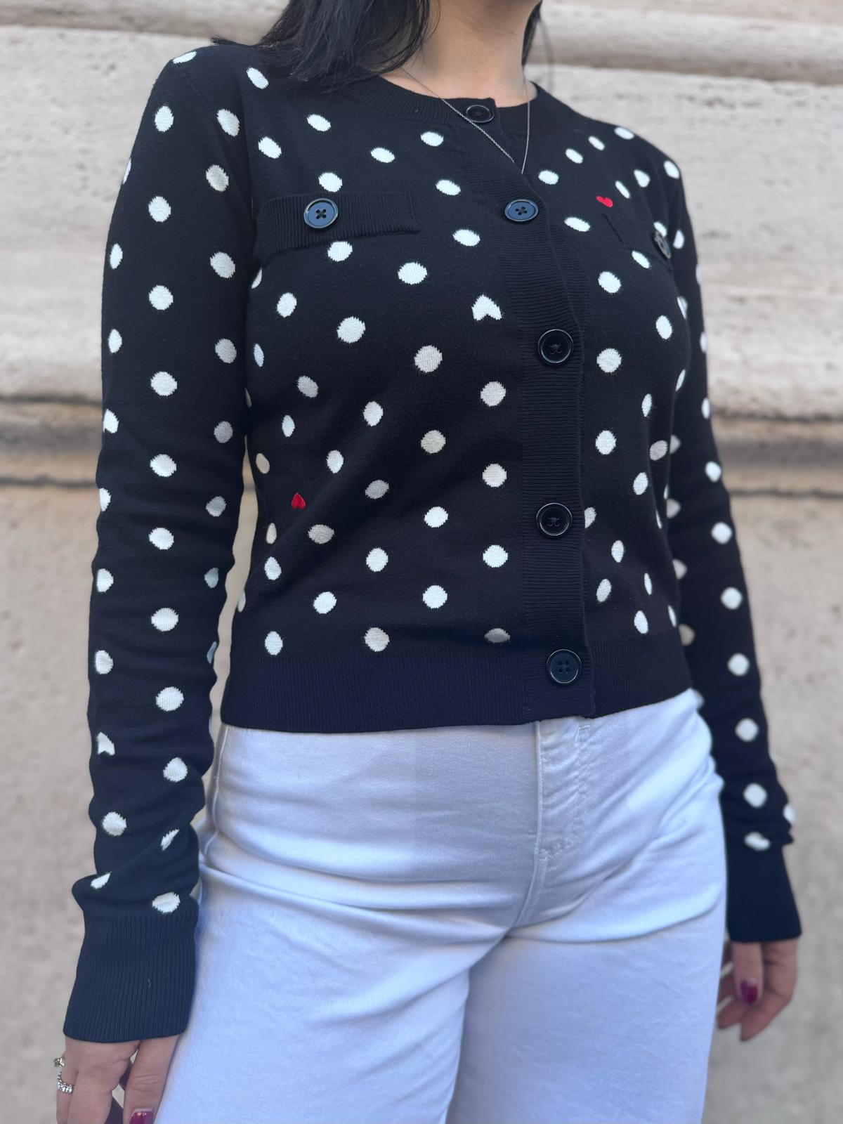 Cardigan girocollo in maglia stretch dalla linea morbida, chiuso con bottoni. Maniche lunghe e taschini trompe-l œil sul petto. Finiture a costine.