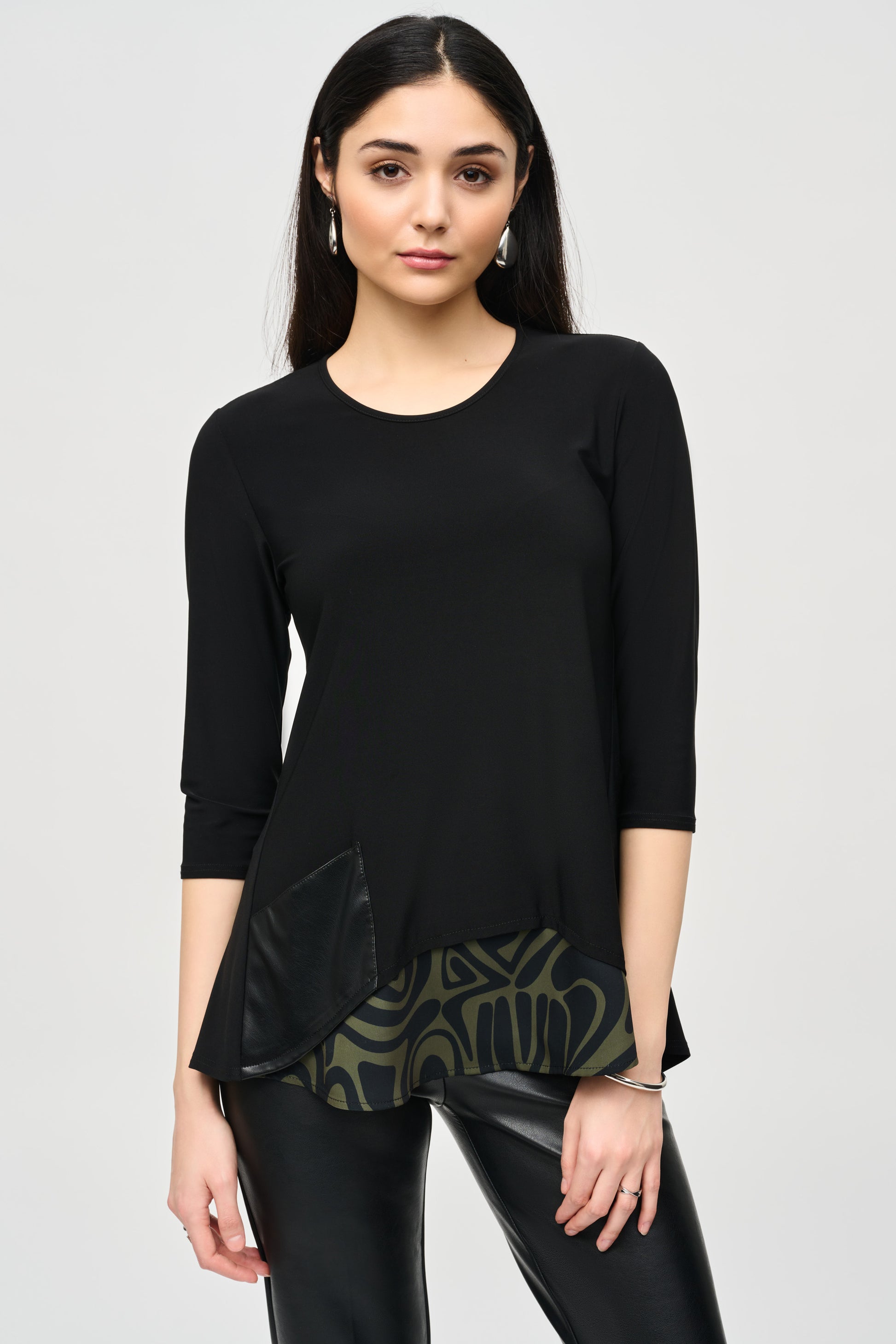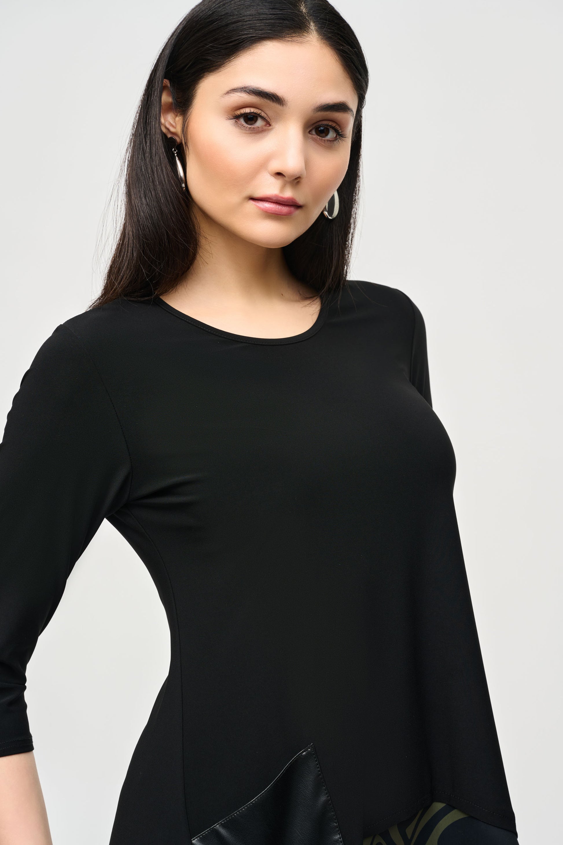 Comfort ed eleganza si fondono armoniosamente in questa splendida tunica in maglia effetto seta. Il capo, adornato da un accattivante stampa astratta, presenta una linea asimmetrica a trapezio e uno strato sottostante in tessuto a maglia che aggiunge dimensione al design. La tasca in similpelle dona un tocco audace, mentre le maniche a tre quarti e lo scollo rotondo emanano un fascino raffinato.