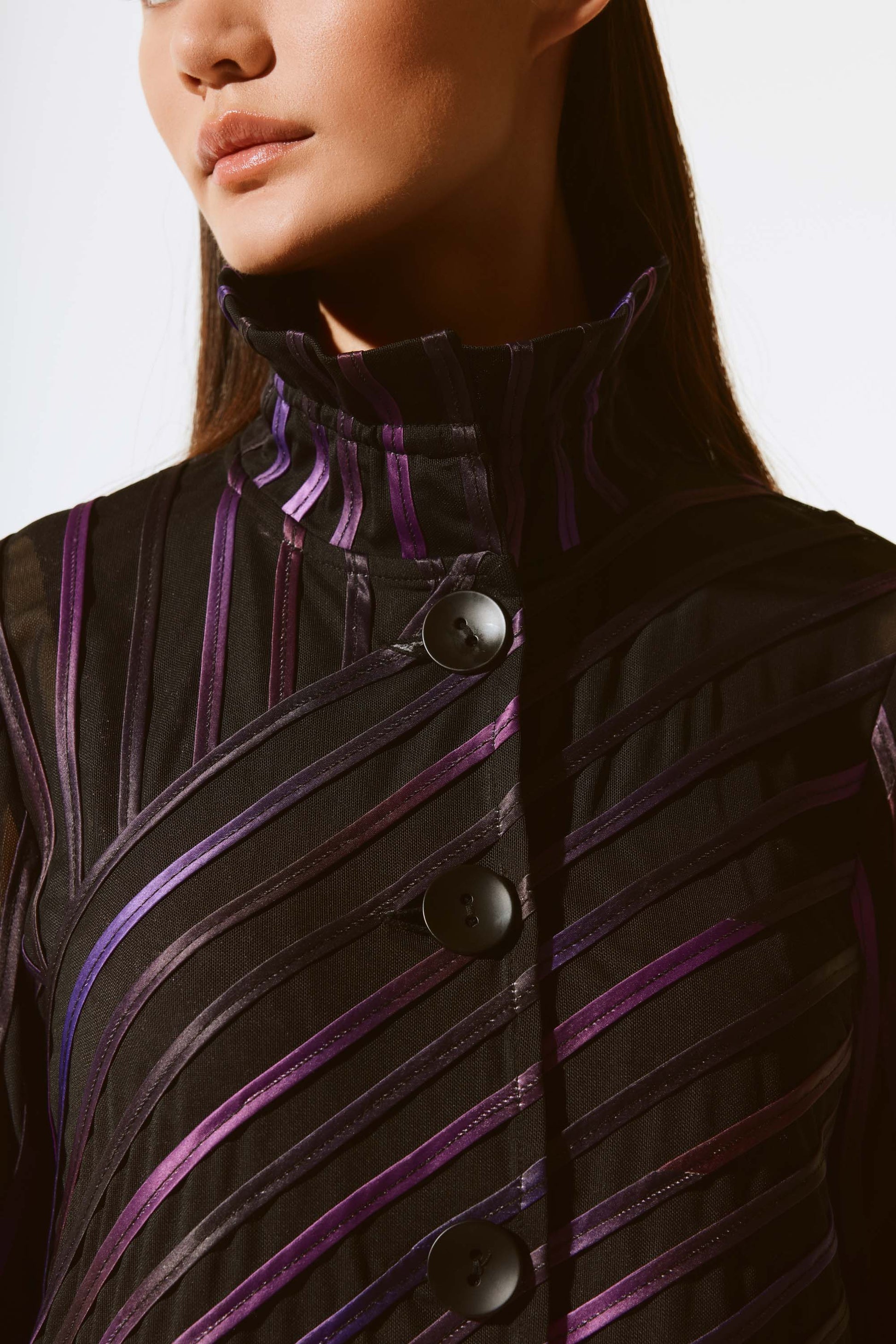 Questa straordinaria giacca presenta una stampa astratta decorativa che le conferisce un aspetto raffinato, oltre a un collo alto a lupetto e maniche a campana a tre quarti. Indossarla di donerà un aria di regalità.
