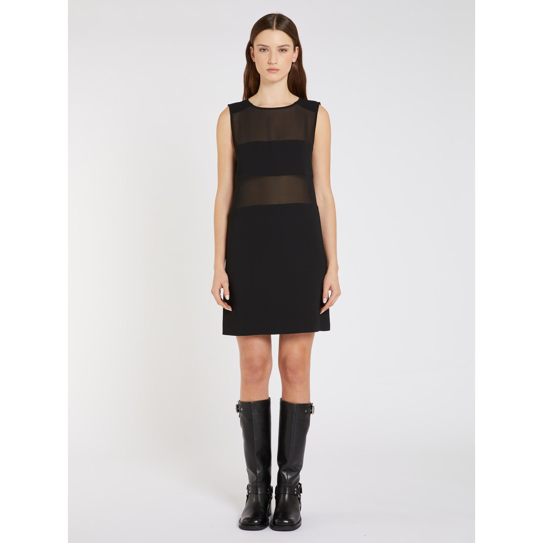 Essenziale nelle linee, sofisticato nei materiali: nuovo abito smanicato in envers satin, con pannelli orizzontali in georgette che creano un gioco sensuale di trasparenze sul busto.