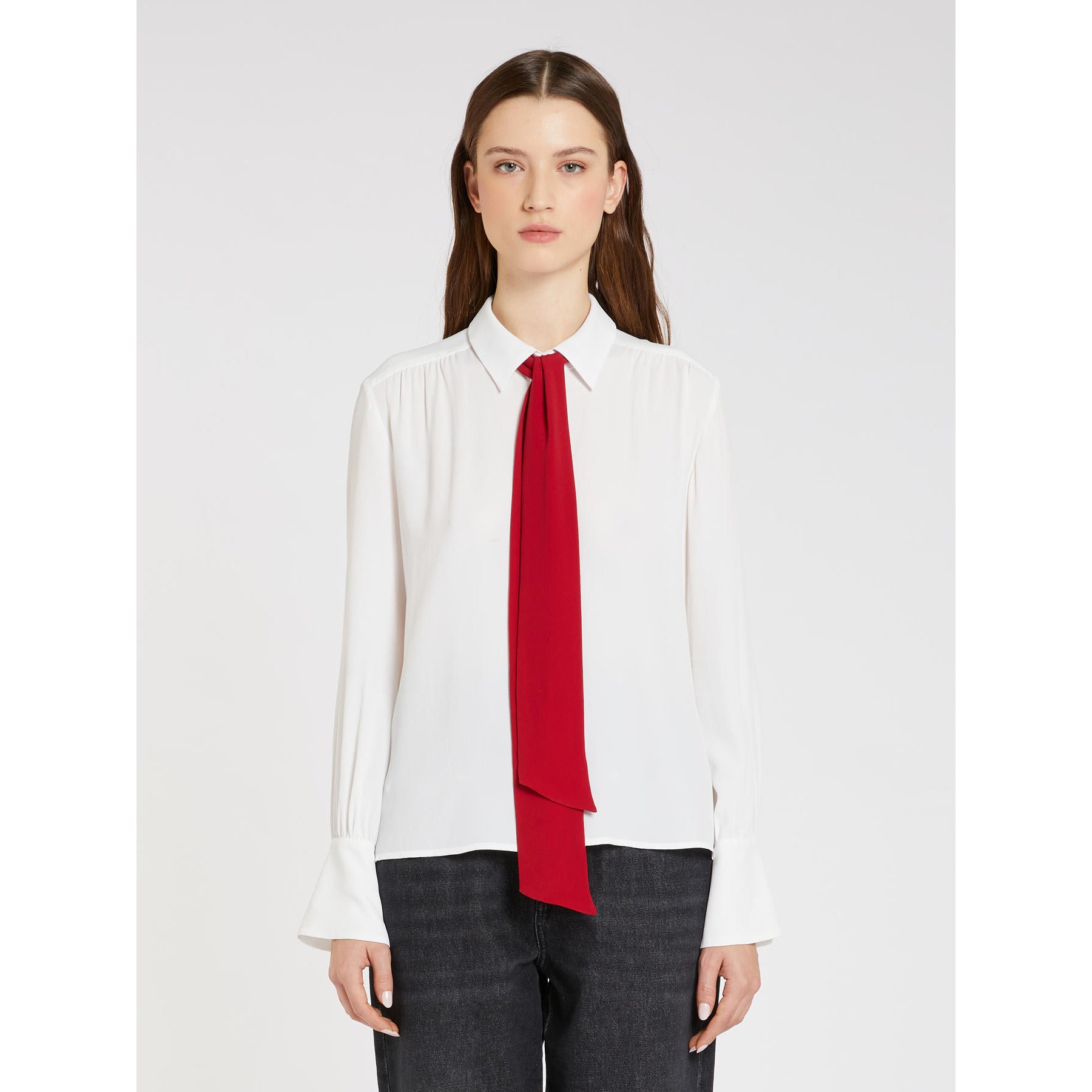 Colletto con sciarpina staccabile, maniche lunghe con polsini ampi e arricciati
