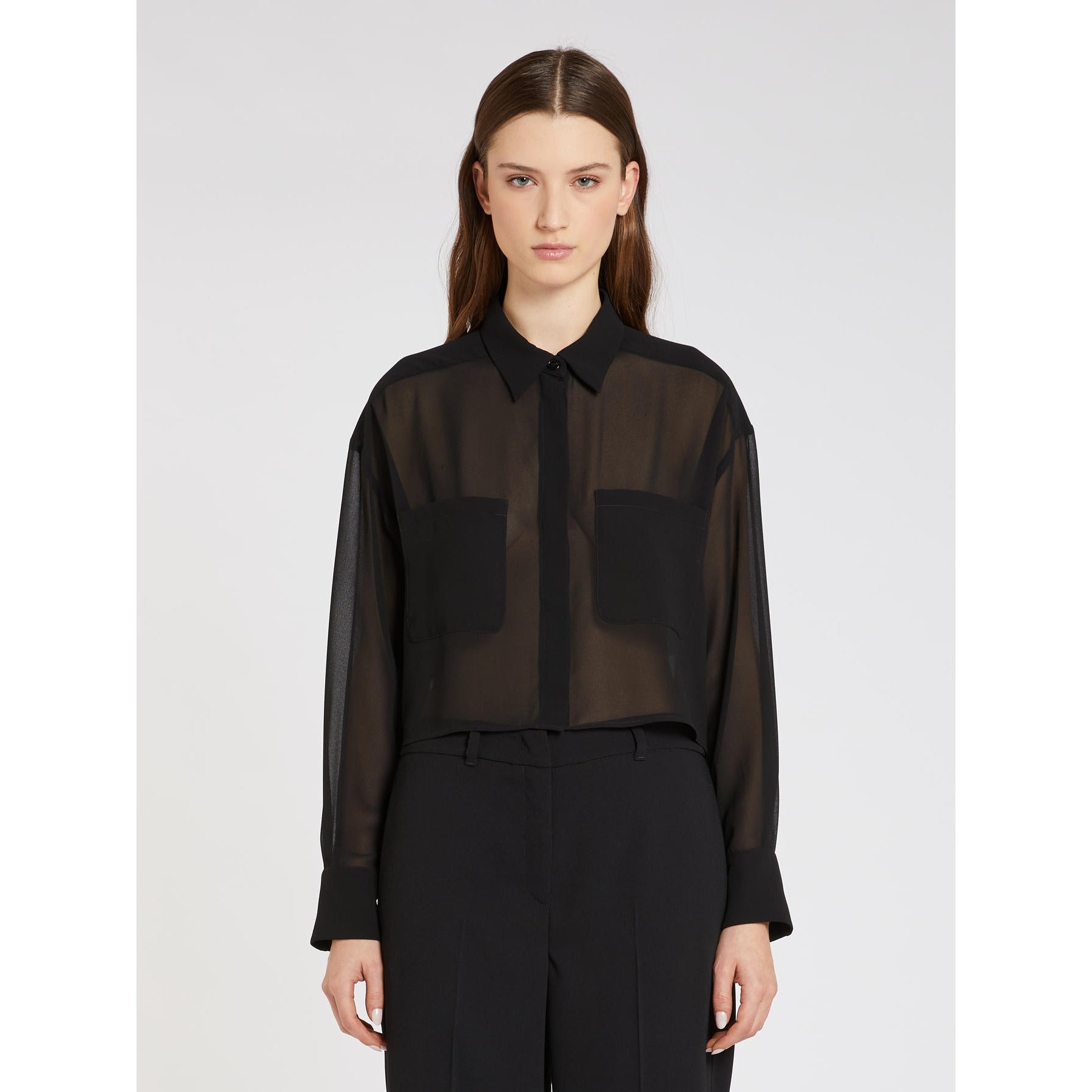 La leggerezza romantica della georgette crêpe regala un allure speciale a questa camicia. Il taglio si ispira ai modelli maschili, con bottoni coperti e tasche applicate sul davanti.