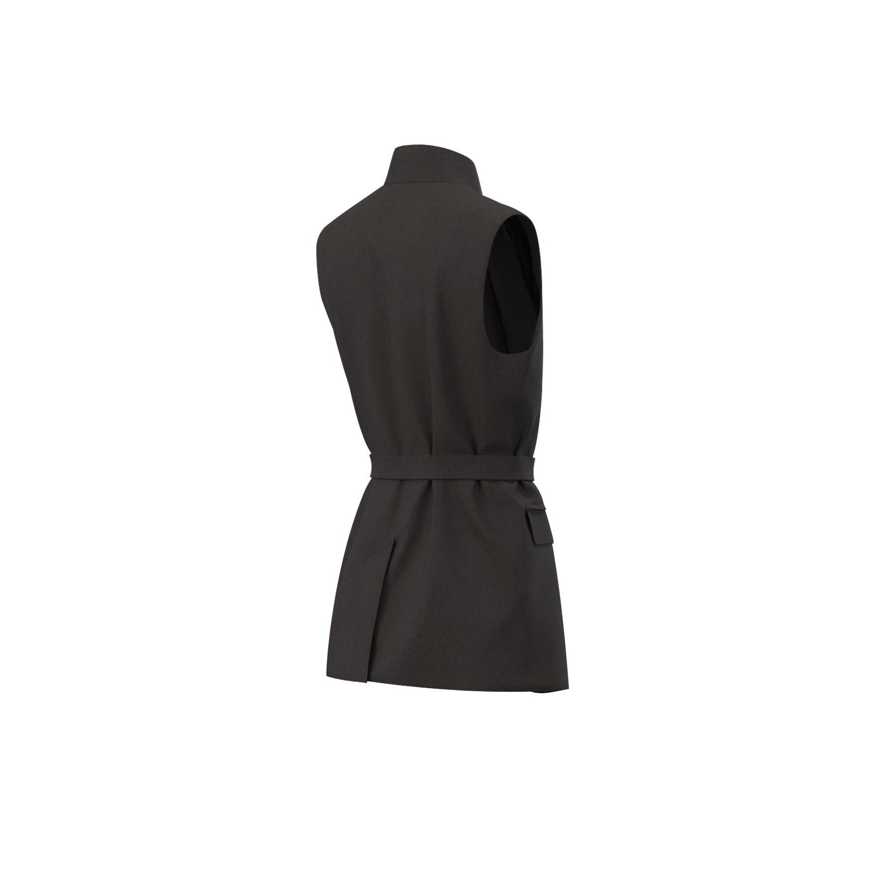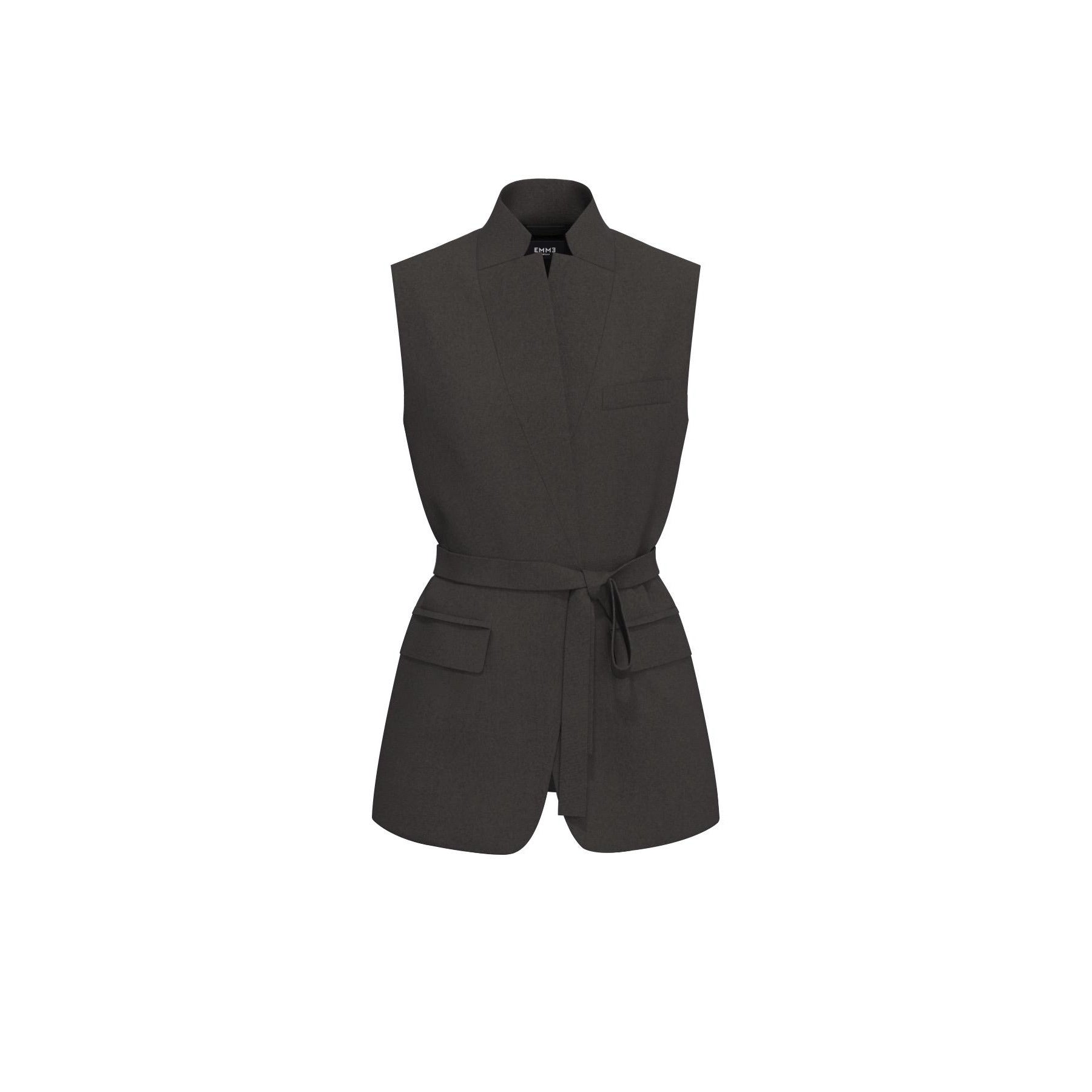 Il blazer smanicato in flanella leggera firma lo stile con il suo taglio dritto e il rever classico, mentre la cintura in vita disegna una nuova silhouette. Da indossare su camicie fluide o dolcevita leggeri, per un look stratificato dal gusto contemporaneo.