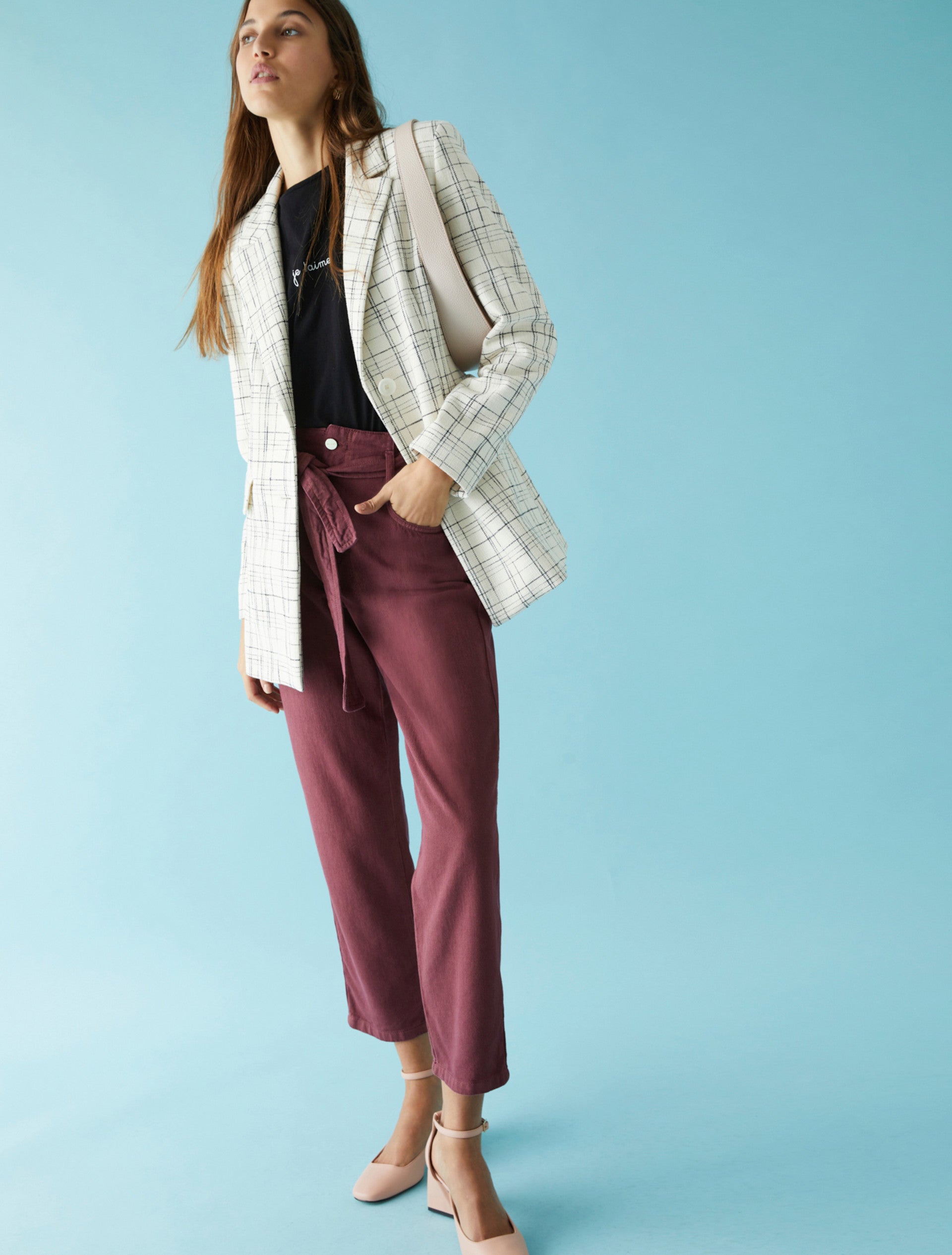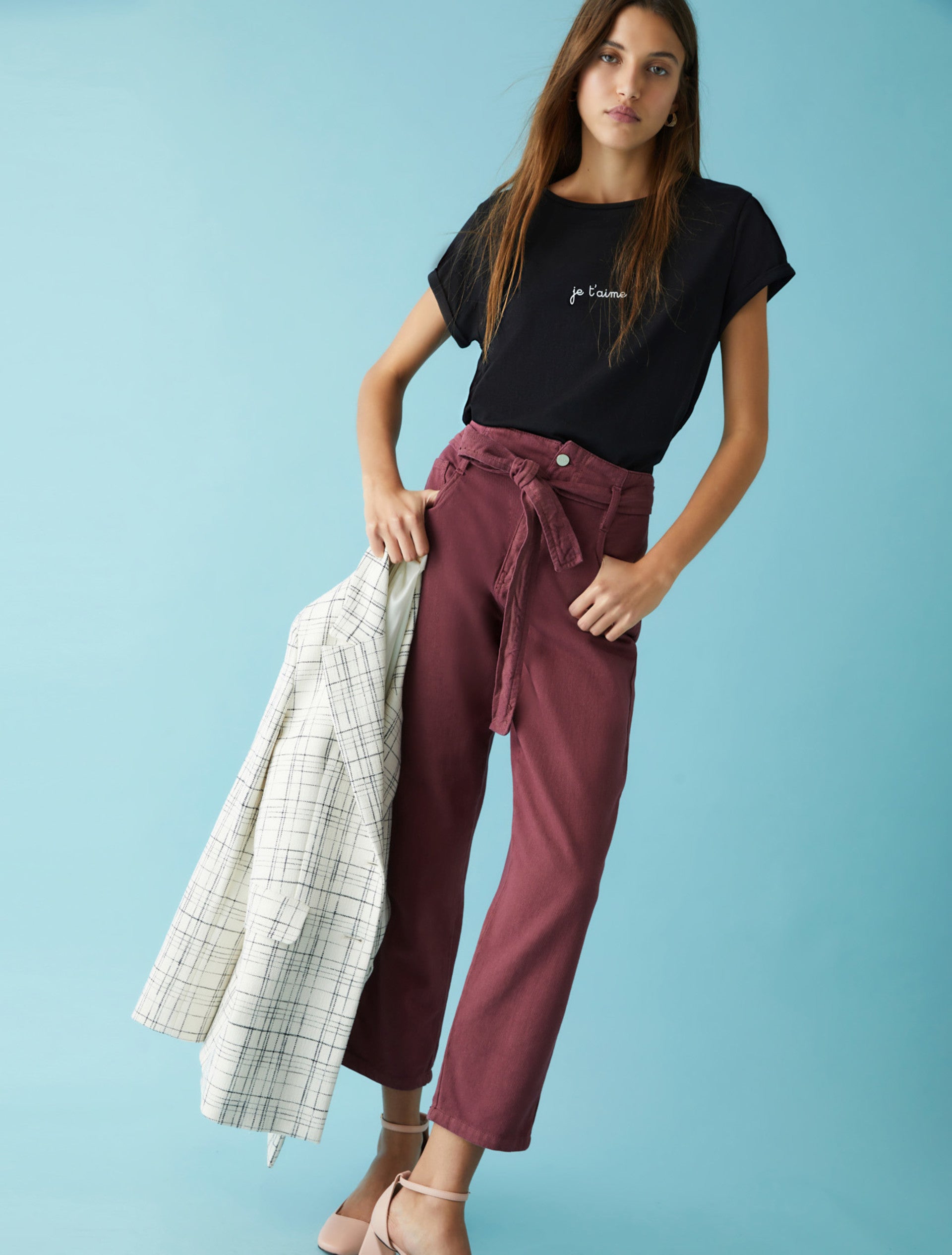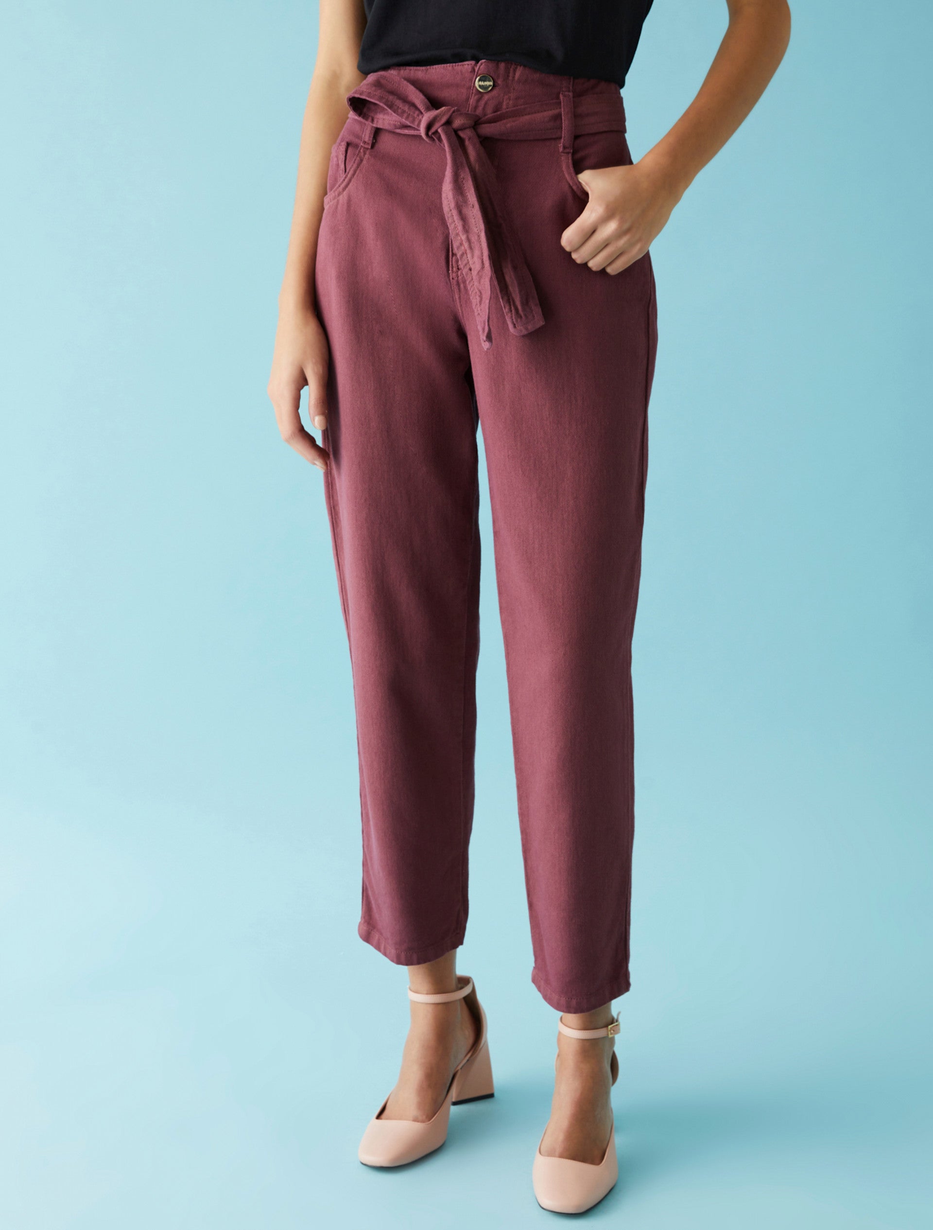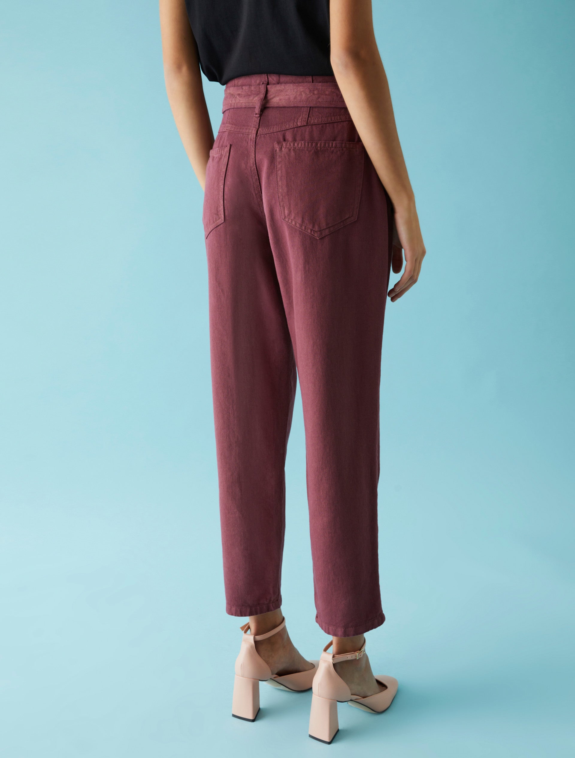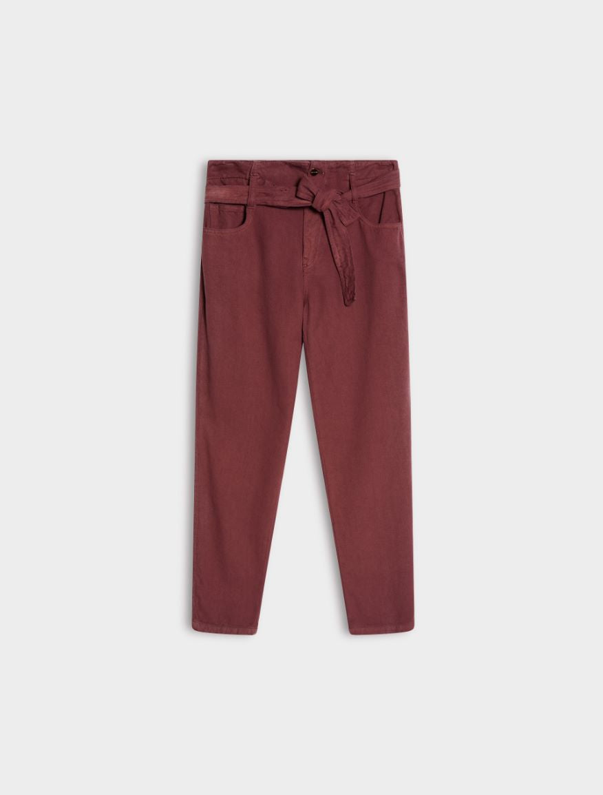 Pantaloni cinque tasche in tessuto misto cotone dalla linea carrot fit, chiusi con zip e bottone. Cintura in tessuto e vita alta. Tessuto contenente materie prime derivanti dalla cellulosa del legno, fibra ricavata nel rispetto del patrimonio forestale.