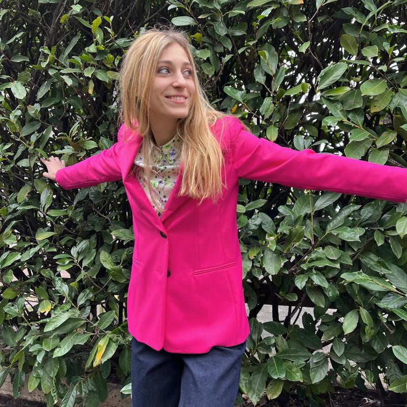 Blazer in tessuto stretch dalla linea sfiancata, foderato e chiuso con bottoni. Collo a rever e maniche lunghe. Tasche a filetto davanti.