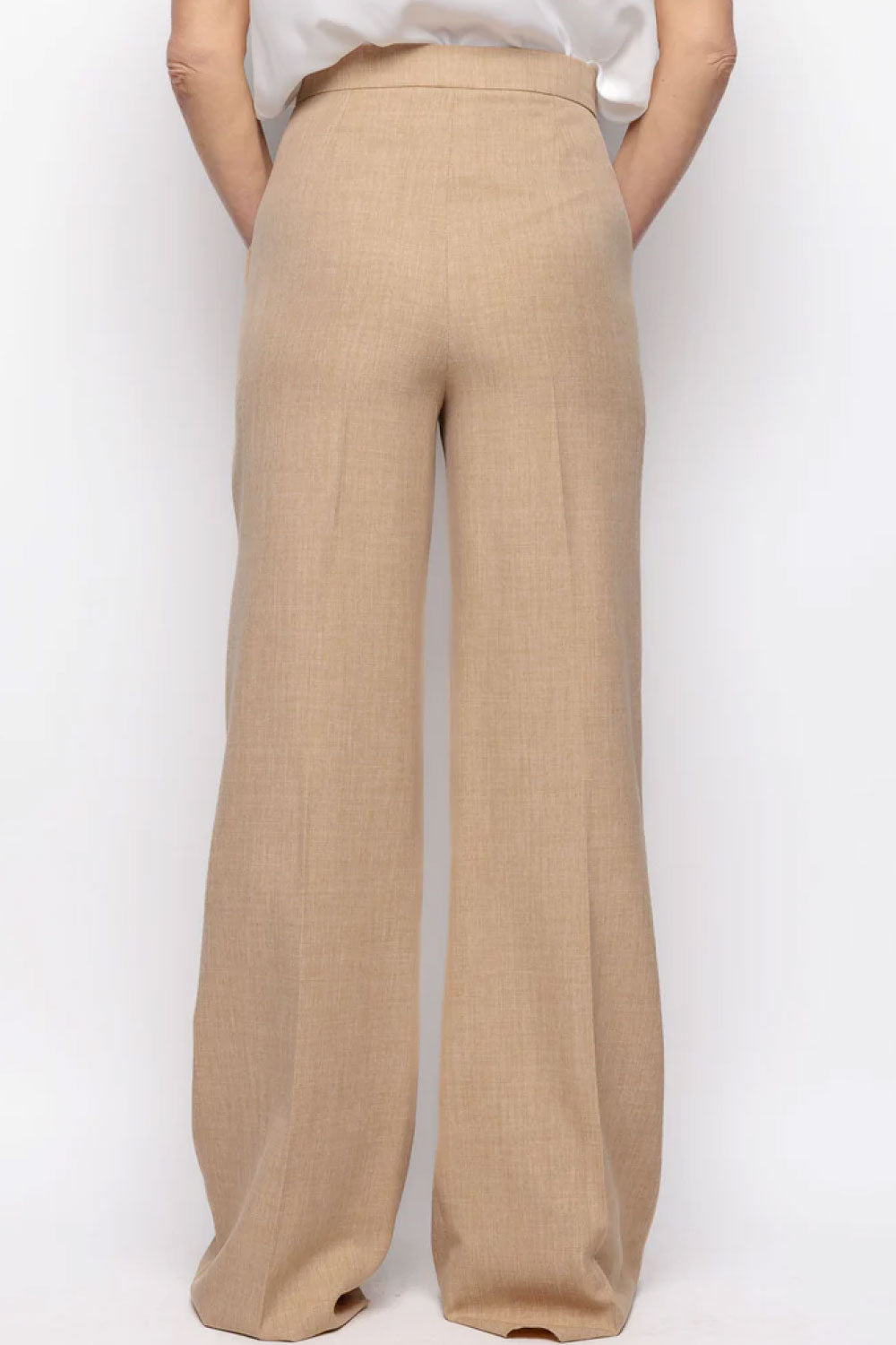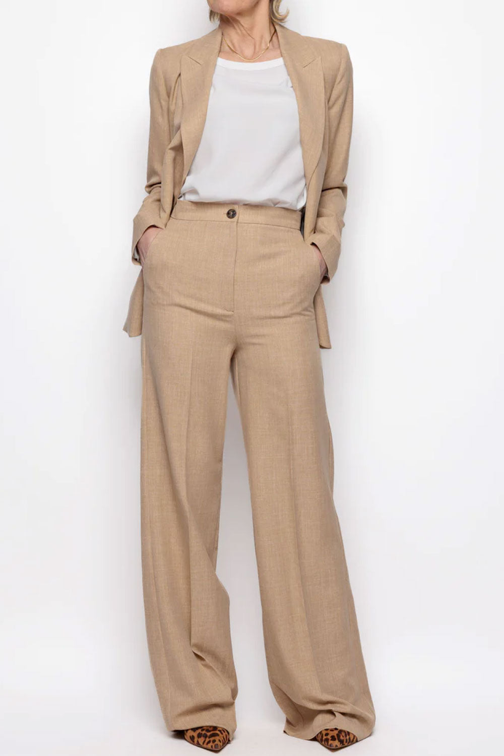 Questo pantalone beige in tela fiammata è perfetto per essere indossato con una camicia o una maglietta per un look casual e rilassato. Può essere abbinato a scarpe basse come sneakers o mocassini per un atmosfera informale, oppure a scarpe con tacco per un tocco più elegante.