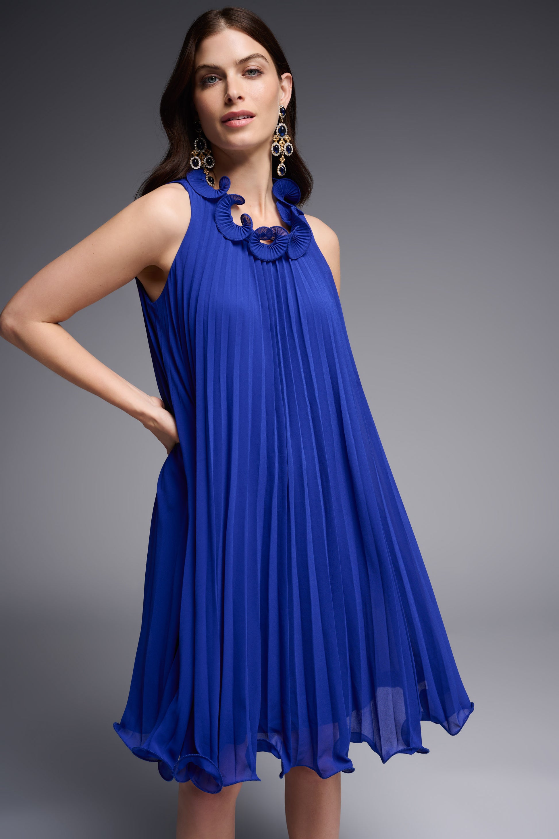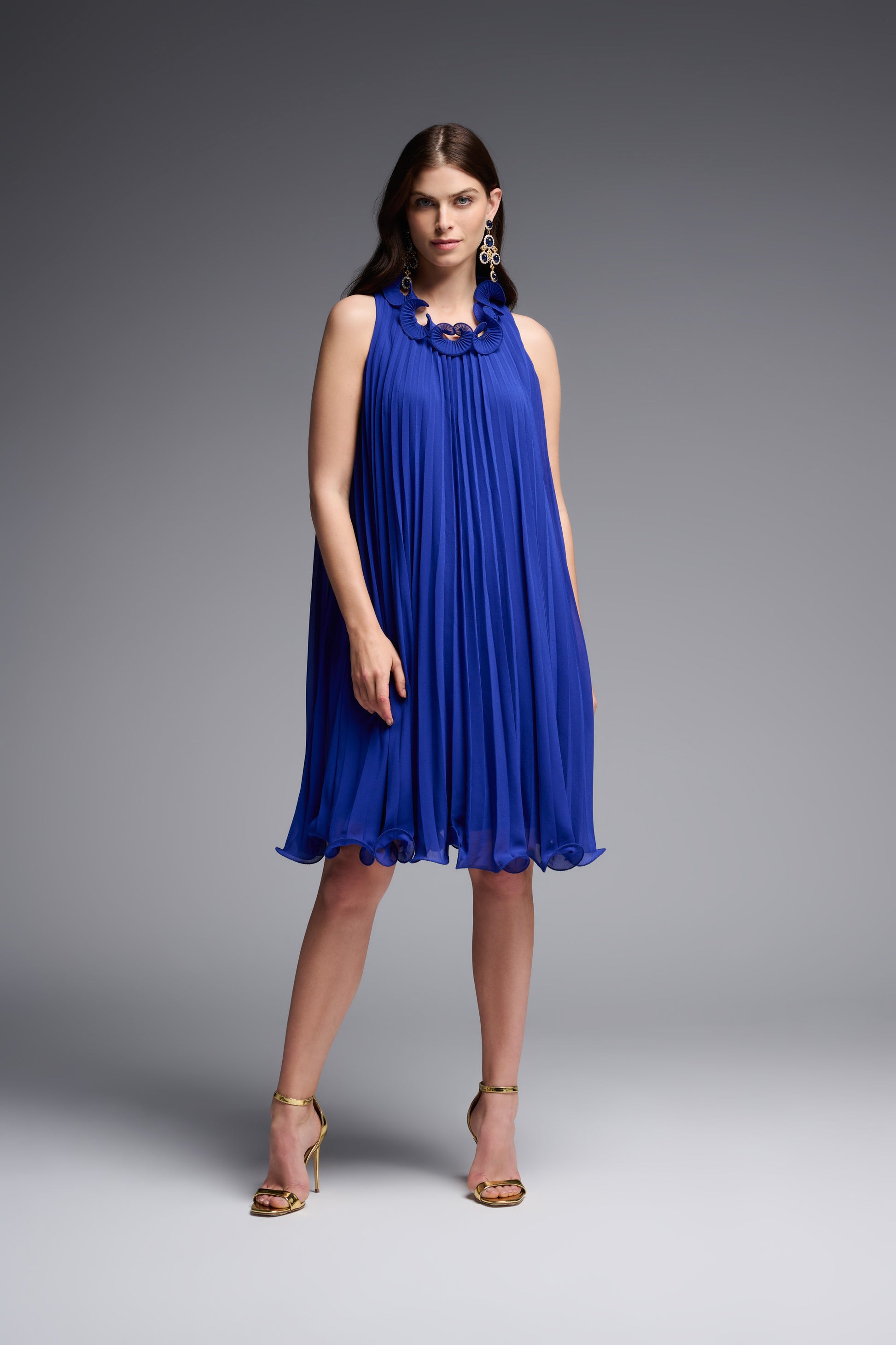 Rivela il tuo lato spiritoso. Quale modo migliore di esprimere te stessa se non con questo vivace abito a trapezio in chiffon? Realizzato in un leggero e vaporoso chiffon con un ariosa silhouette girocollo, questo abito senza maniche arriva al ginocchio. Un abito splendido con cui vorrai ballare tutta la notte.