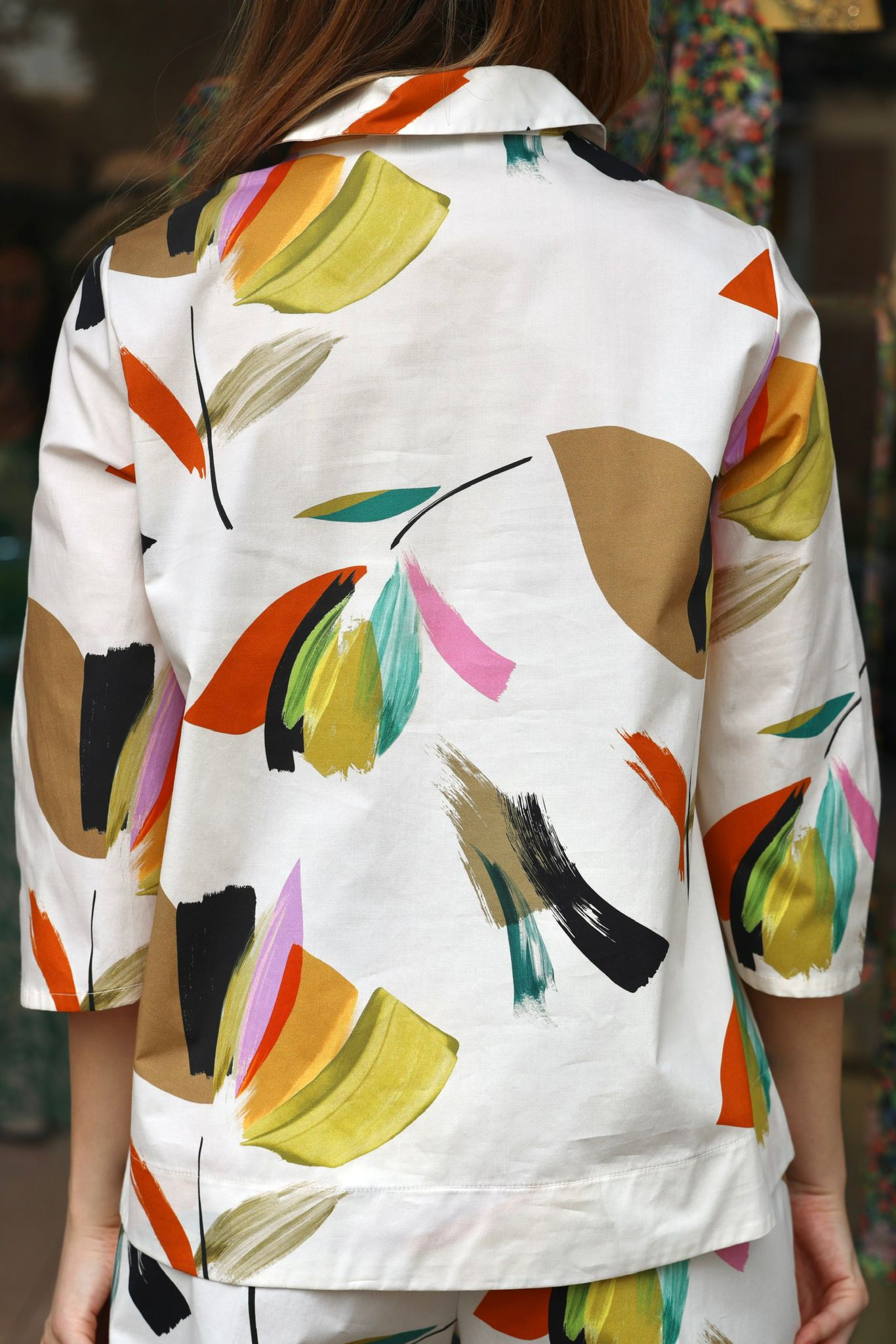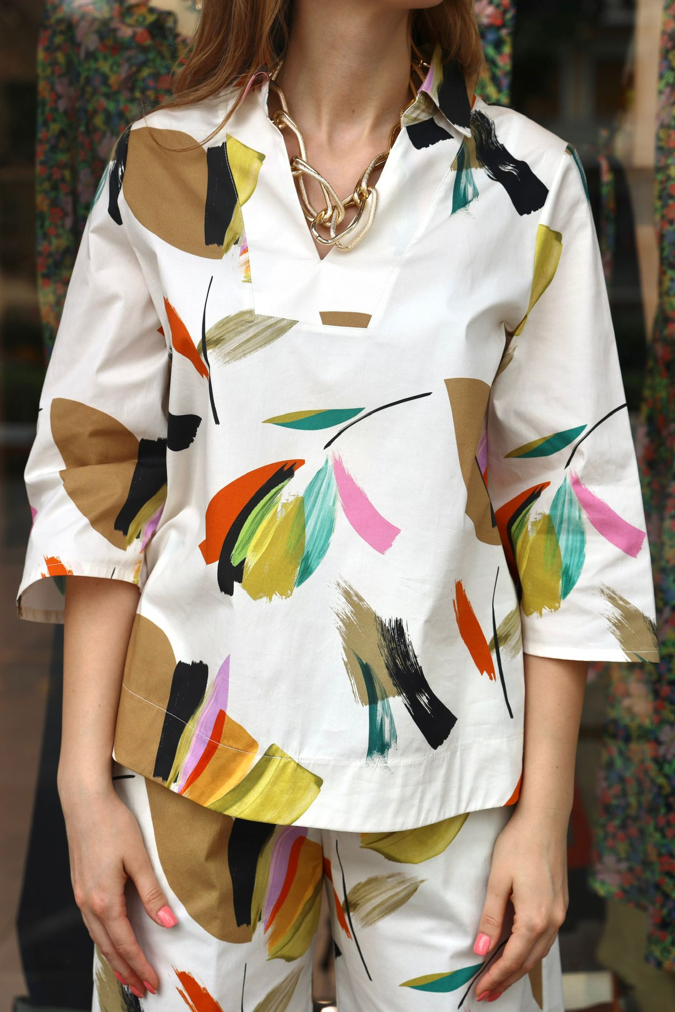 Blusa con collo a polo in popeline di cotone stretch con stampa floreale.