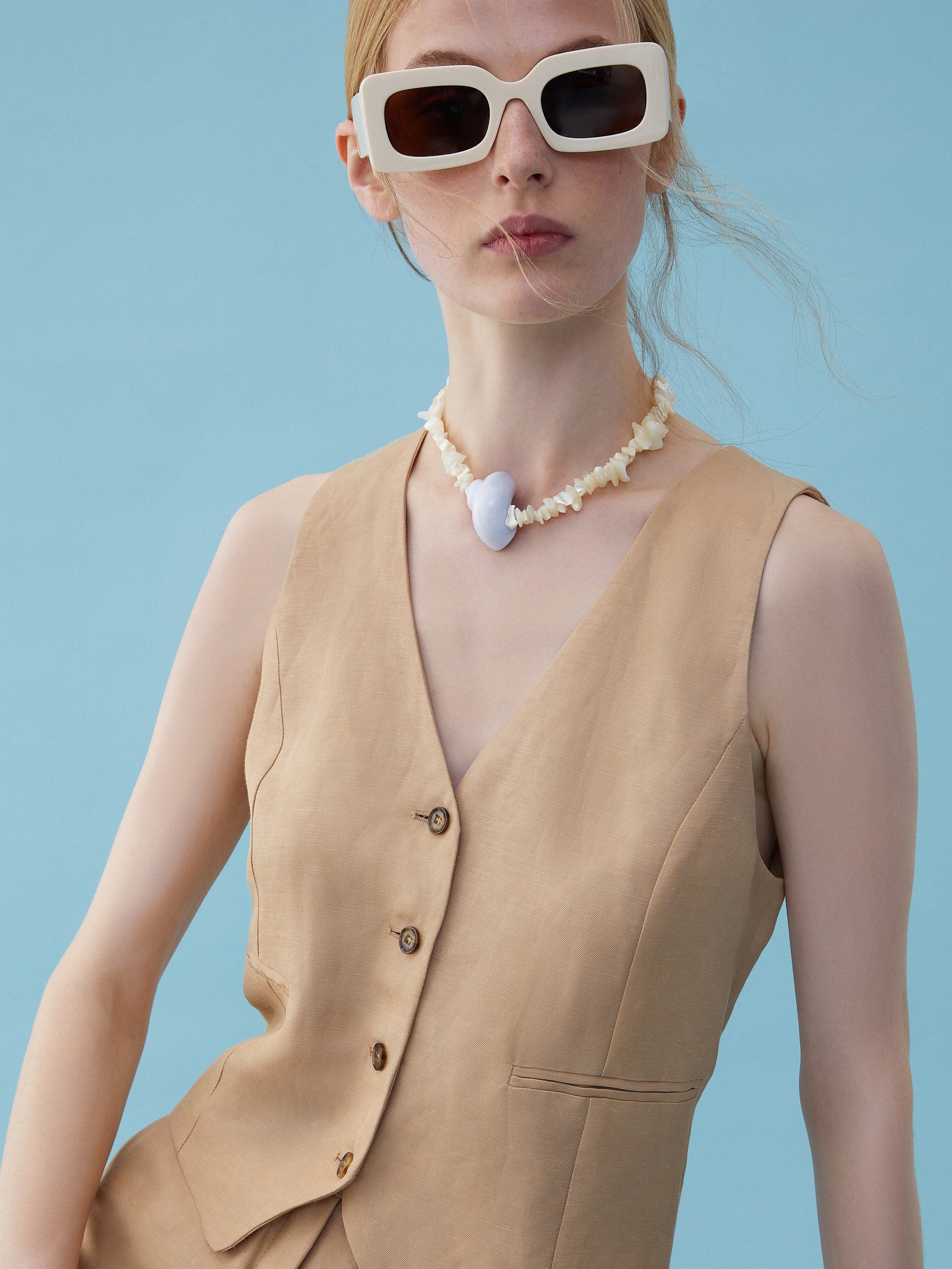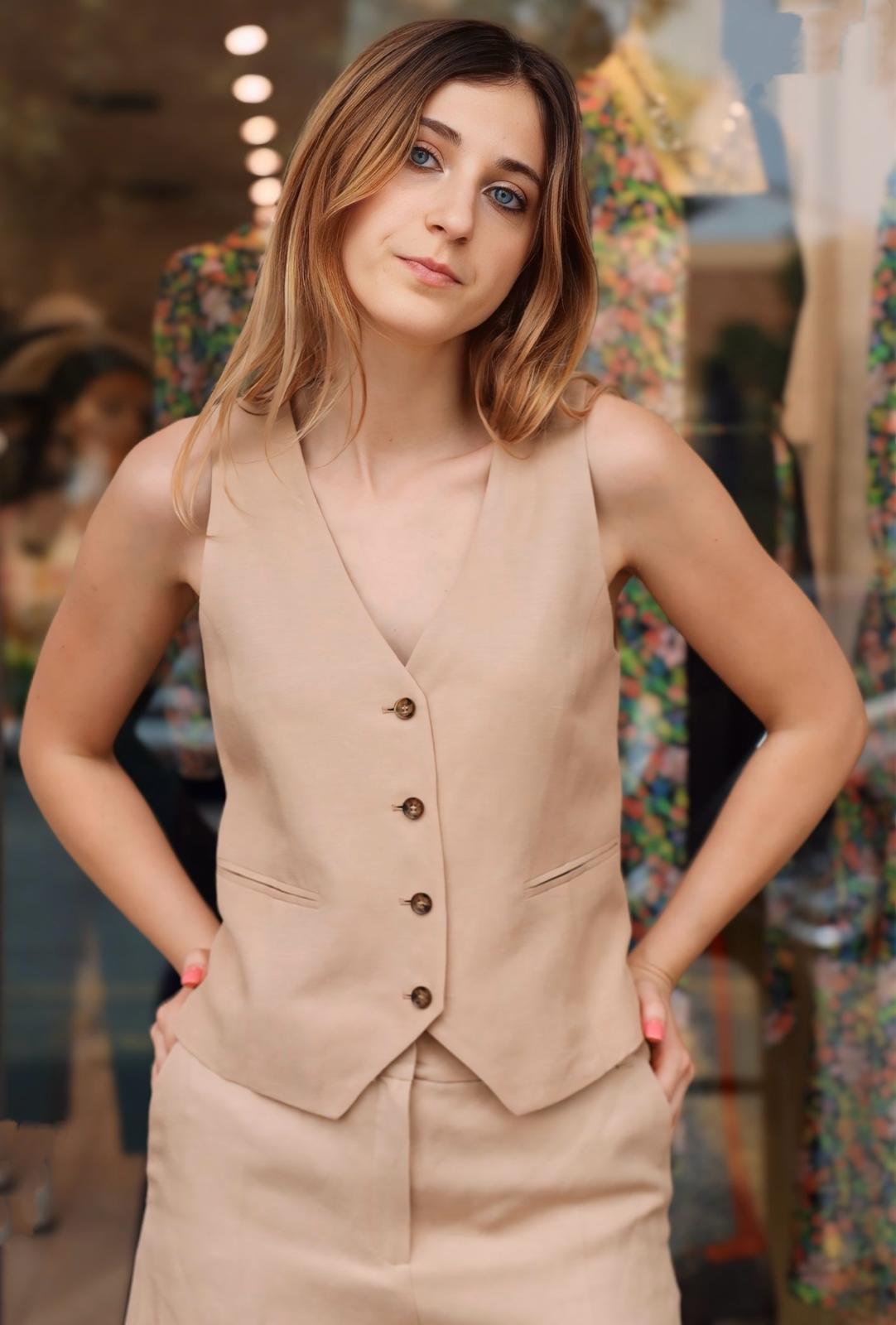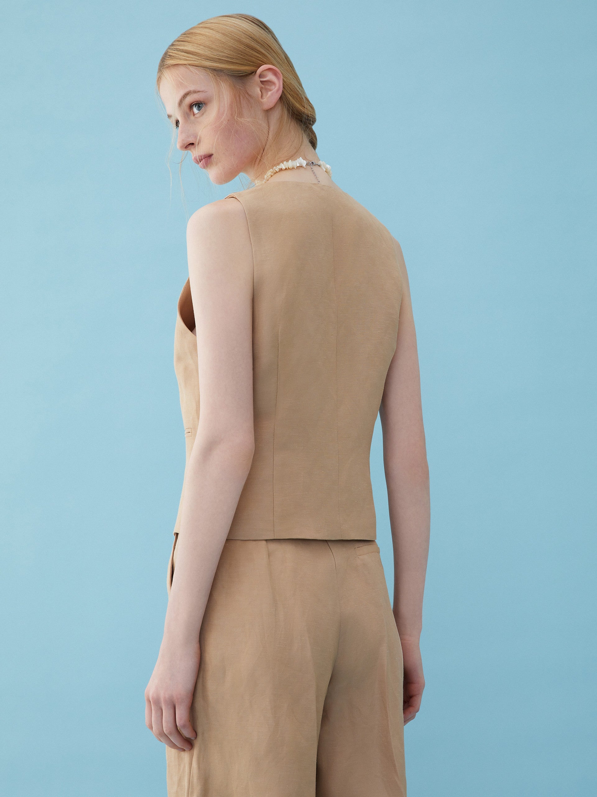 Gilet senza maniche in misto lino dalla linea sfiancata, foderato e chiuso con bottoni. Scollo a V e tasche a filetto davanti.