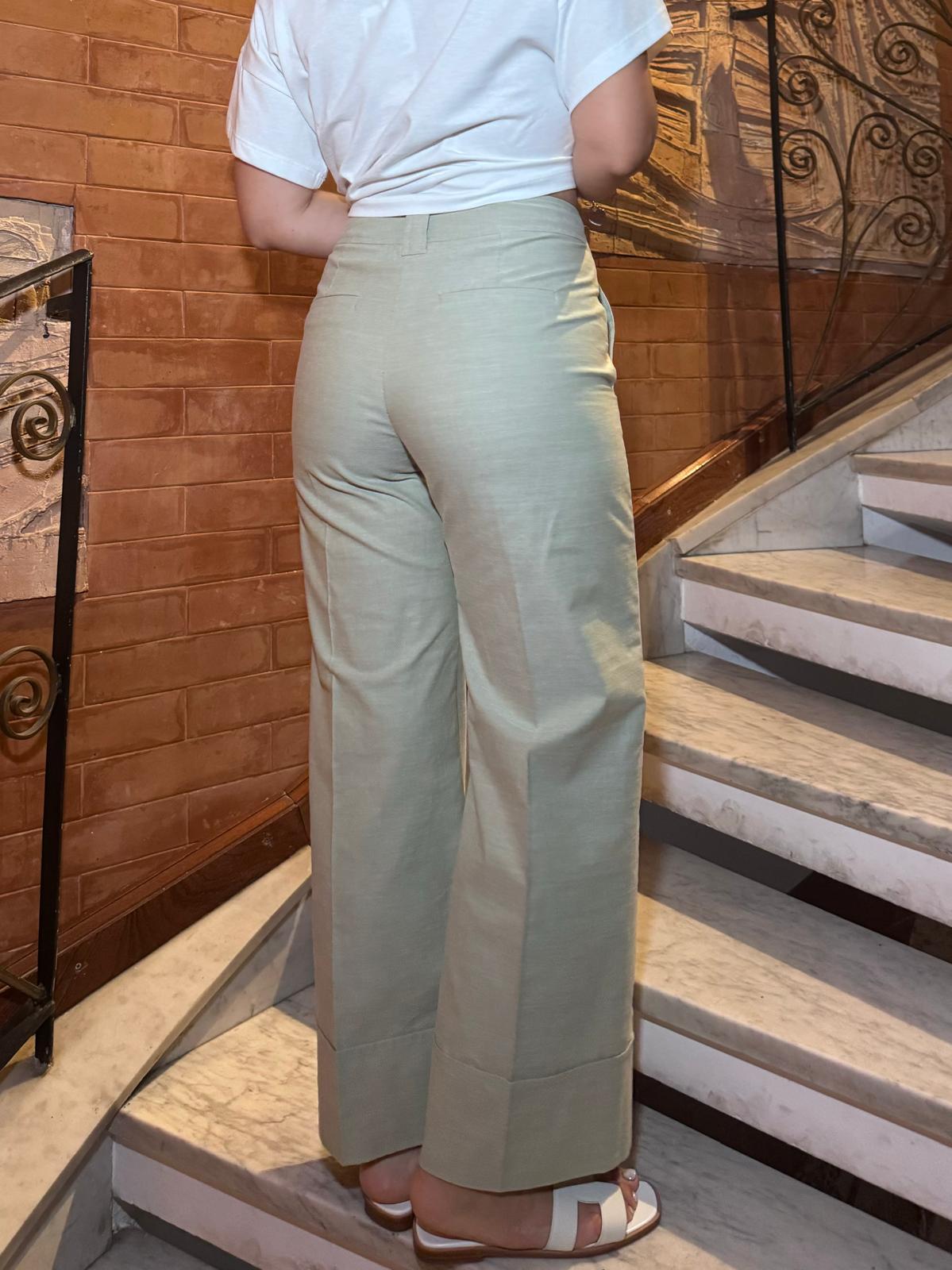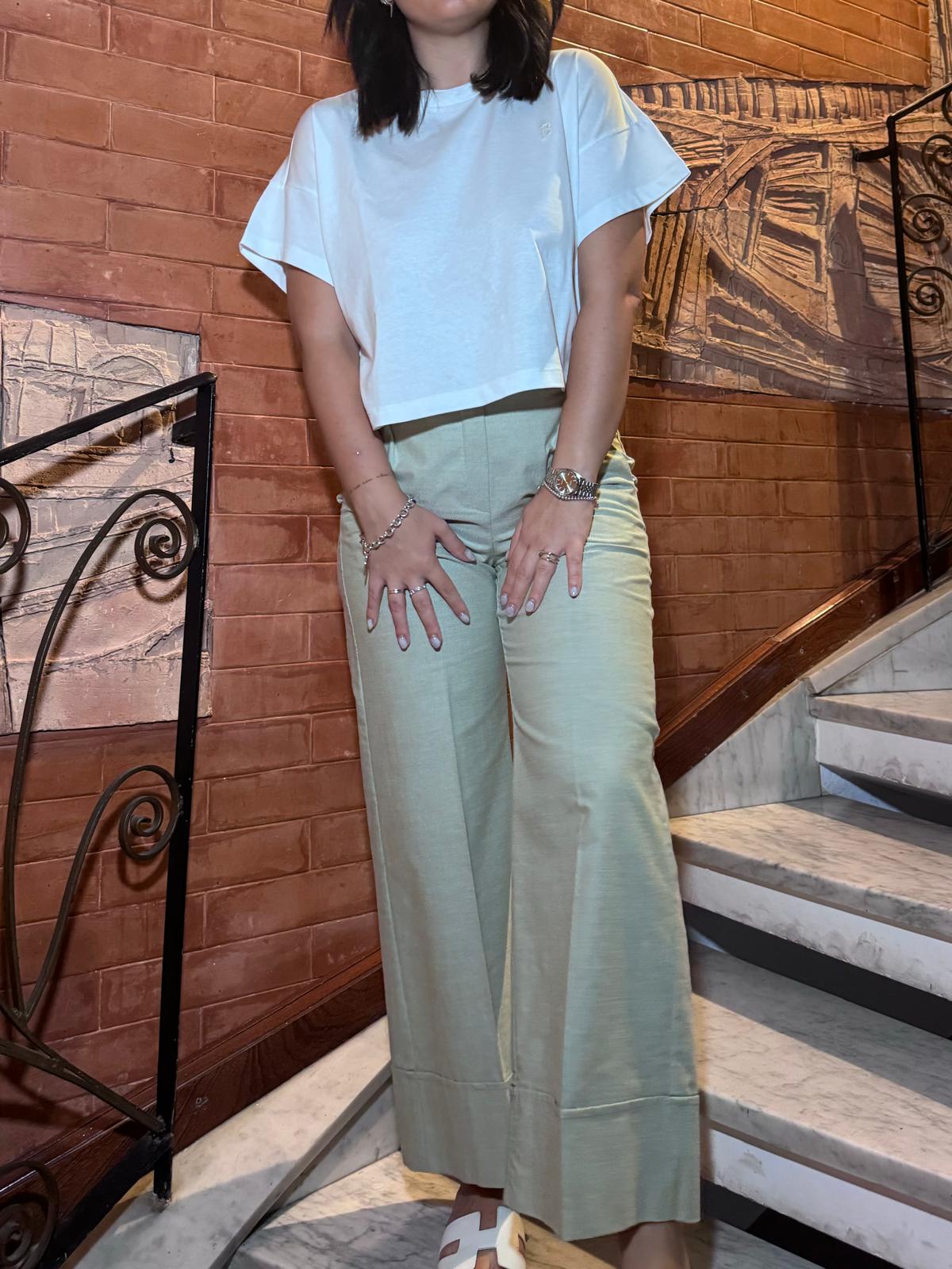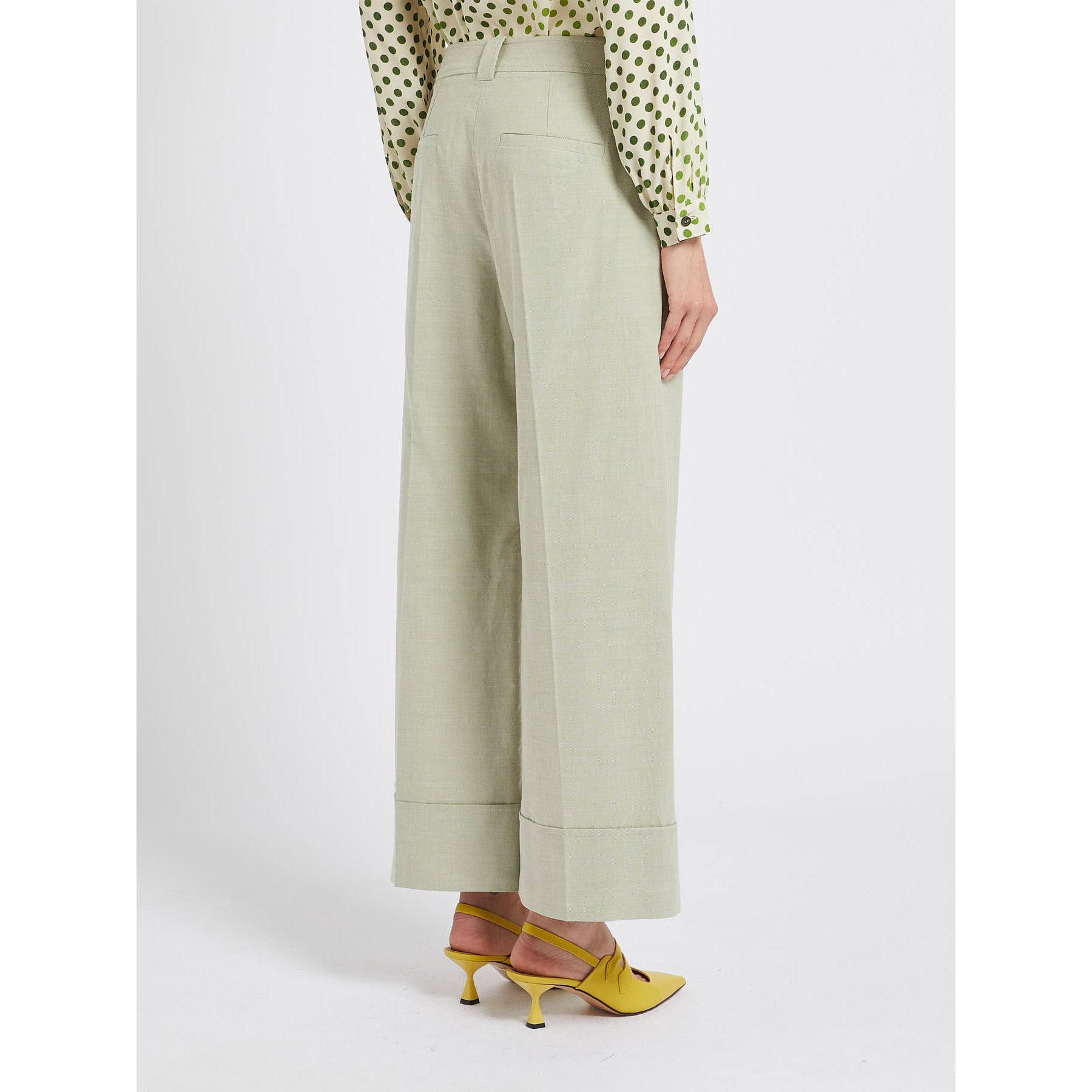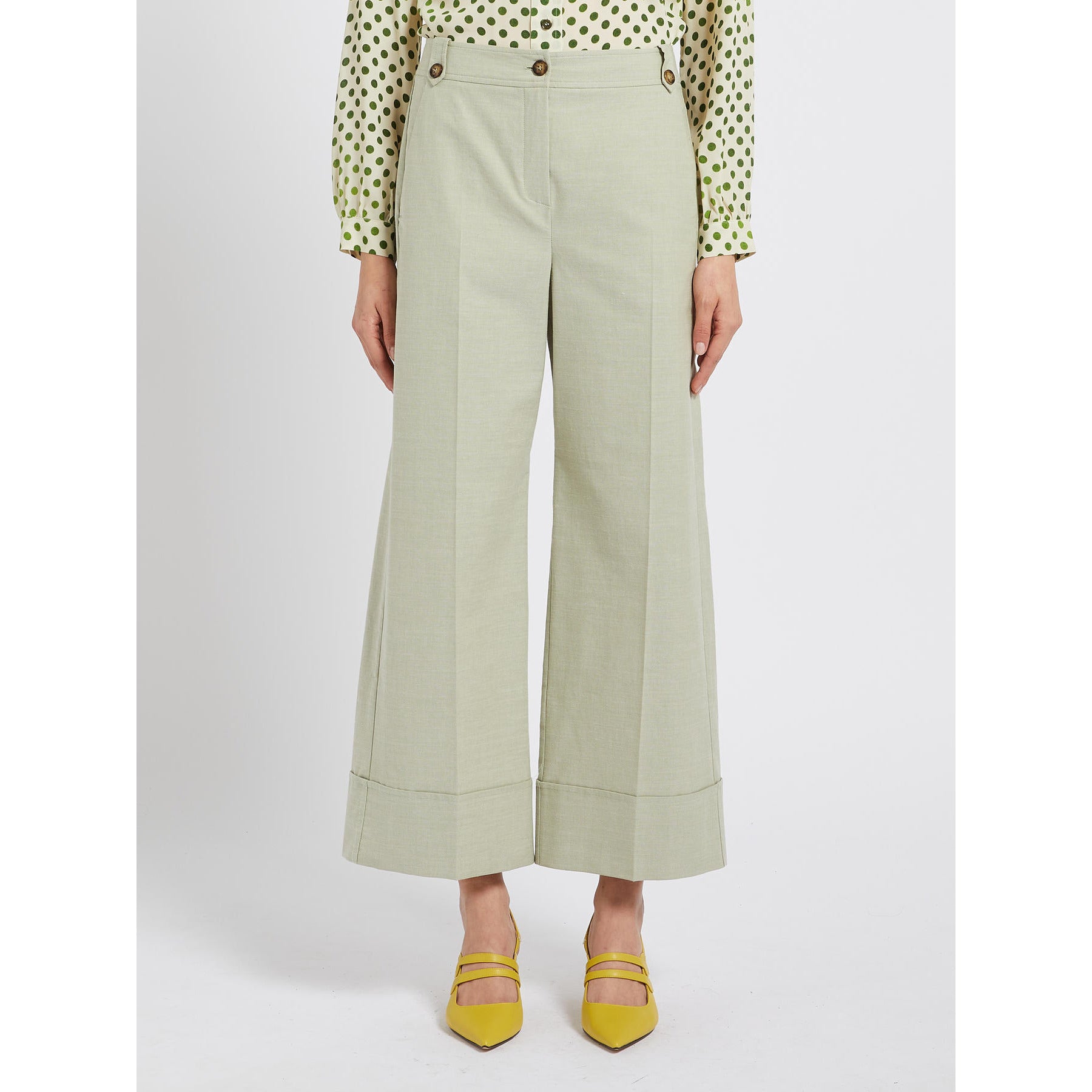 Pantaloni in misto cotone stretch dalla linea cropped, chiusi con gancio e zip nascosta. Tasche alla francese davanti e a filetto dietro. Fondo con risvolto e piega stirata davanti e dietro.
