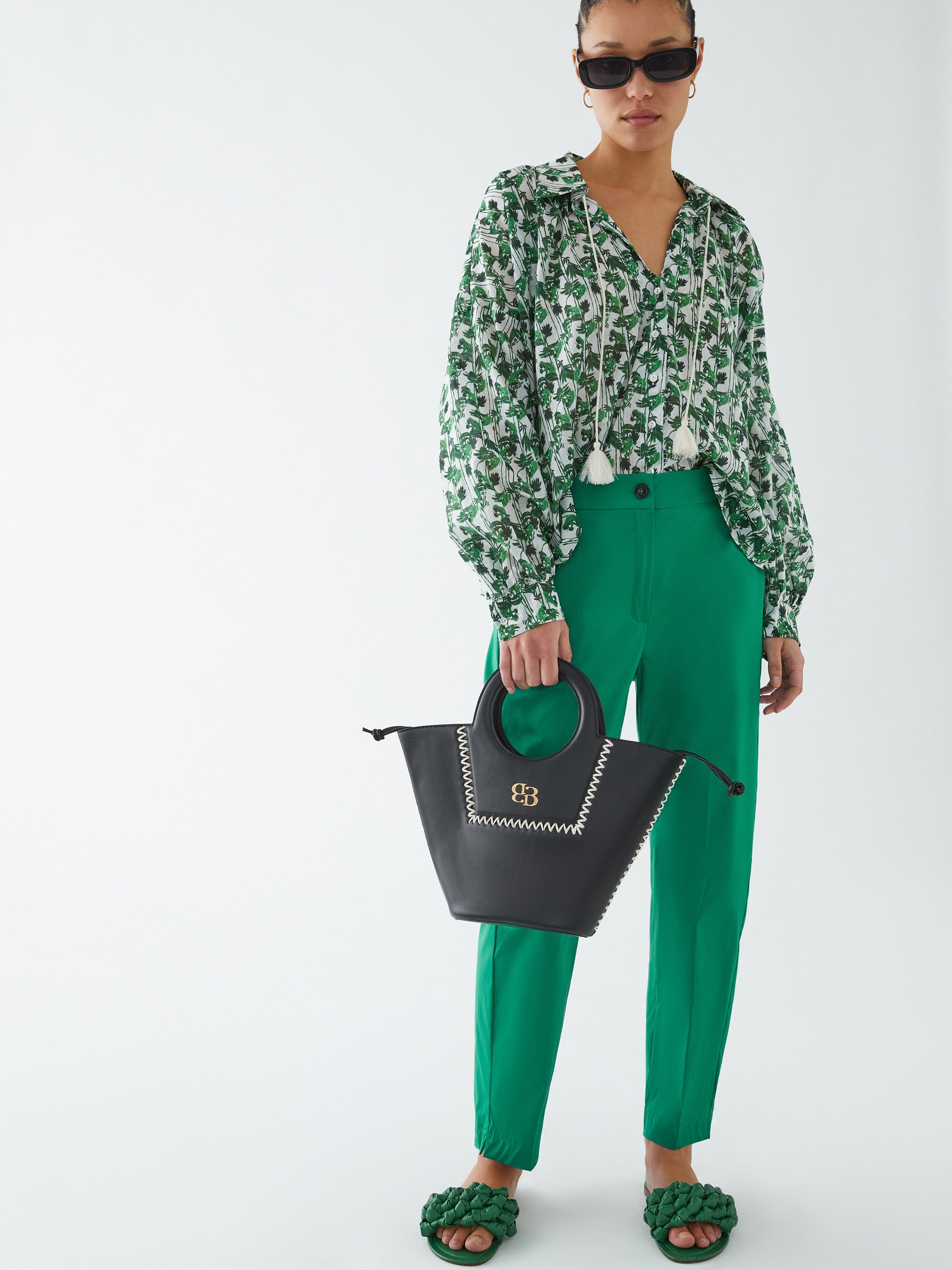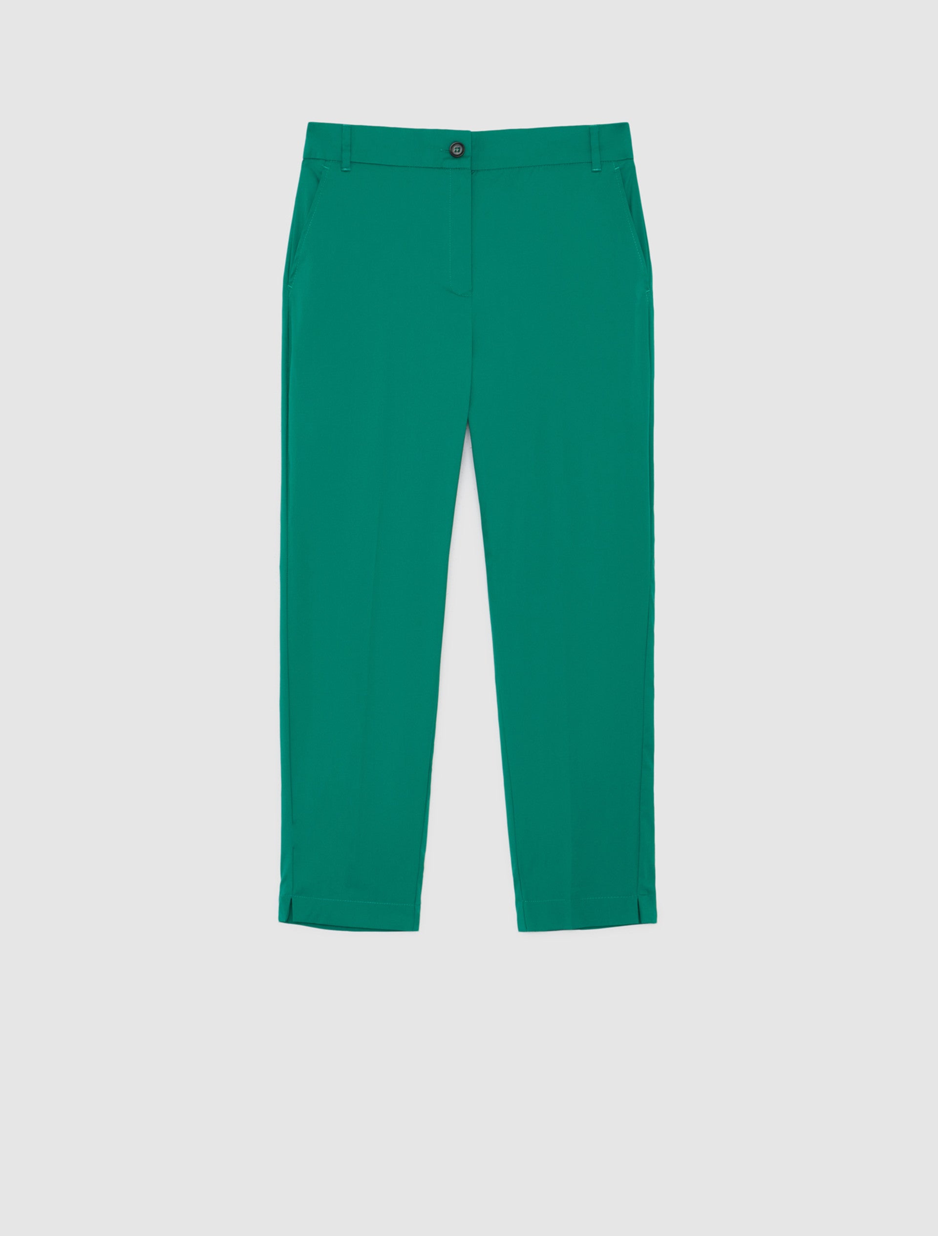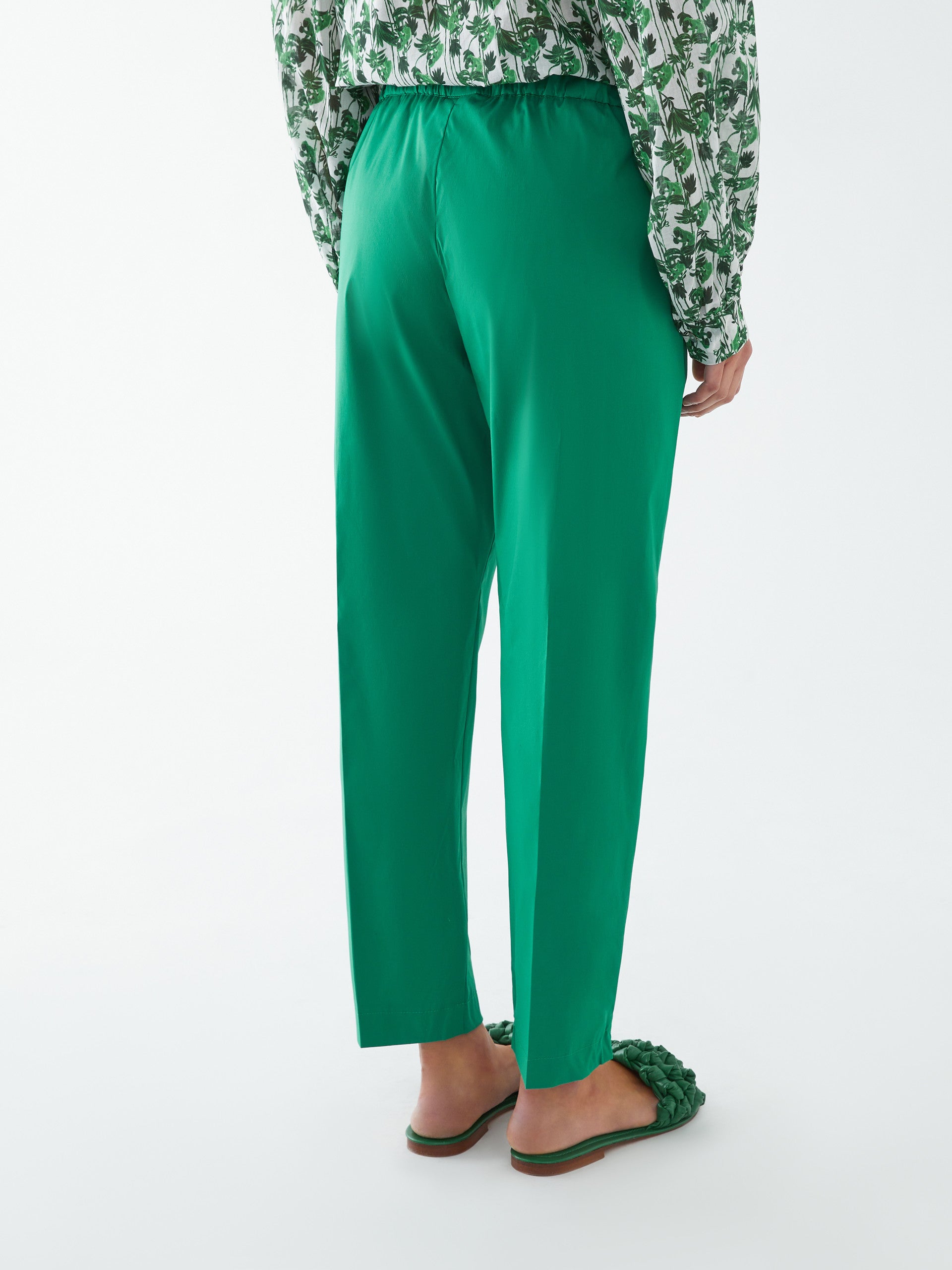 Pantaloni in popeline misto cotone stretch dalla linea semiaderente, chiusi con zip nascosta e bottone. Vita con elastico e tasche alla francese. Piega stirata e spacchetti sul fondo. Tessuto contenente cotone proveniente da una catena di fornitori impegnati in un’agricoltura a basso impatto ambientale.