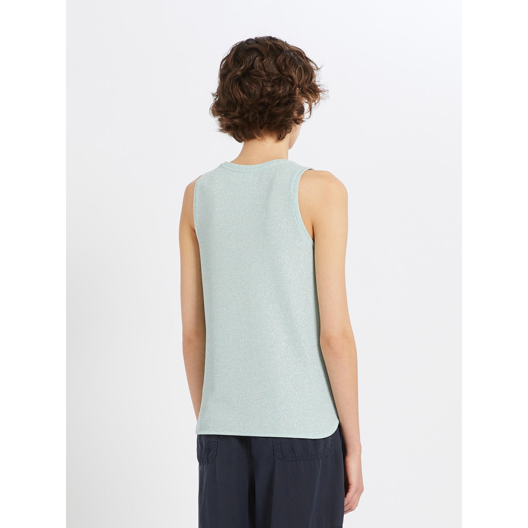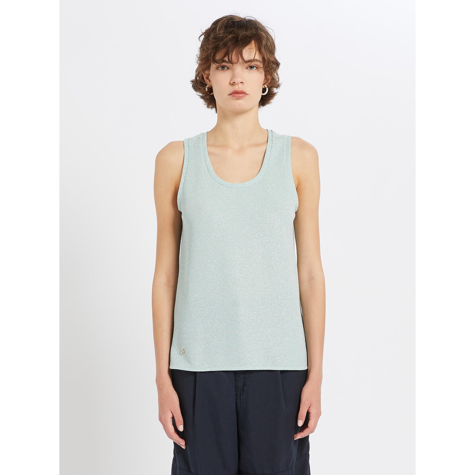 Top senza maniche in jersey stretch con lurex. Linea semiaderente e lavorazione a coste. Charm con logo iBlues applicato sul fondo.