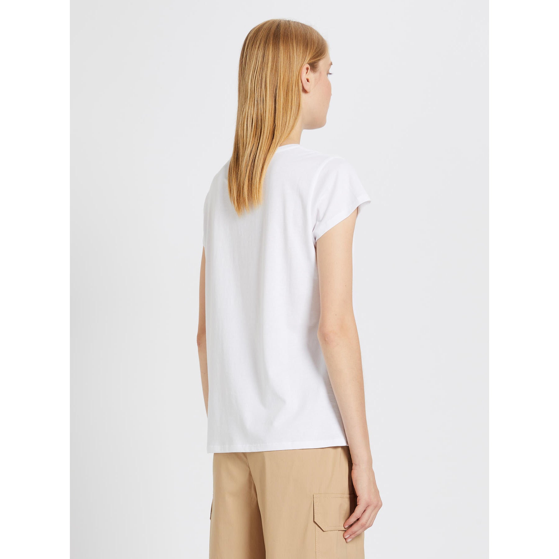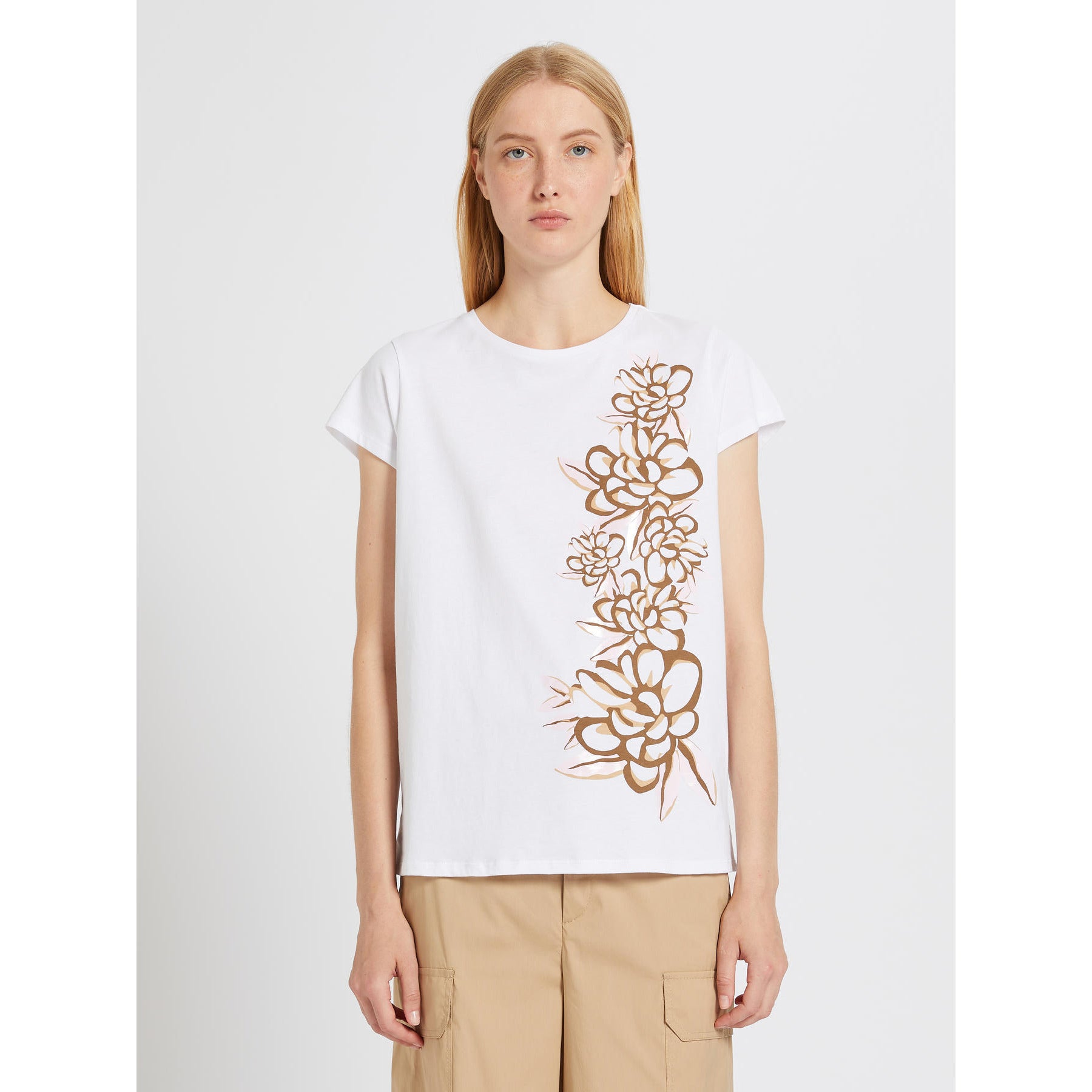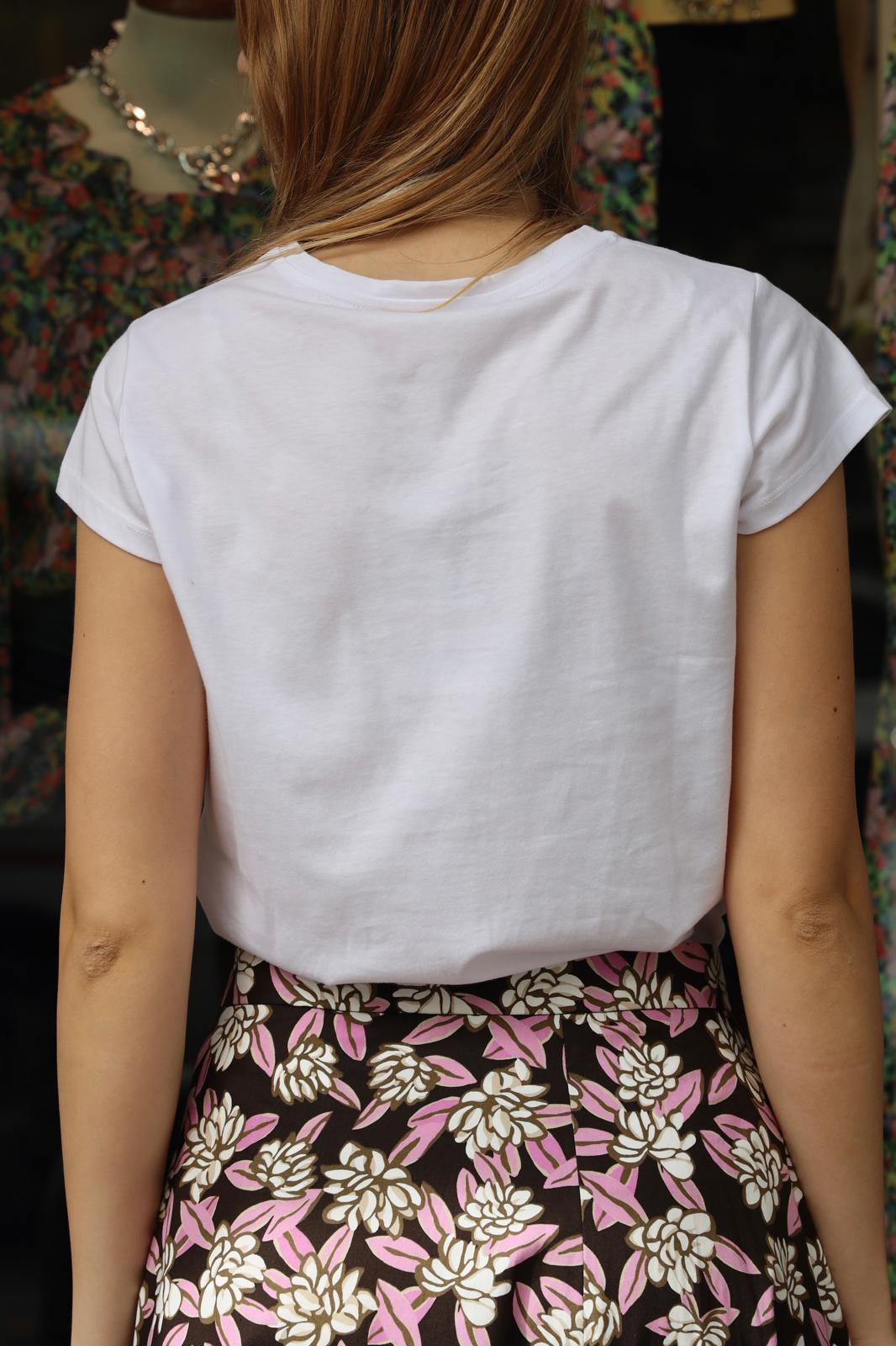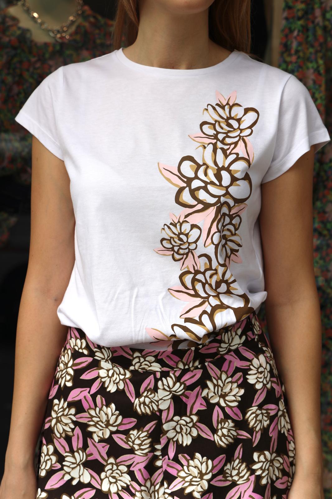 T-shirt girocollo in jersey stampato e ricamato dalla linea morbida. Maniche corte.