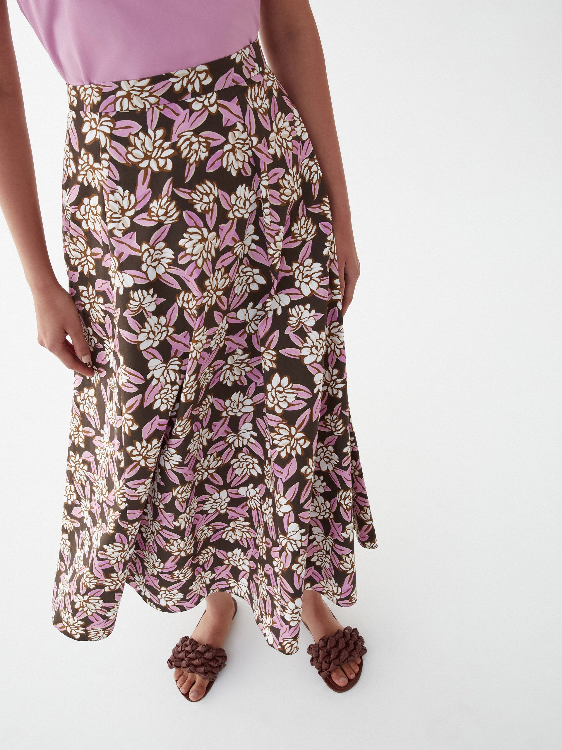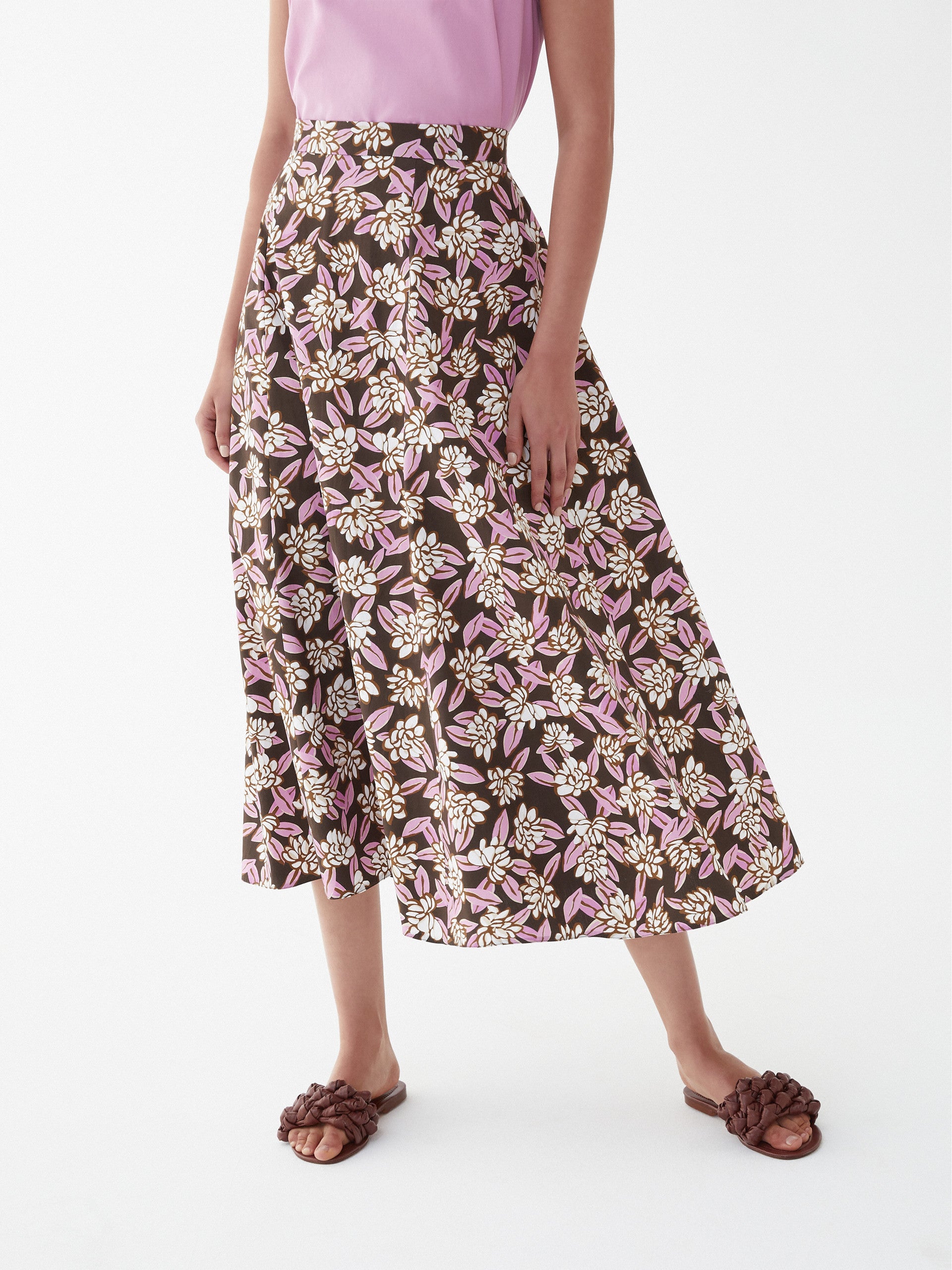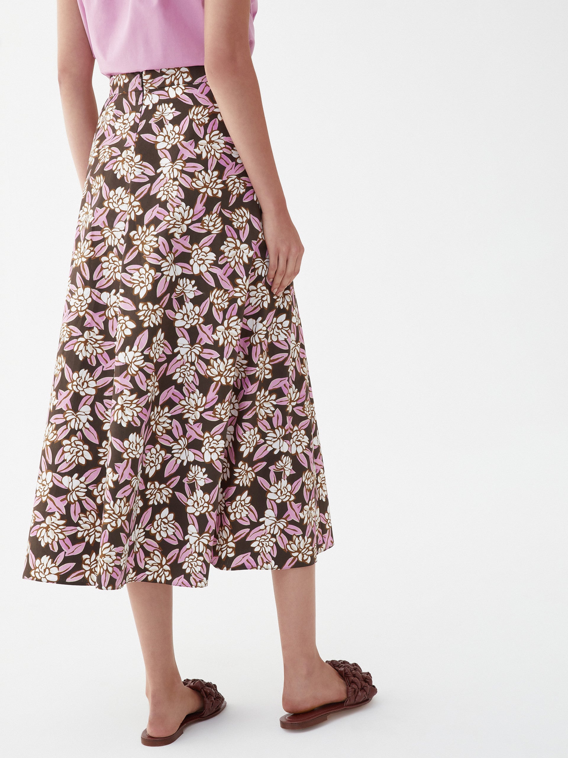 Gonna lunga in popeline di cotone stampato dalla linea svasata, chiusa con zip sul retro. Tessuto contenente cotone proveniente da una catena di fornitori impegnati in un’agricoltura a basso impatto ambientale.
