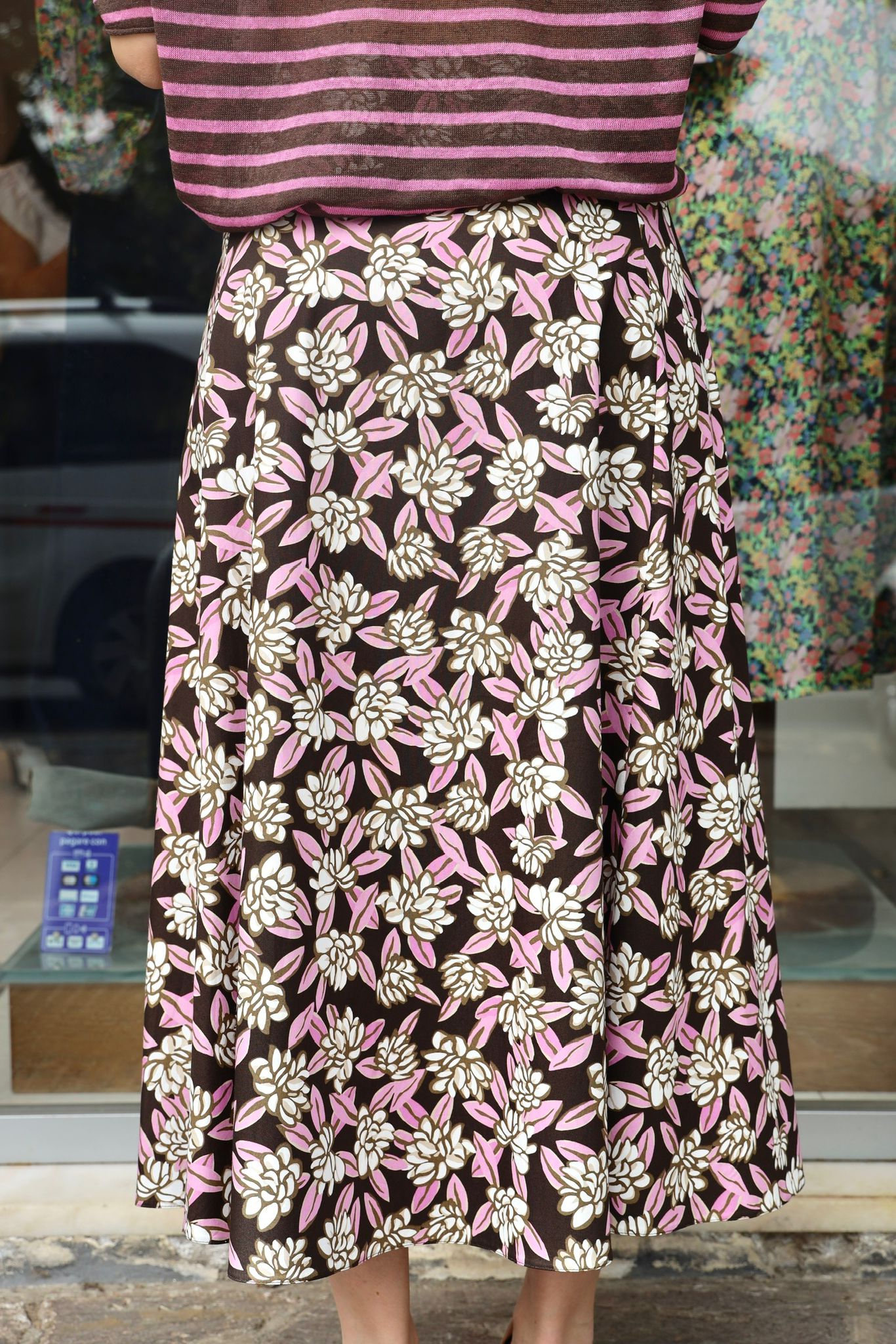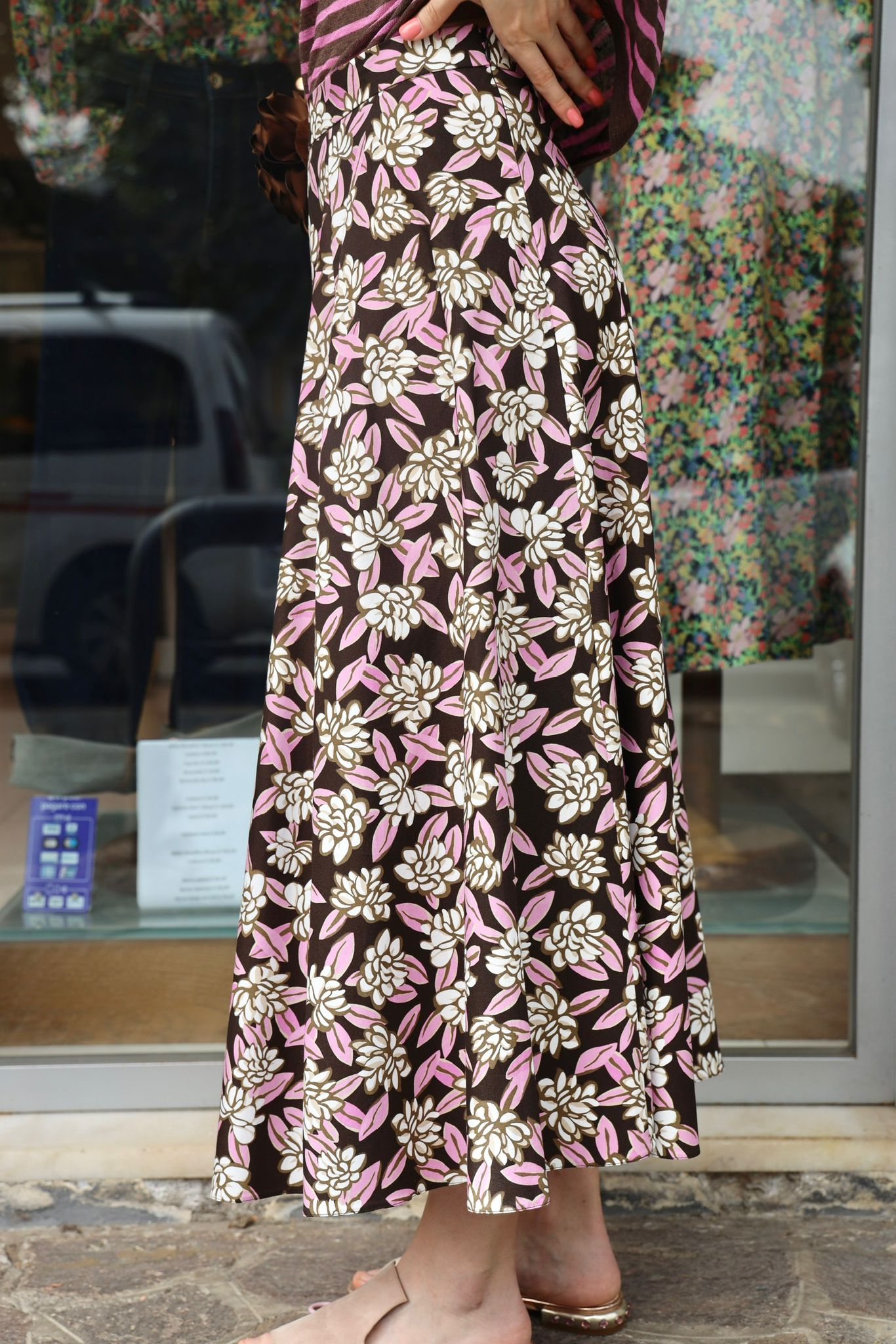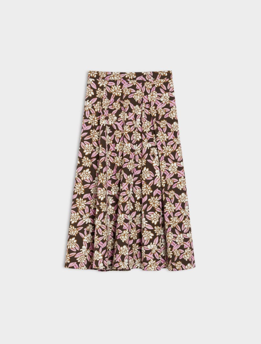 Gonna lunga in popeline di cotone stampato dalla linea svasata, chiusa con zip sul retro. Tessuto contenente cotone proveniente da una catena di fornitori impegnati in un’agricoltura a basso impatto ambientale.