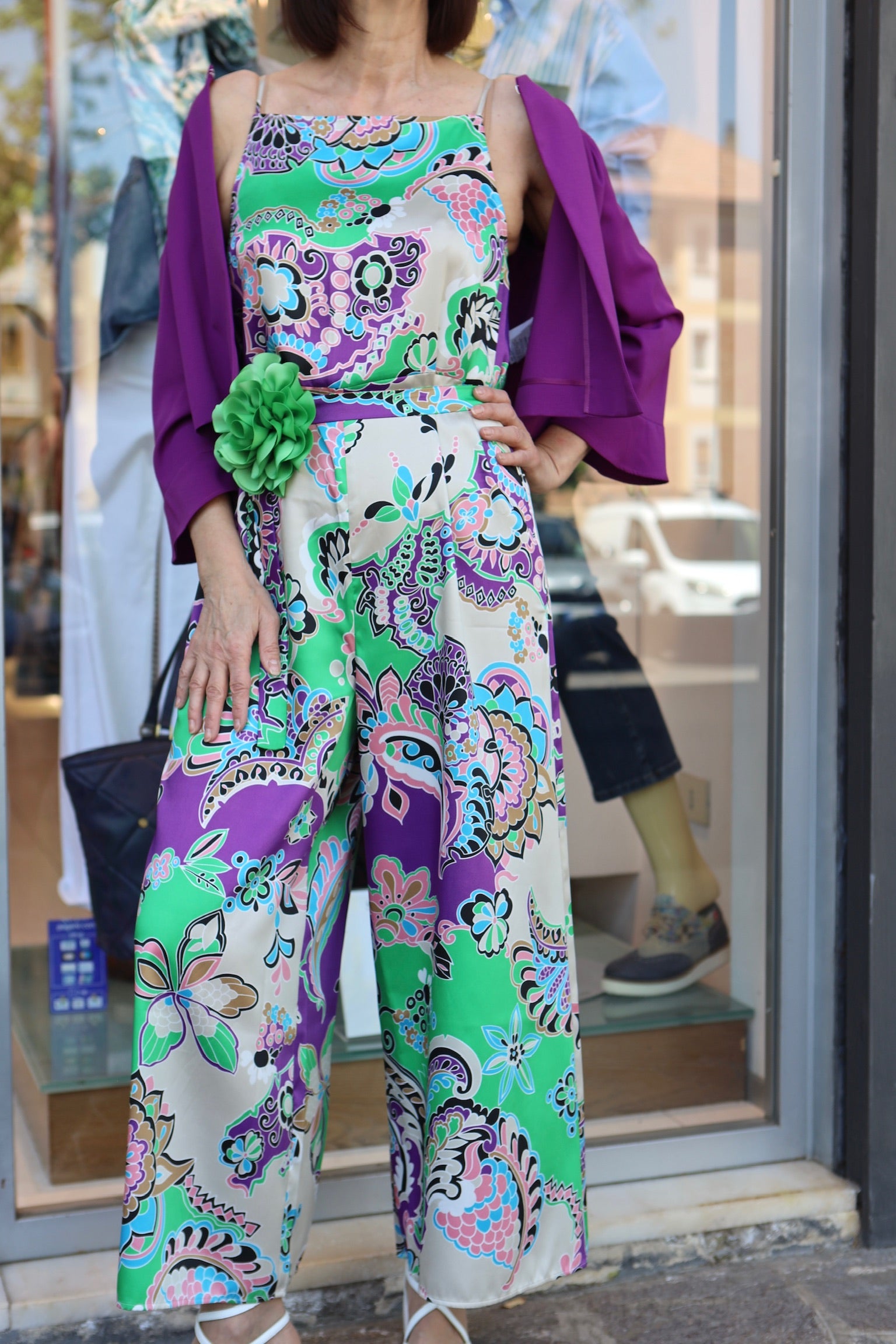 Linee lisce ed essenziali per un risultato finale dal design affascinante e audace. Tuta in twill fluido a fantasia
