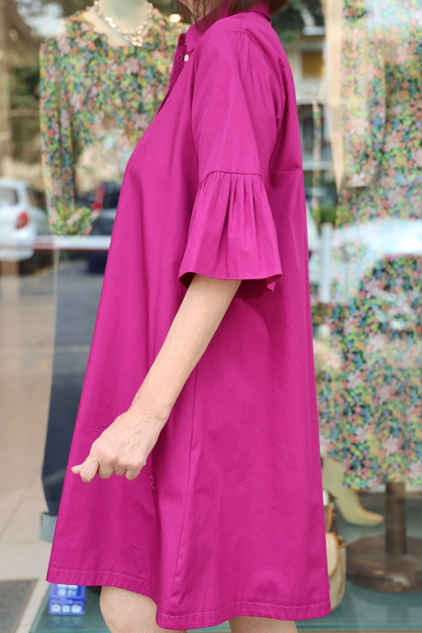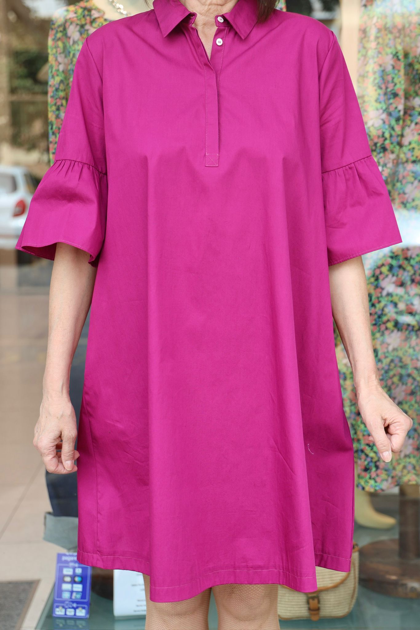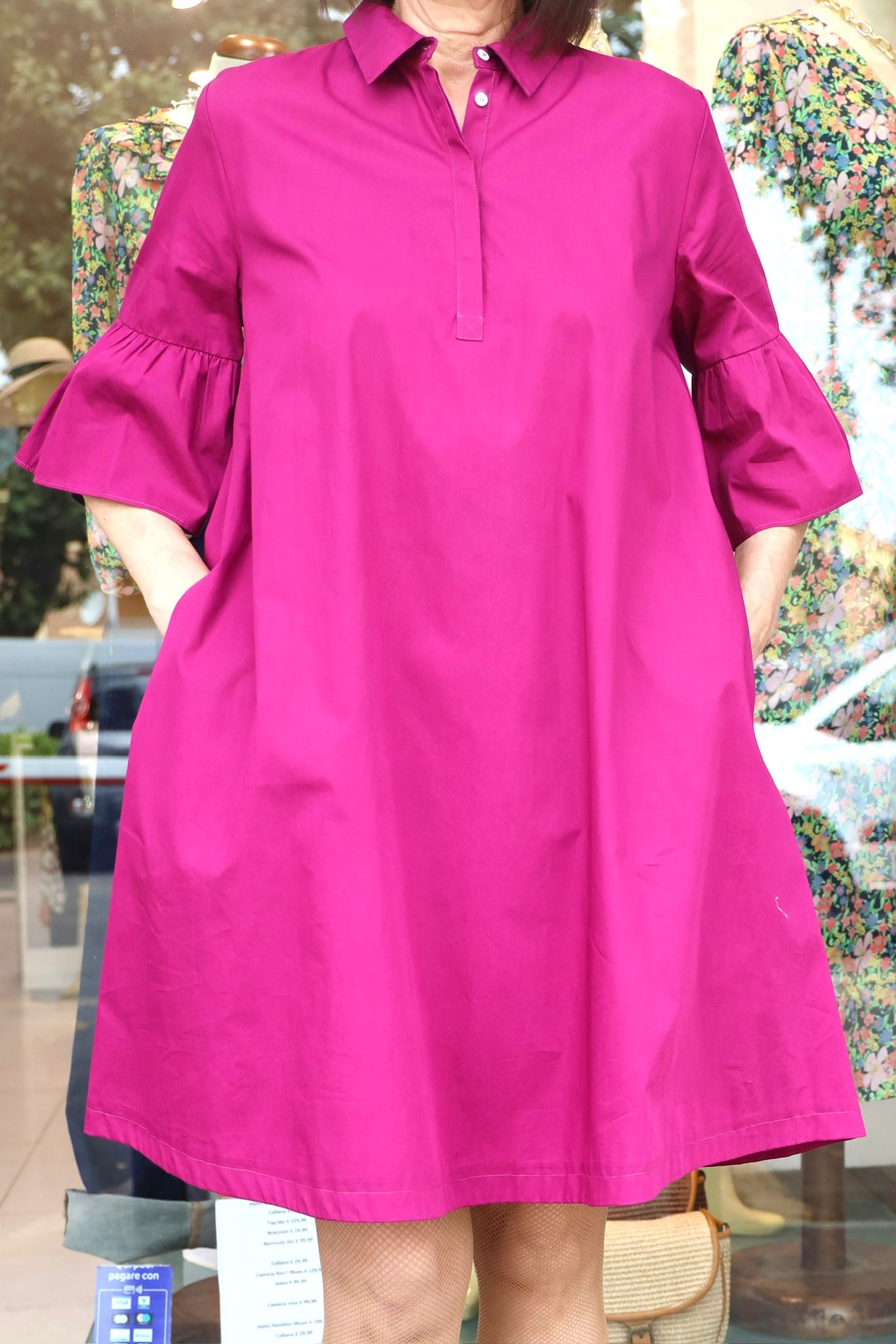 L immancabile abito al ginocchio questa stagione si rinnova con un gioco di righe nel colore di punta della stagione.