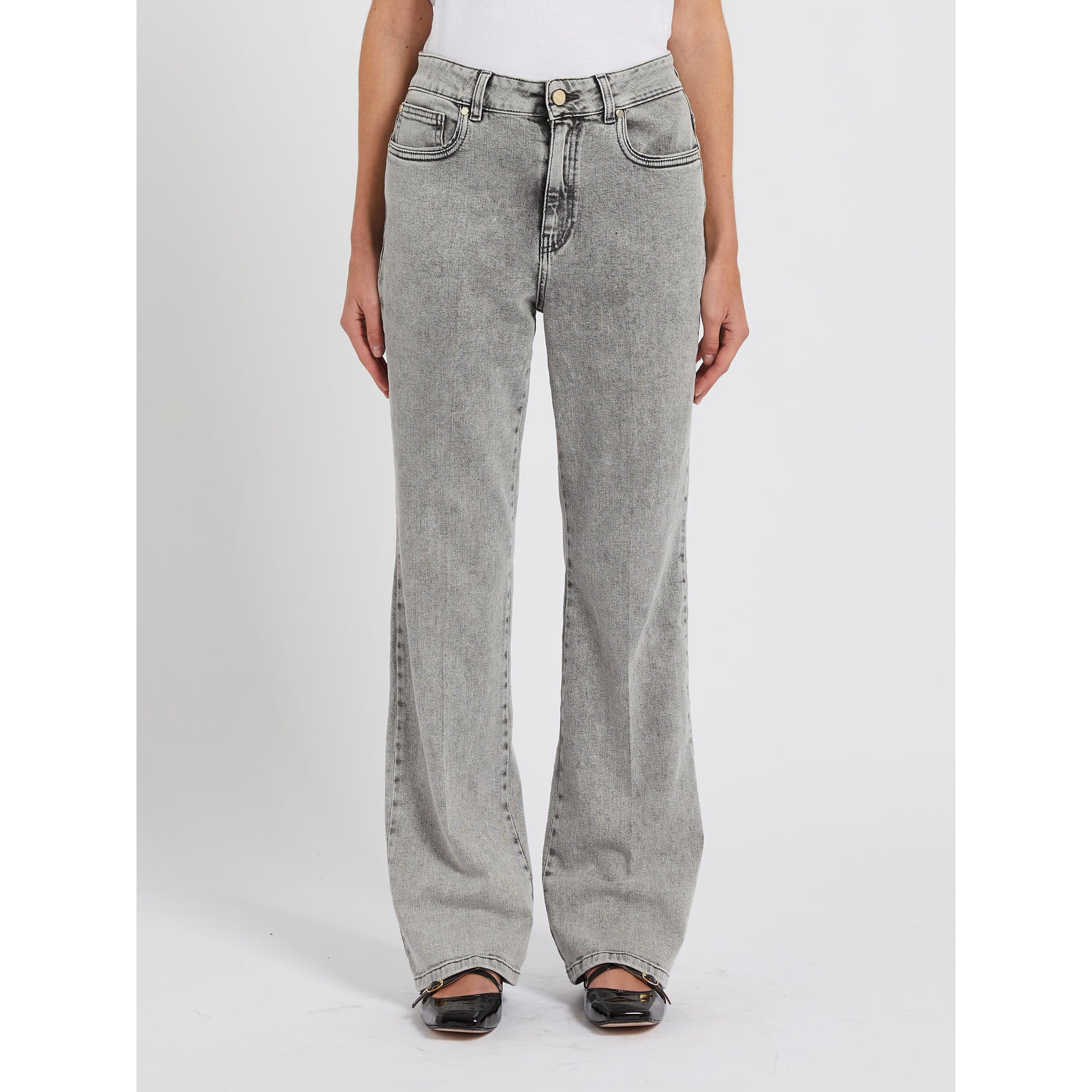 Jeans cinque tasche in denim stretch dalla linea bootcut, chiusi con bottone e zip nascosta. Piega stirata davanti e dietro.