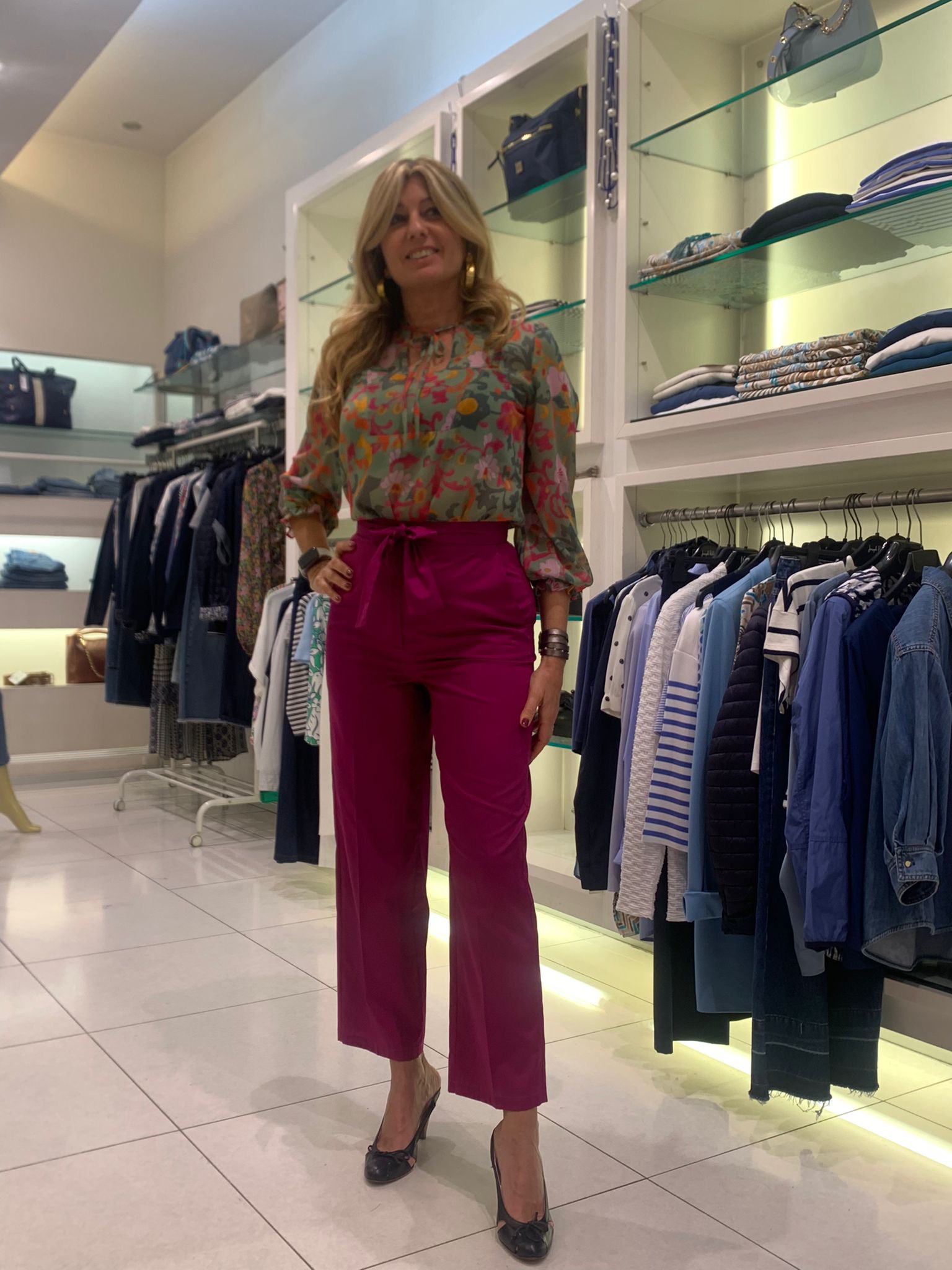 Pantaloni in popeline di cotone, linea straight leg con nodo in vita. Chiusura con bottone e zip nascosta.