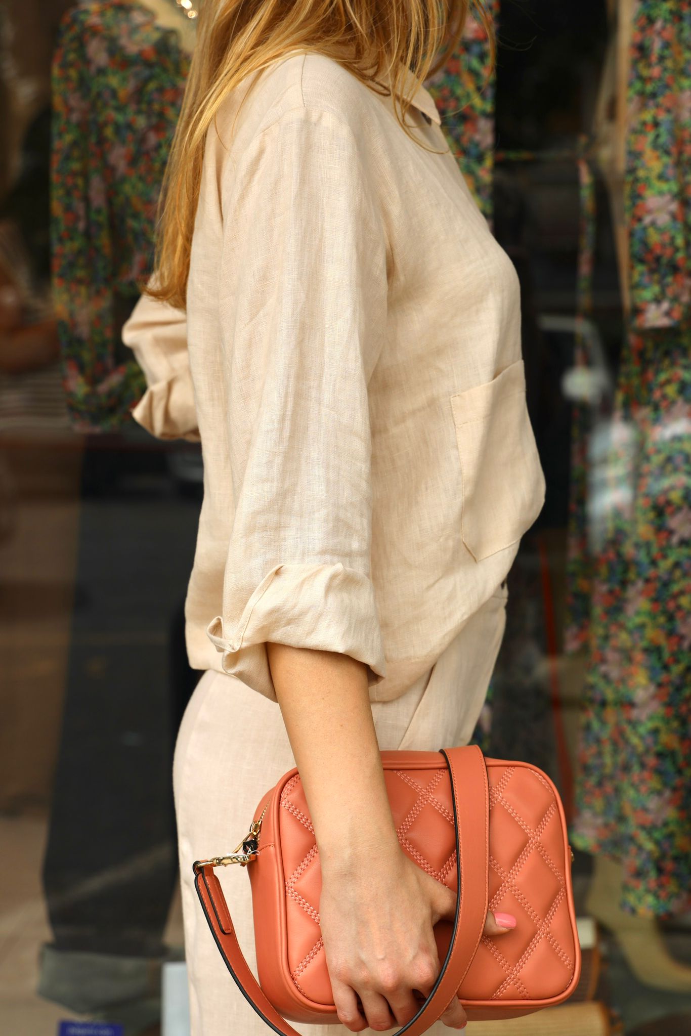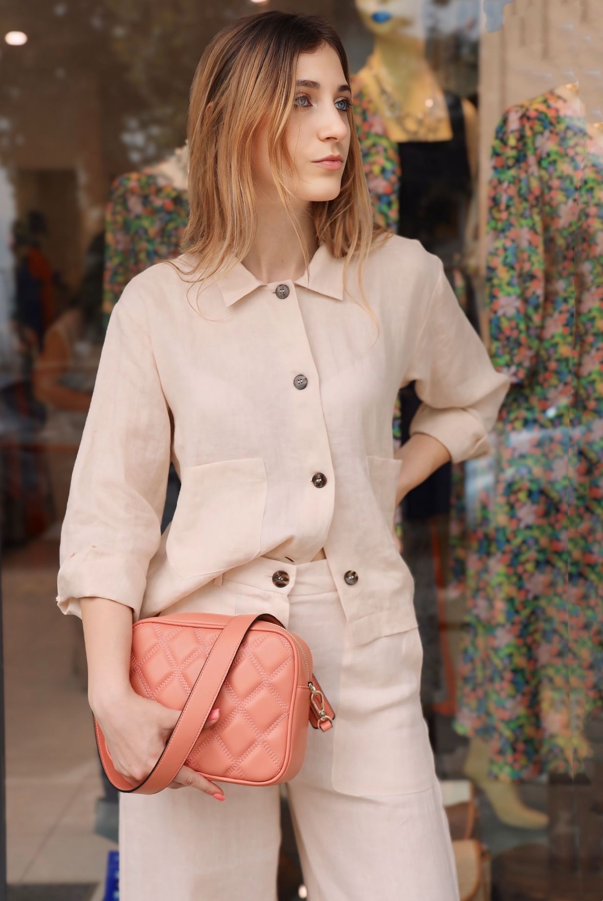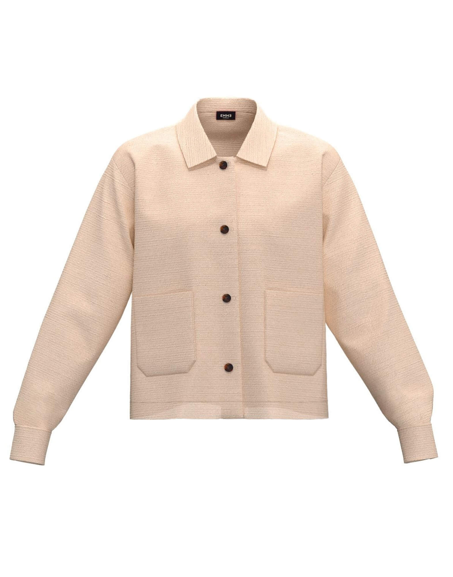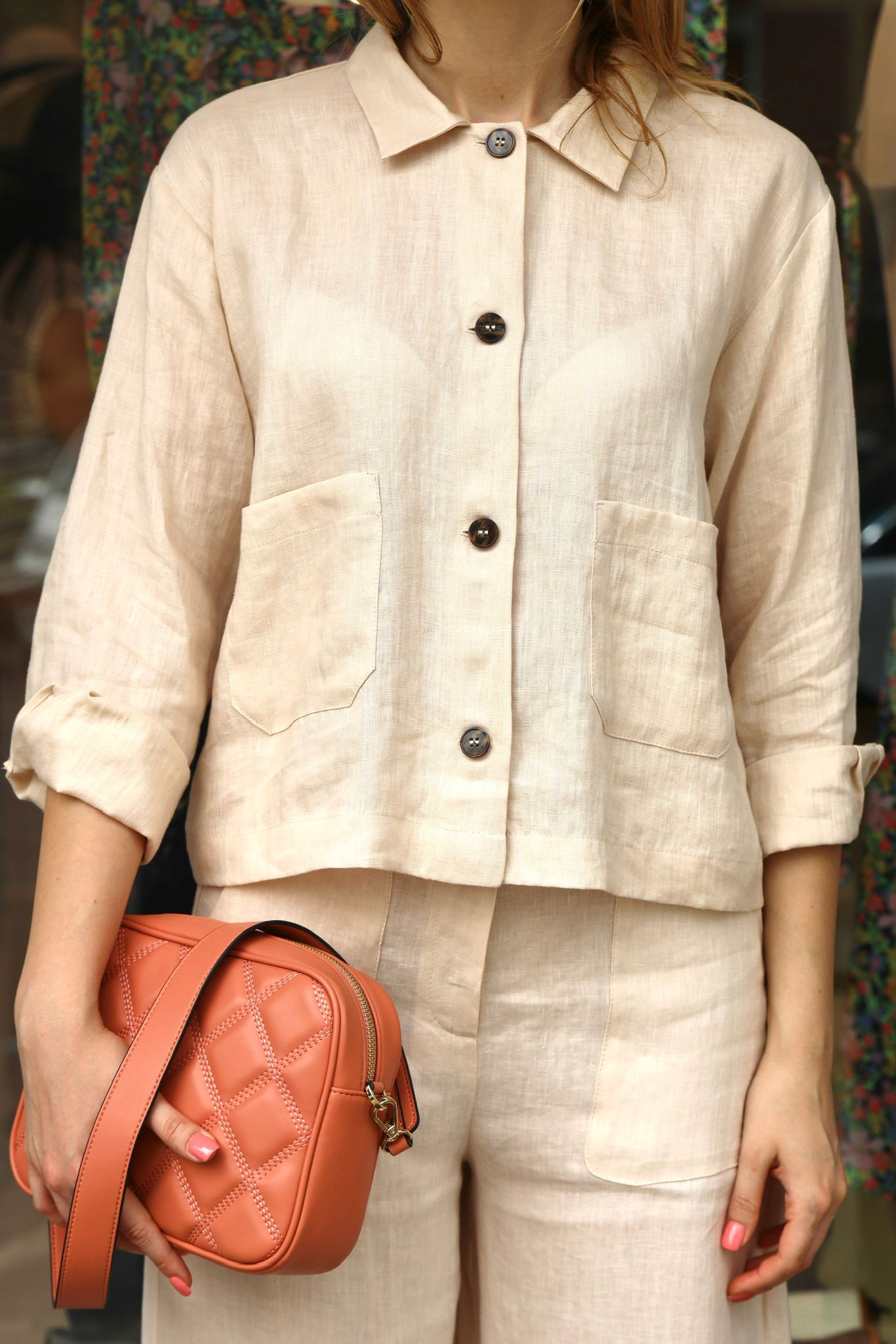 Giacca-camicia in lino, linea boxy. Collo a camicia, maniche lunghe con giro sceso e polsino. Chiusura con bottoni a vista, tasche applicate.
