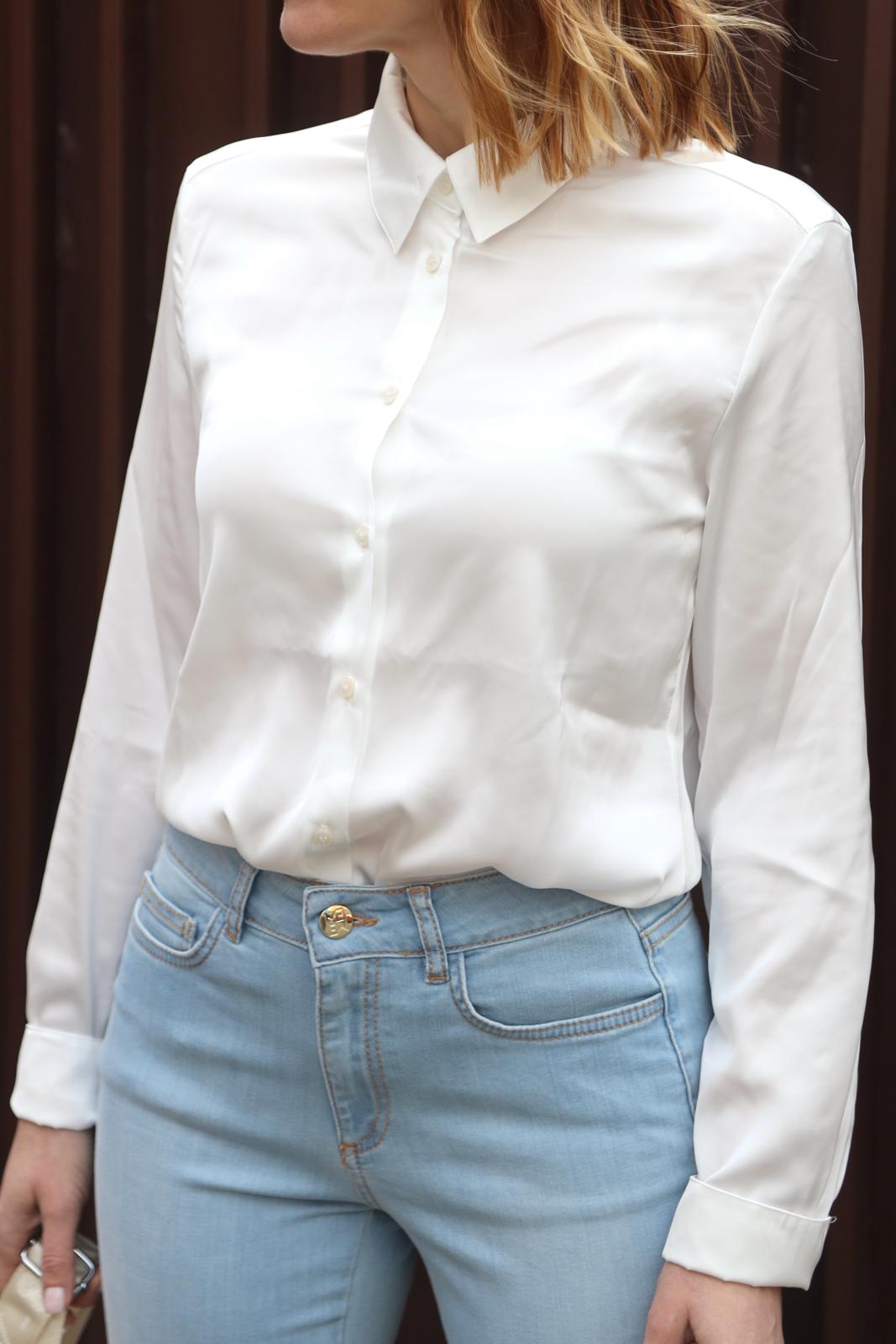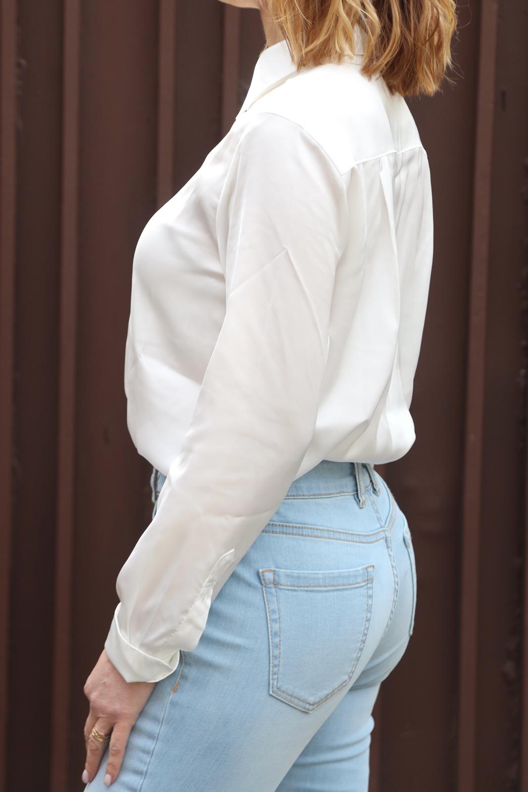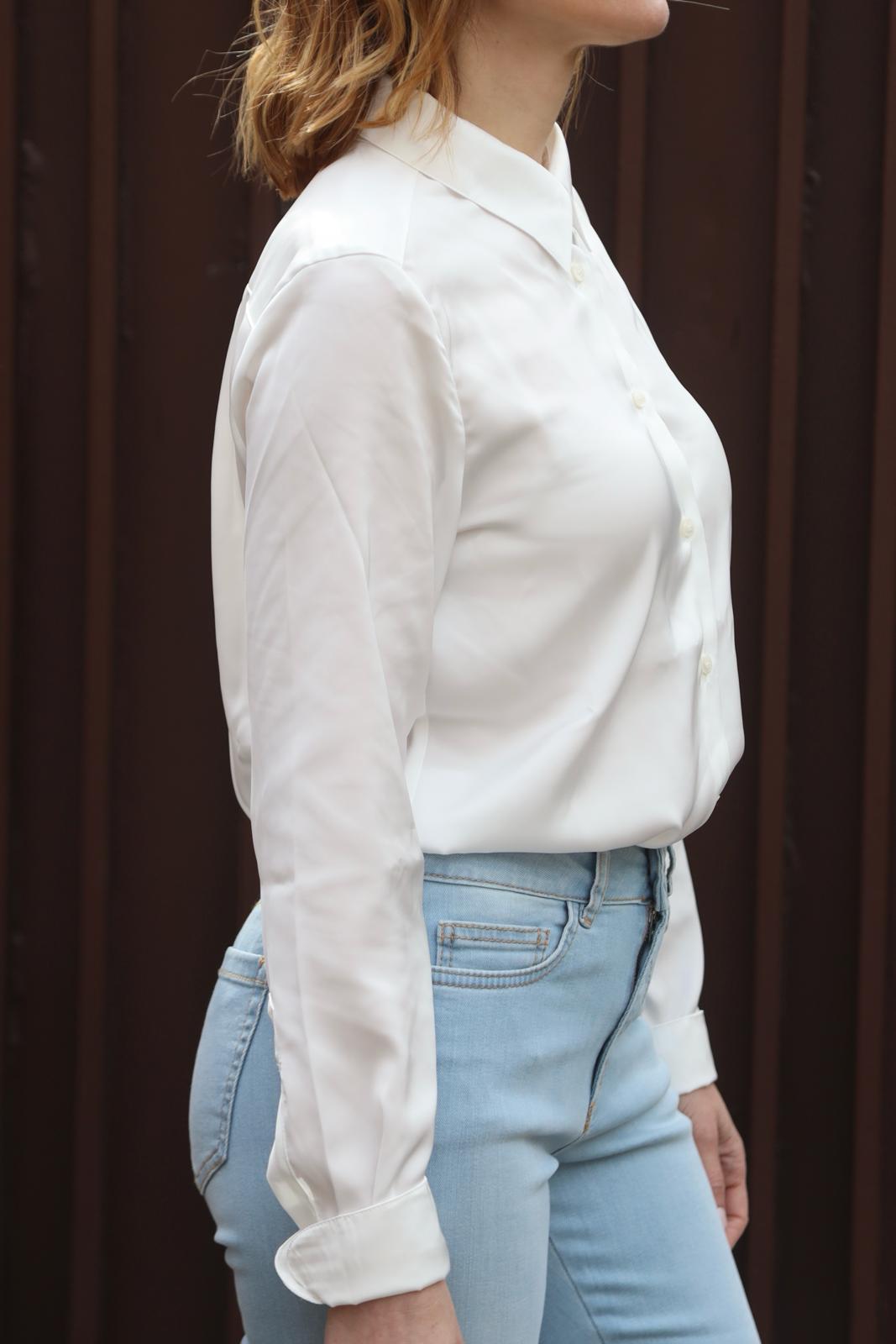 Camicia in morbido raso stretch dall allure moderna ed essenziale perfetta in qualsiasi occasione. La doppia pince sul retro dona movimento al capo.