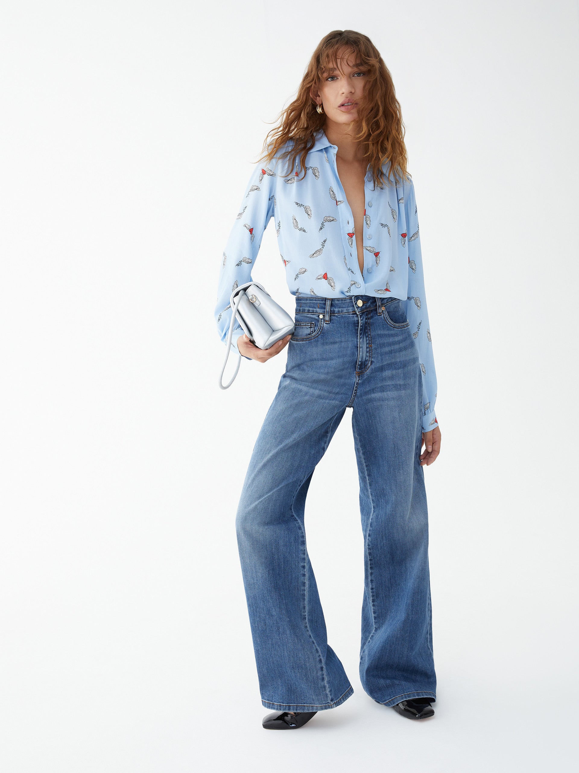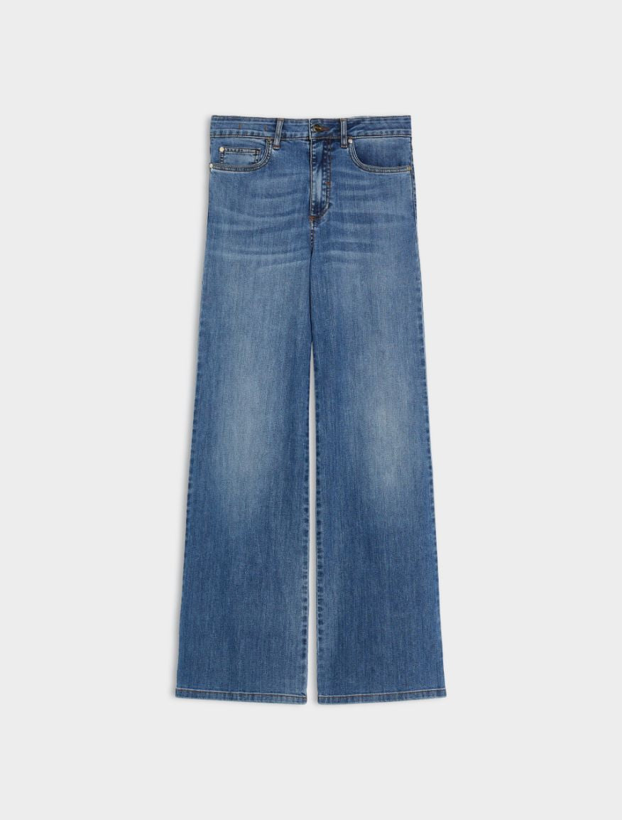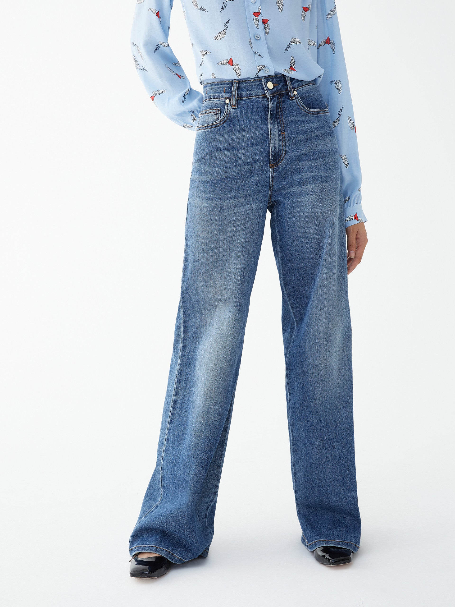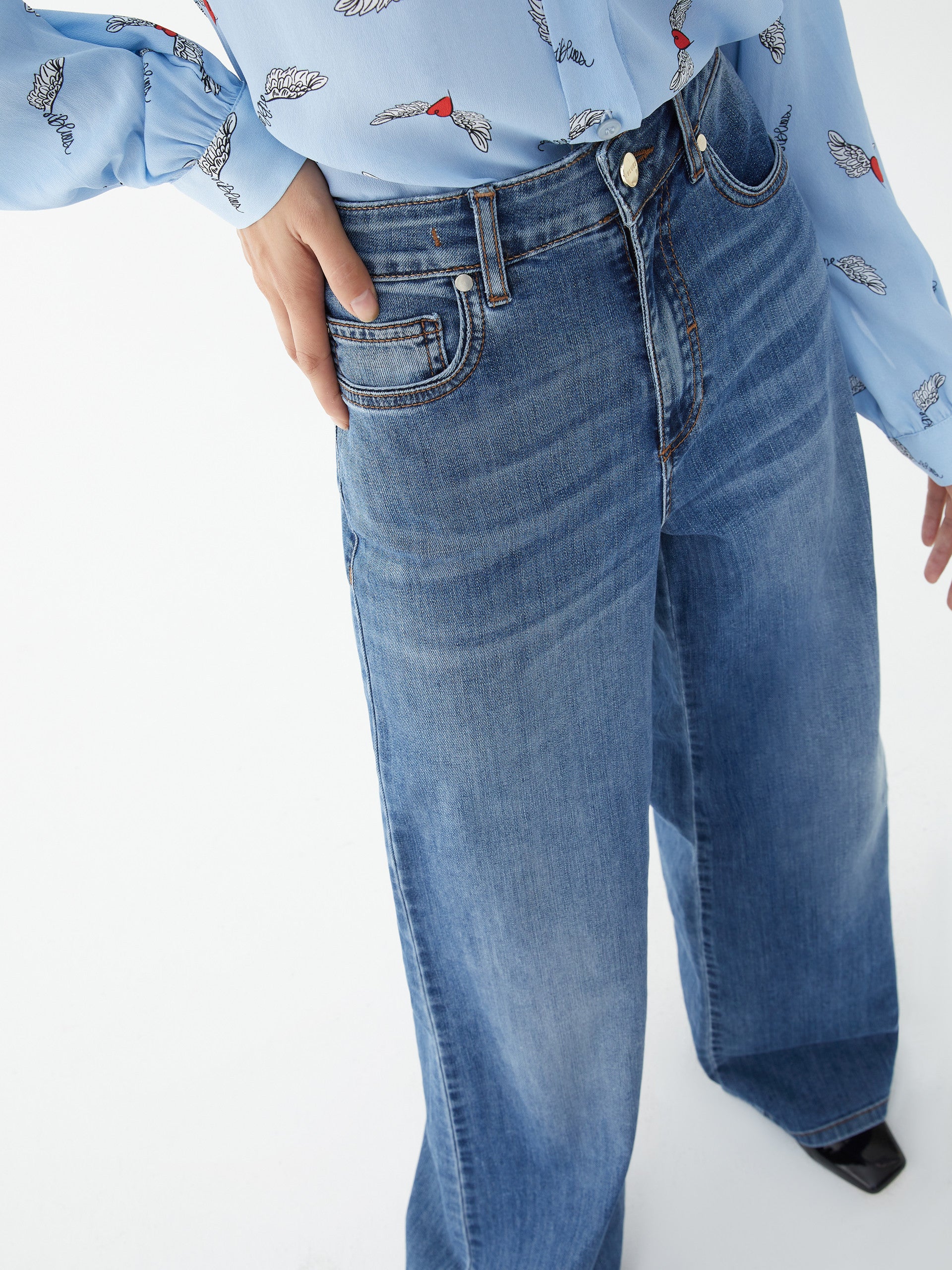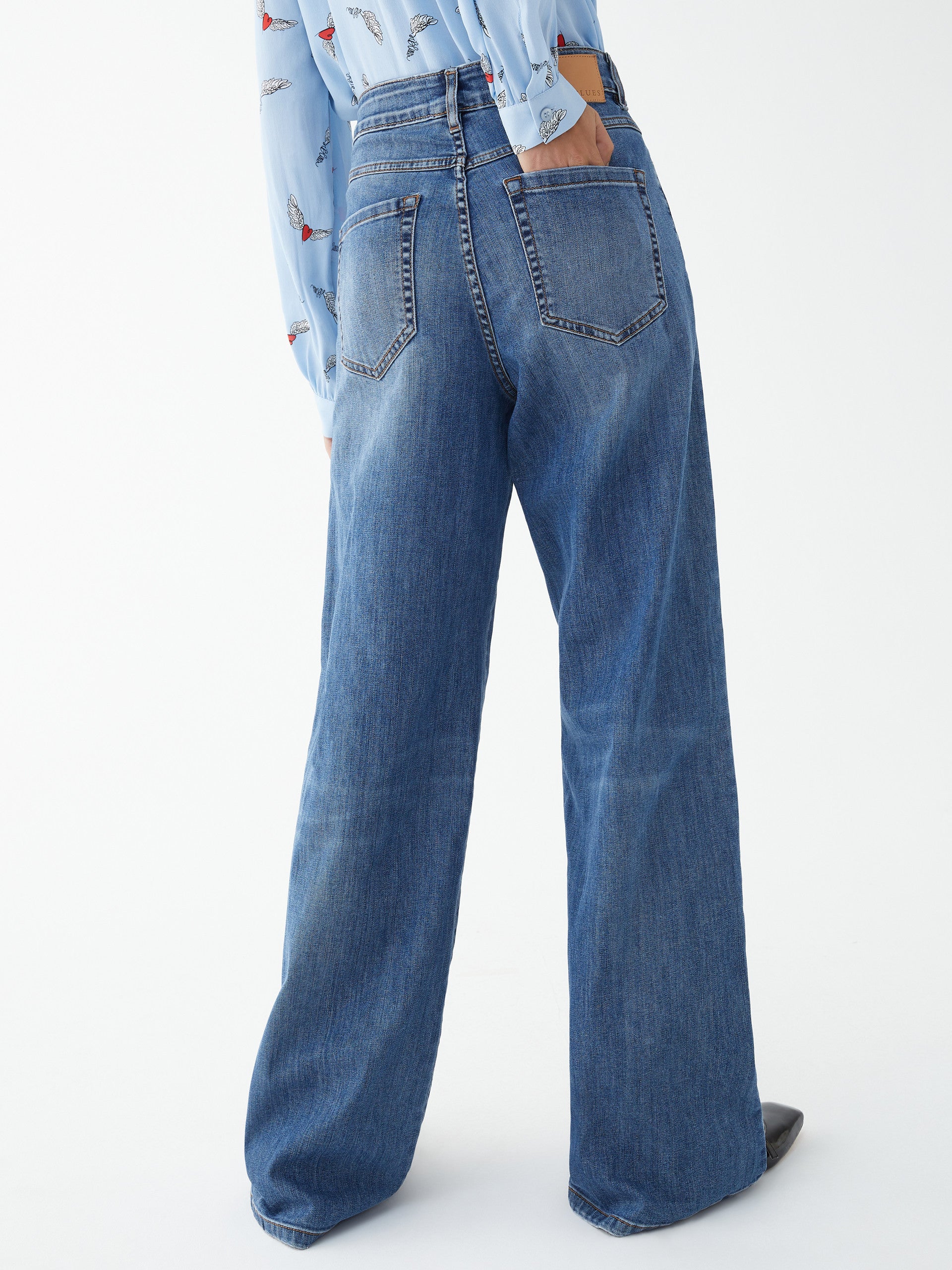 Jeans cinquE tasche in denim di cotone stretch dalla linea ampia wide leg, chiusi con bottone e zip nascosta. Il cotone che compone questo tessuto proviene da una catena di fornitori impegnati in un’agricoltura a basso impatto ambientale. La tintura è ottenuta con tecnologia Indigo Flow, una tintura superficiale che consente di trattare il capo finito con un ridotto consumo di acqua.